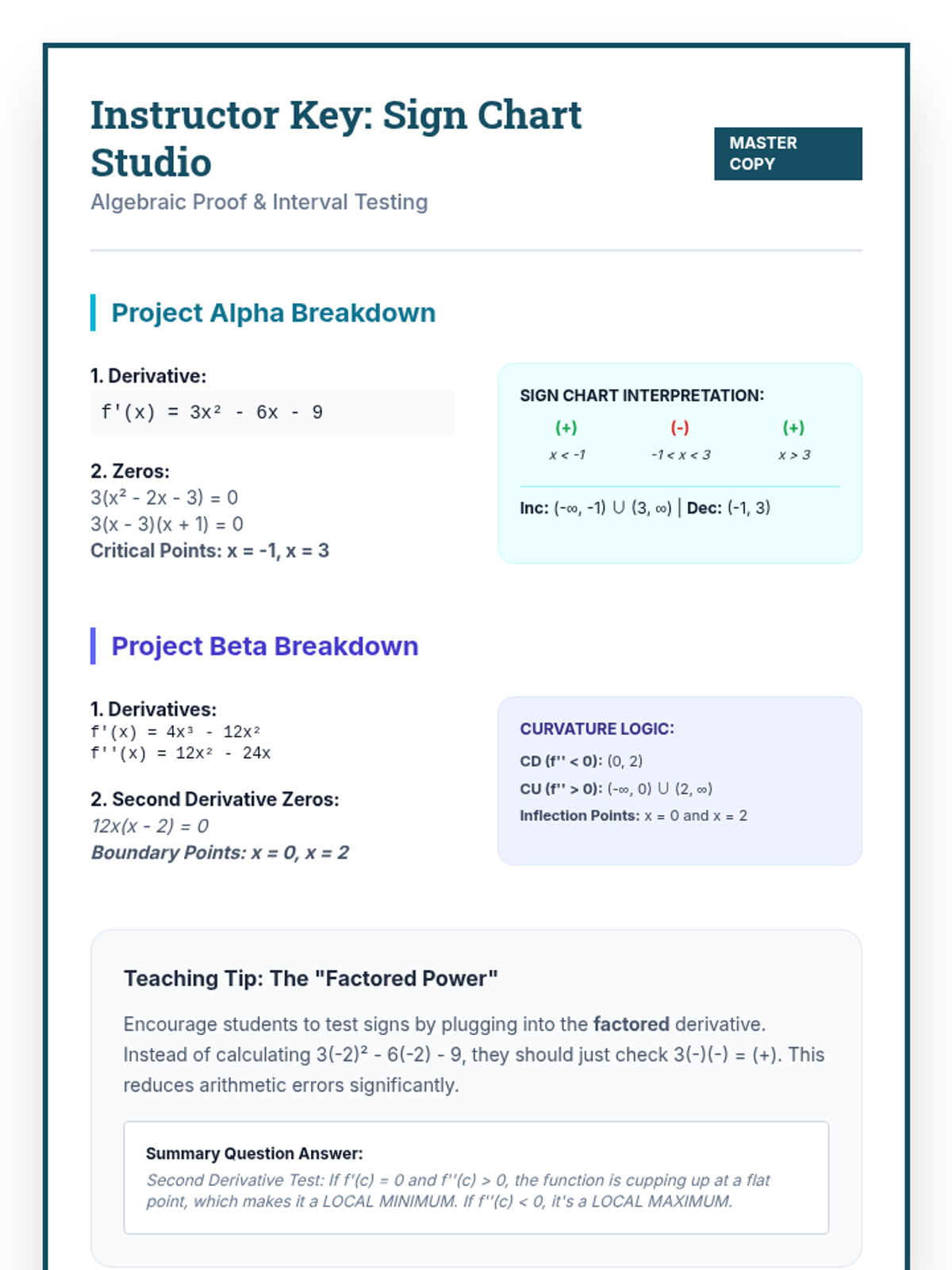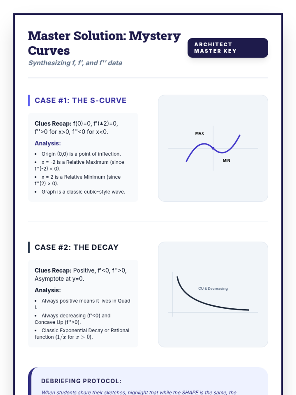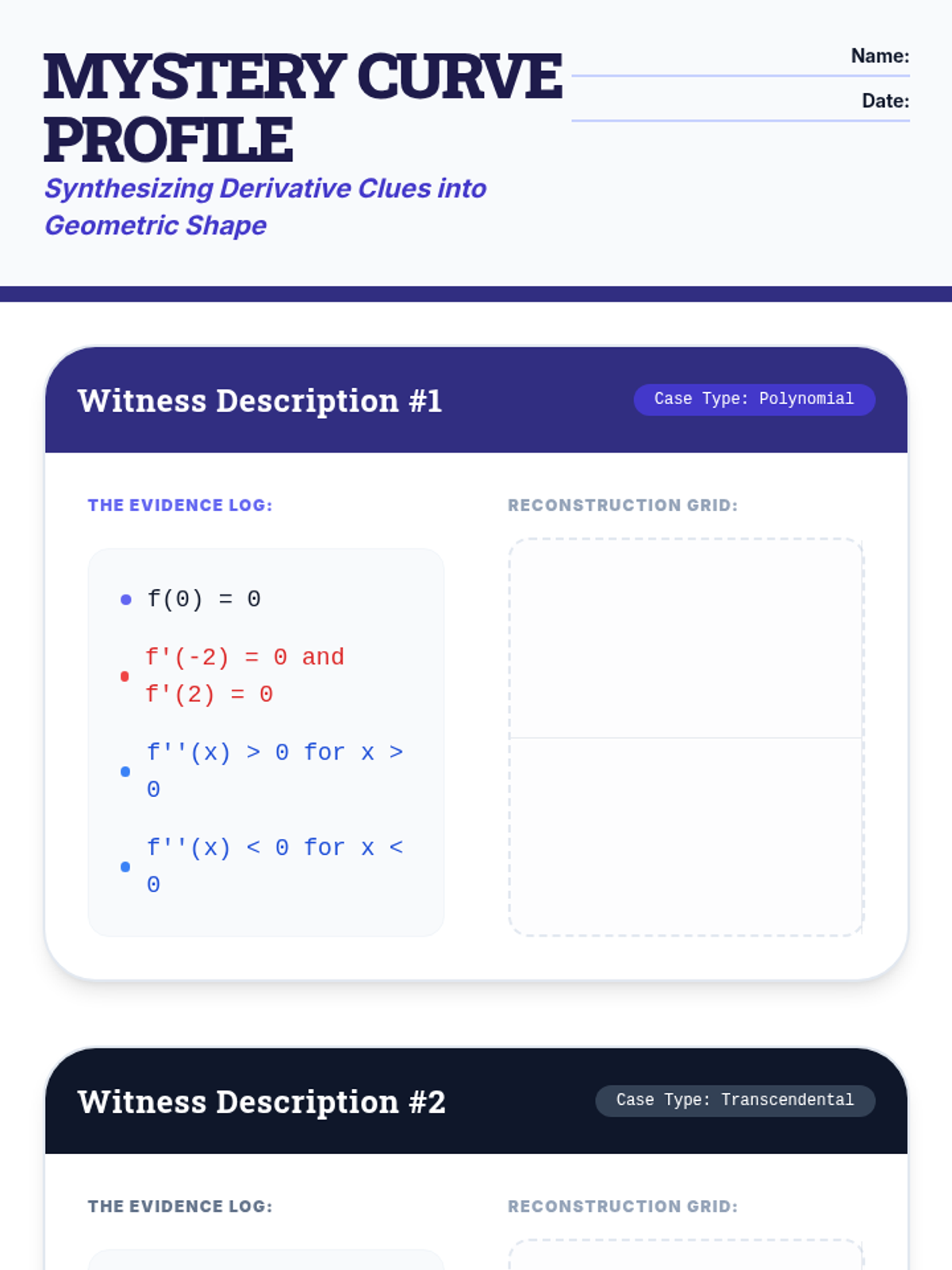 An inquiry-based exploration of the geometric relationships between functions and their derivatives. Students progress from visual observation of slope and concavity to algebraic analysis using sign charts, culminating in the ability to sketch complex curves from derivative data.