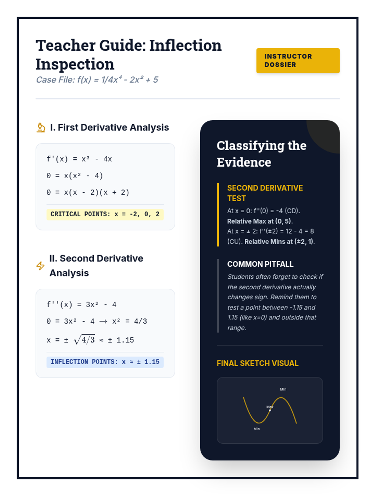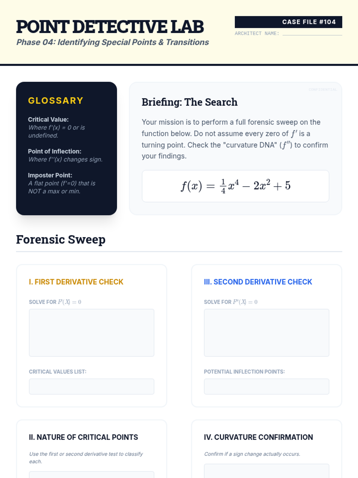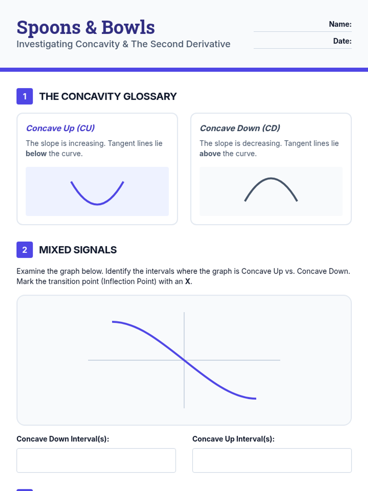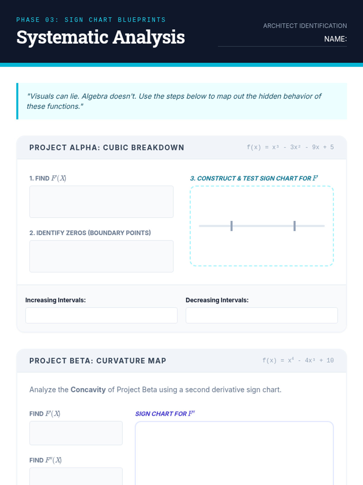 An inquiry-based exploration of the geometric relationships between functions and their derivatives. Students progress from visual observation of slope and concavity to algebraic analysis using sign charts, culminating in the ability to sketch complex curves from derivative data.