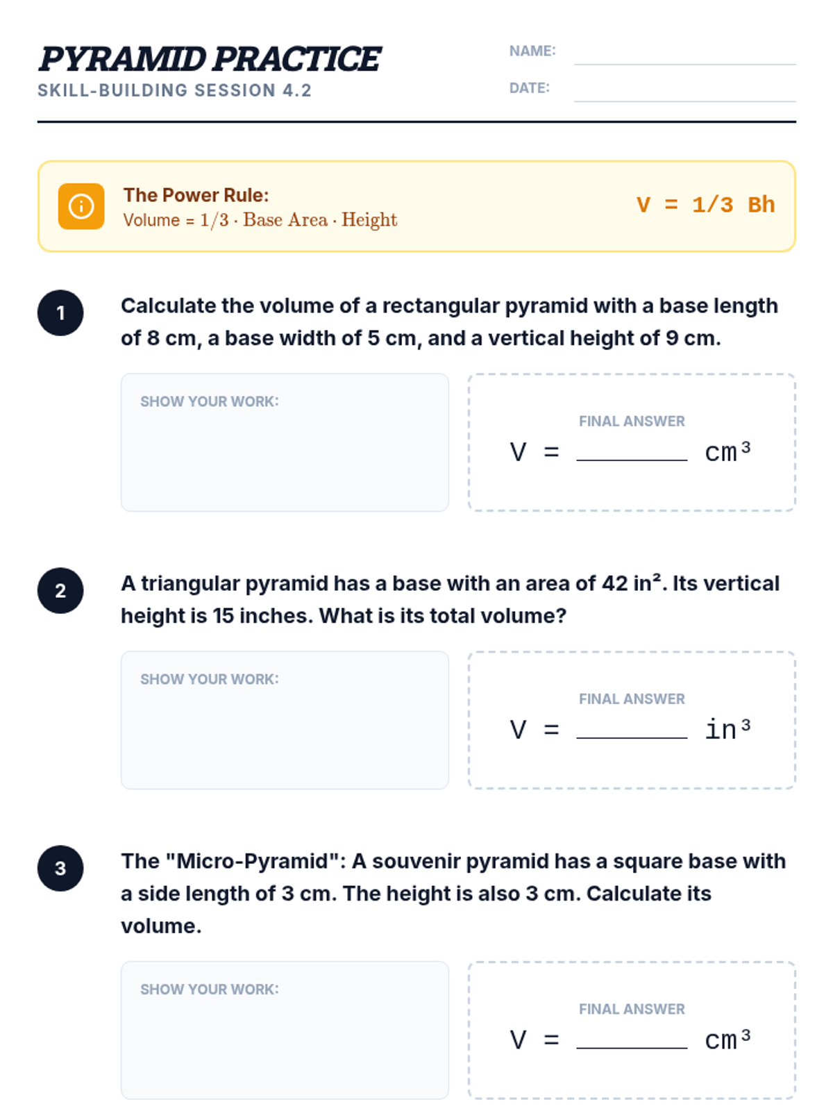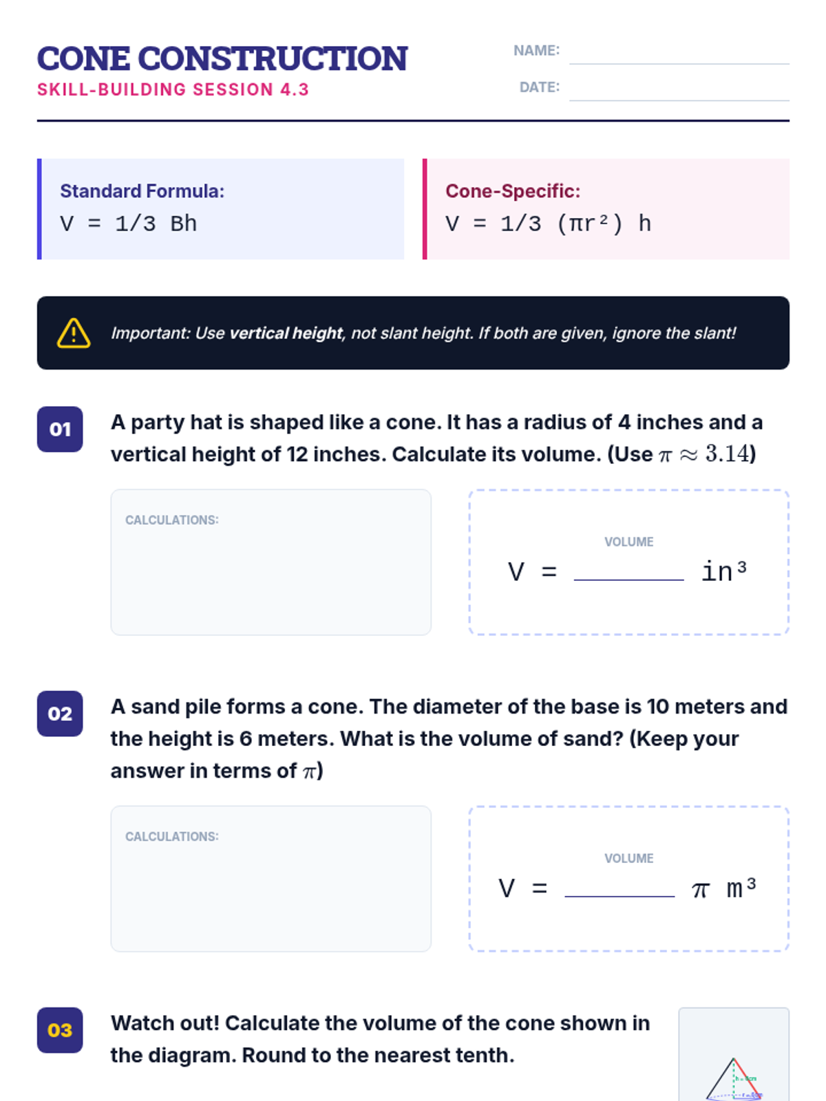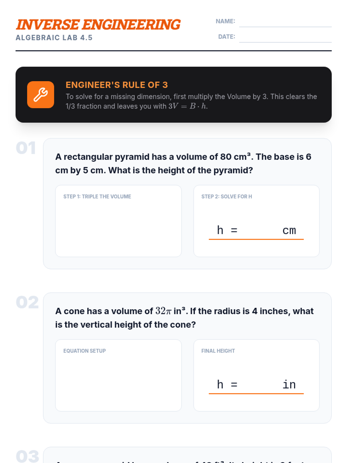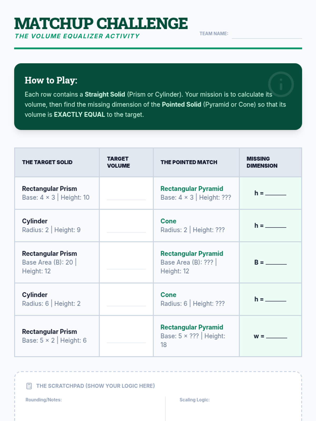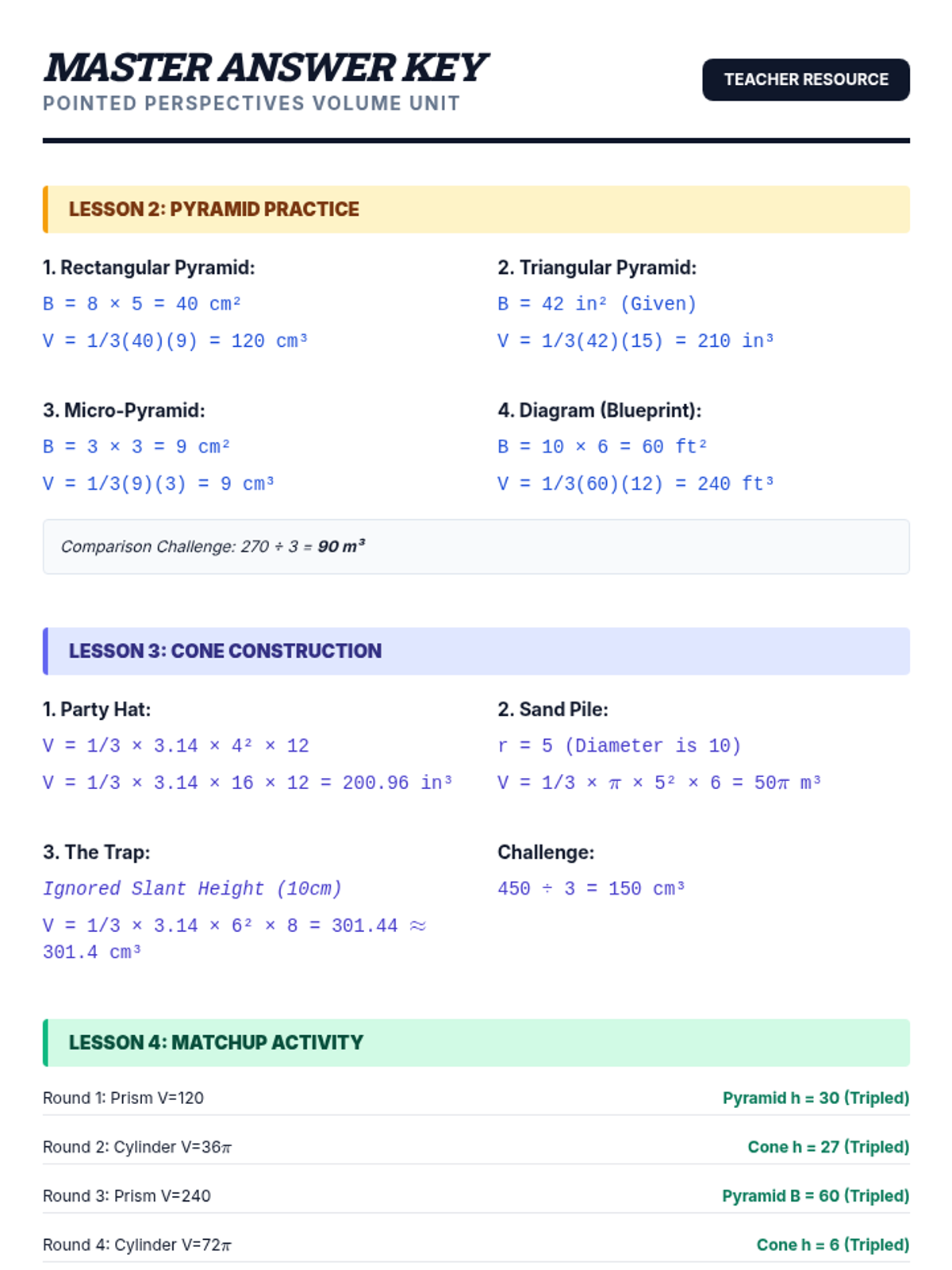 A 7th-grade geometry unit exploring the conceptual and mathematical relationship between prisms/cylinders and pyramids/cones, emphasizing the 1/3 volume ratio through discovery and application.