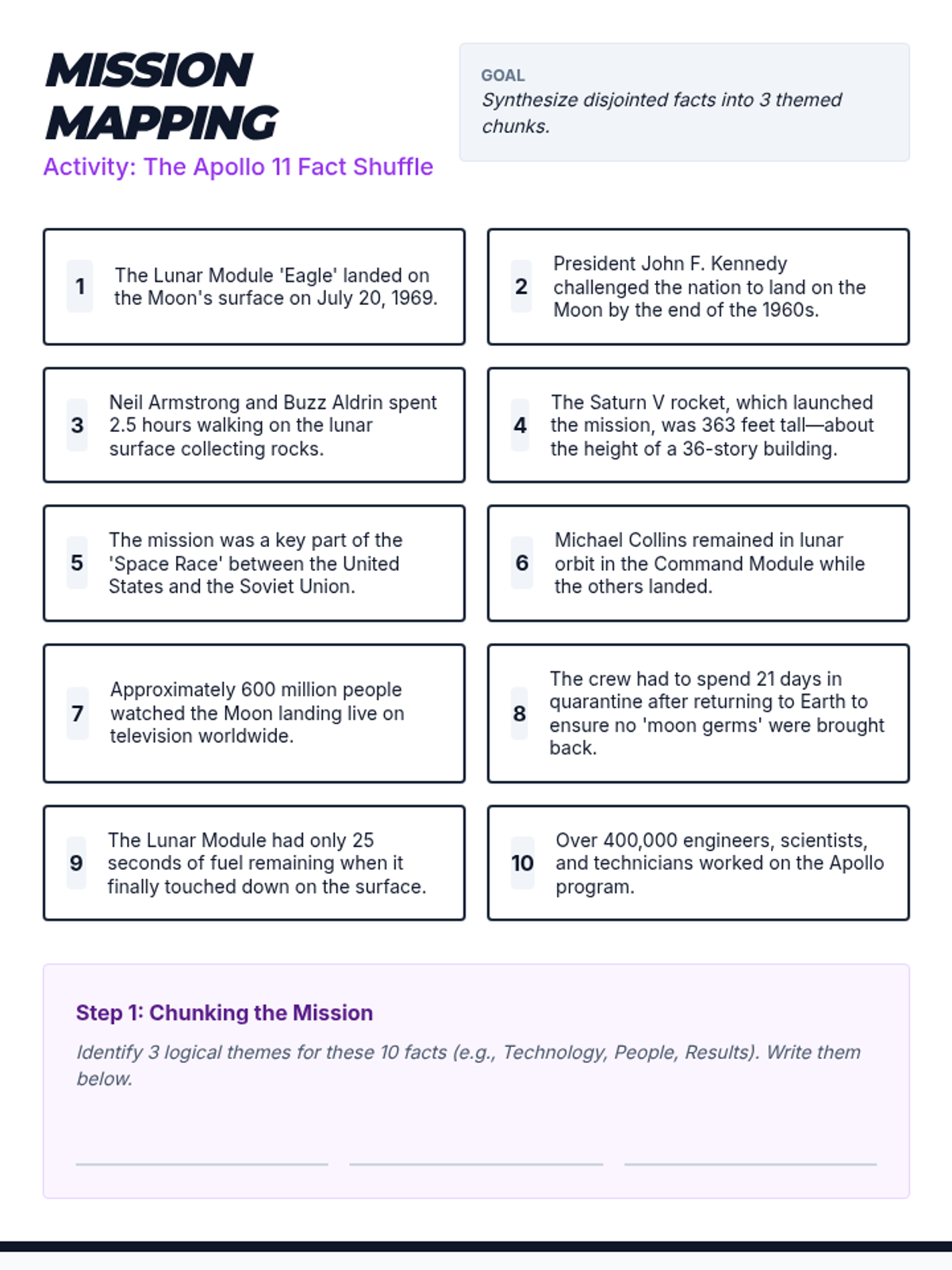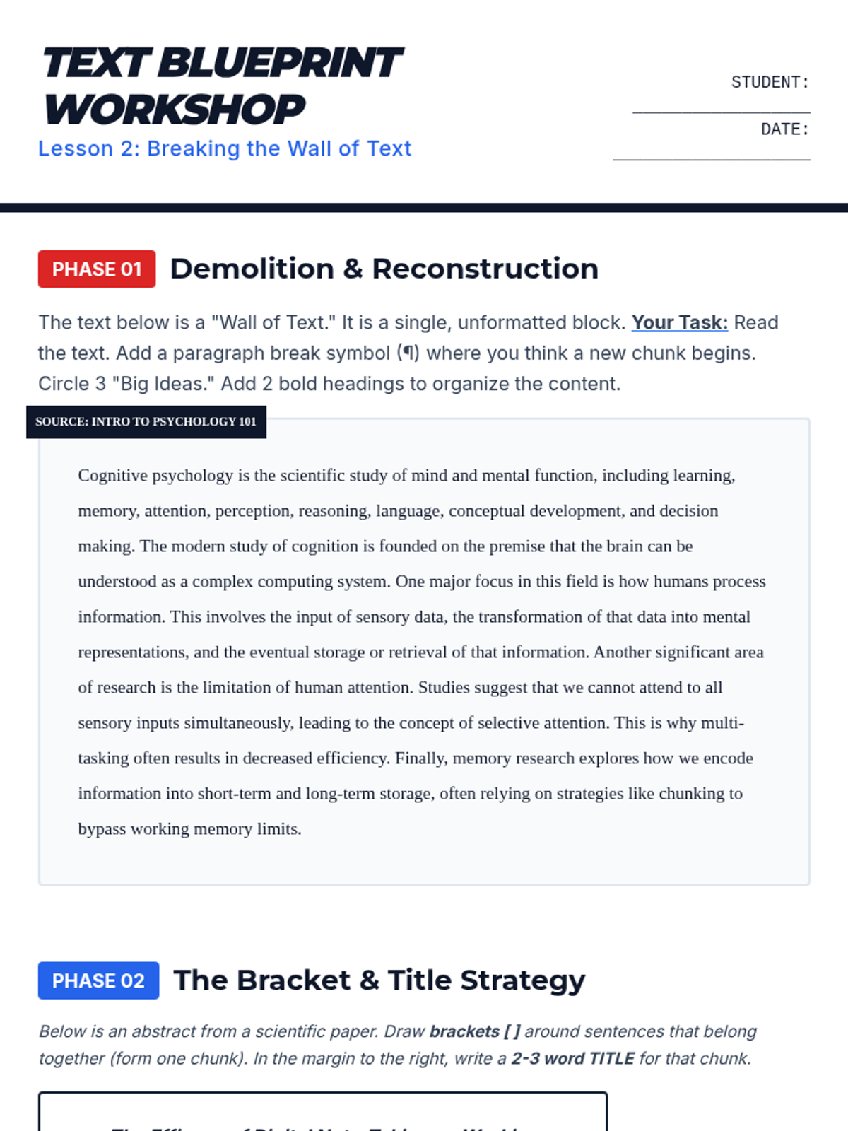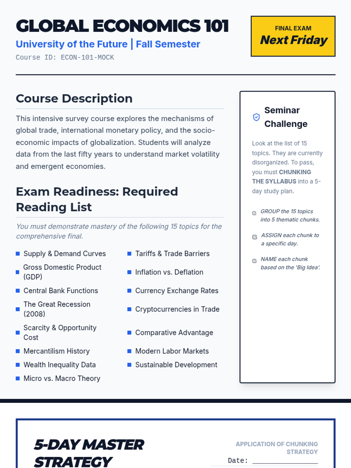 A specialized sequence for 12th-grade students to master cognitive chunking strategies, preparing them for the rigors of college-level reading and lectures by improving working memory efficiency.