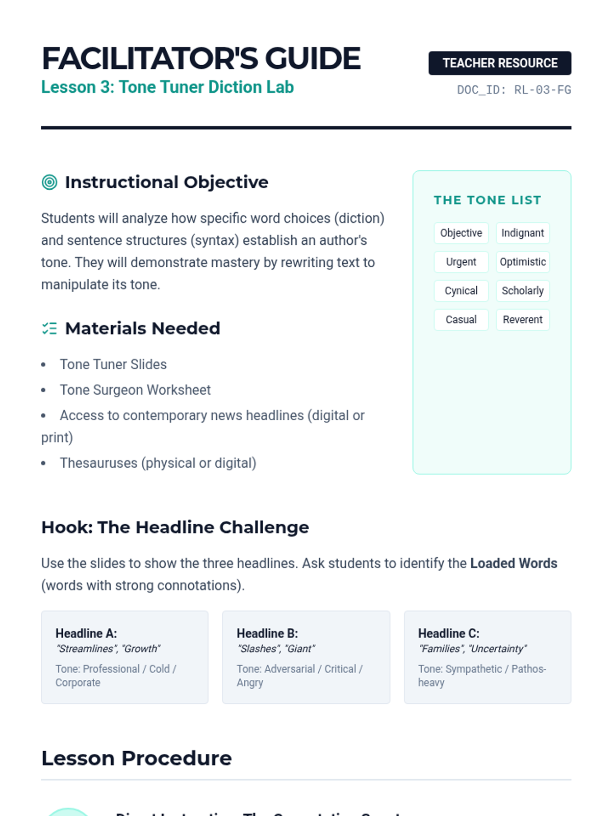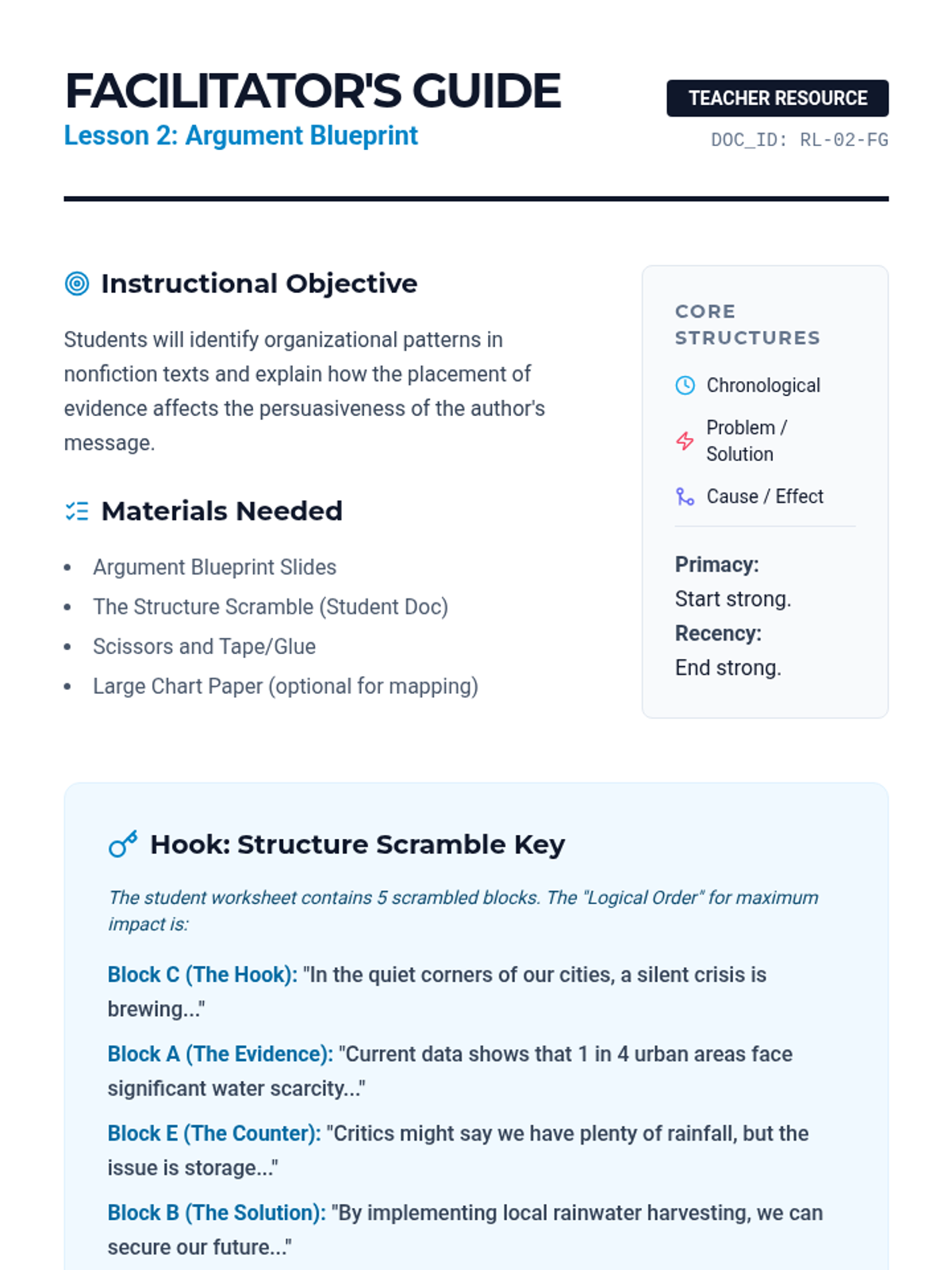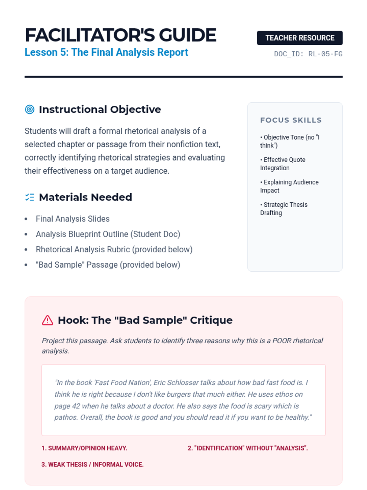 This 10th Grade ELA sequence guides students through the deconstruction of argumentative nonfiction. Students will move from identifying the core components of the rhetorical triangle to analyzing structural choices, tone, and logical integrity, culminating in a formal rhetorical analysis essay.