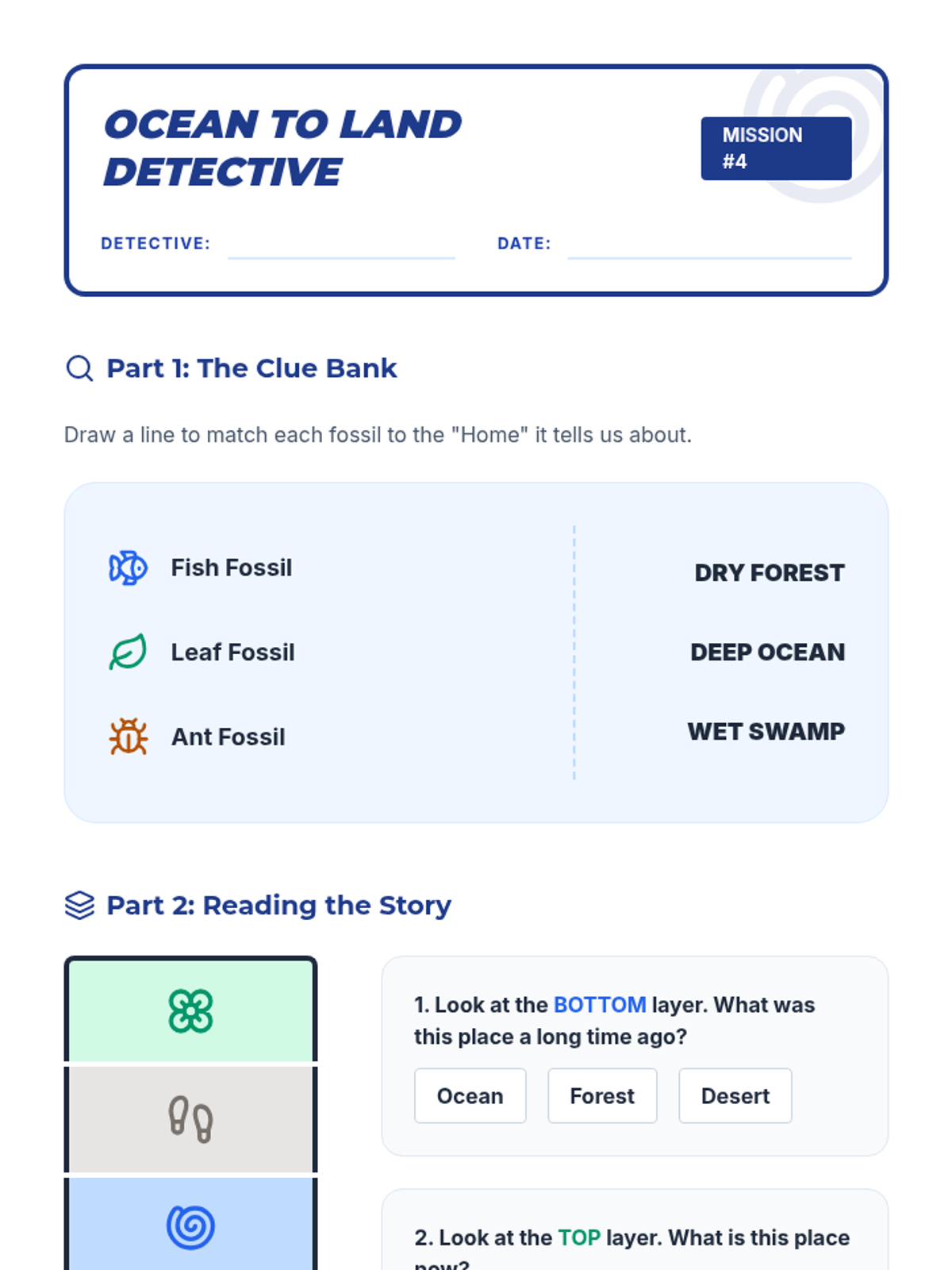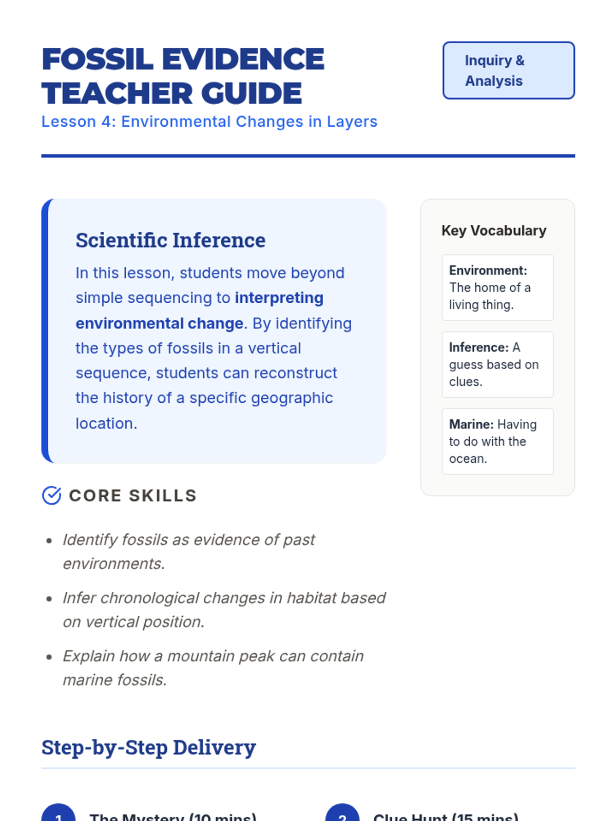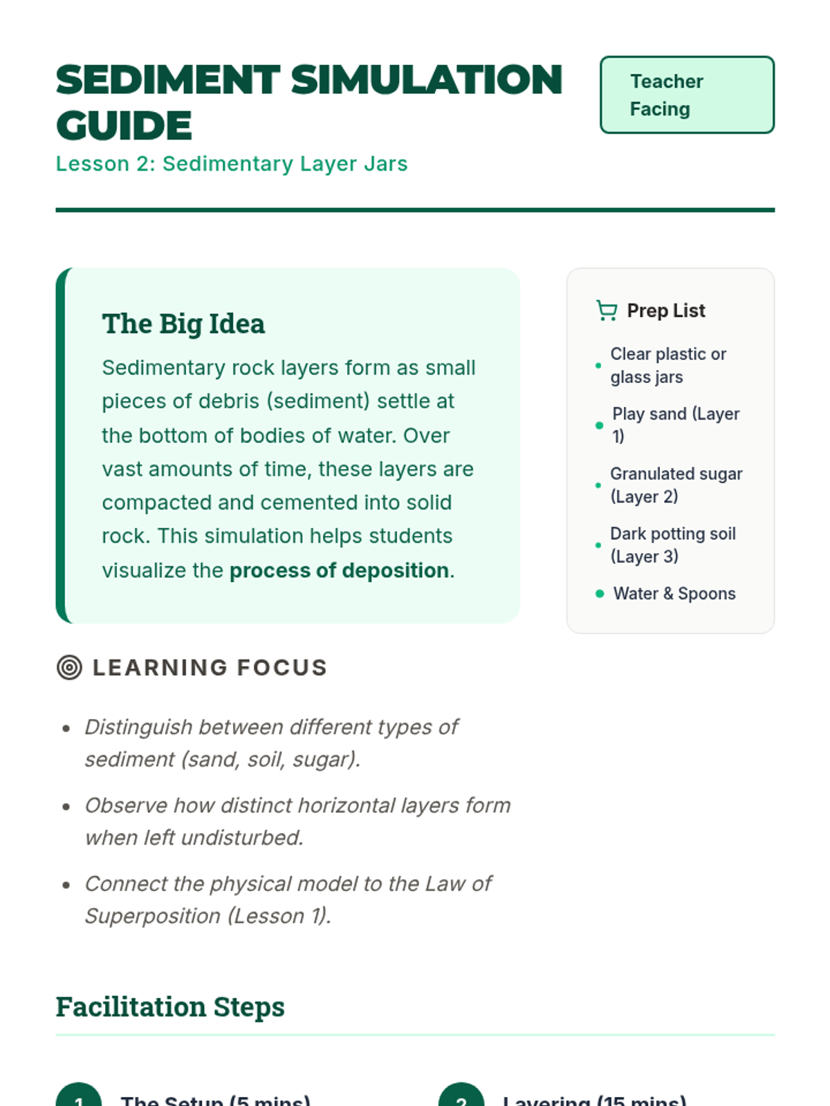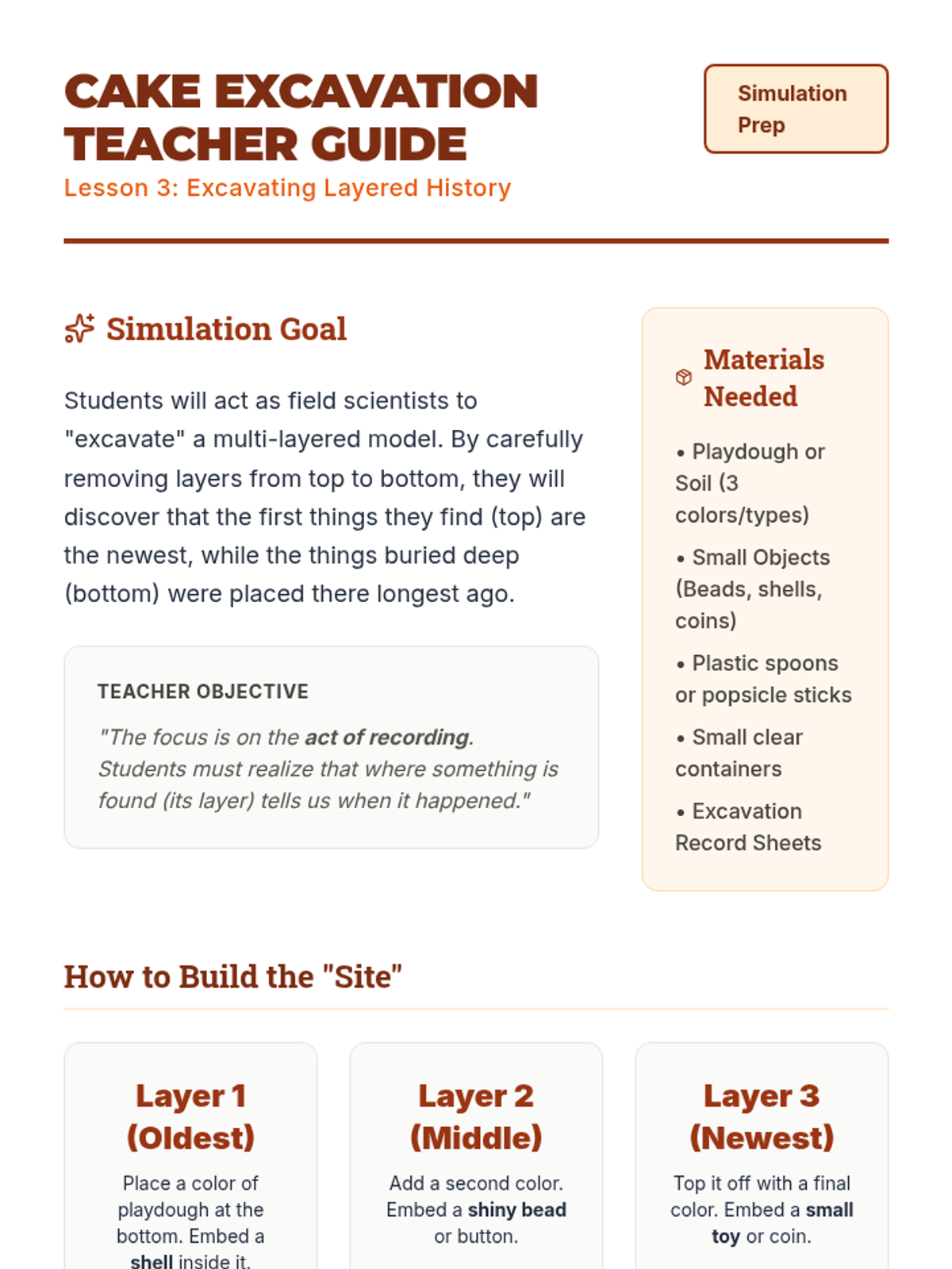 Students explore the concept of stratigraphy and geologic time through the lens of 'layers,' using concrete analogies to understand that lower rock layers are generally older. The sequence moves from simple ordering tasks to interpreting environmental changes and constructing a vertical timeline of Earth's history.