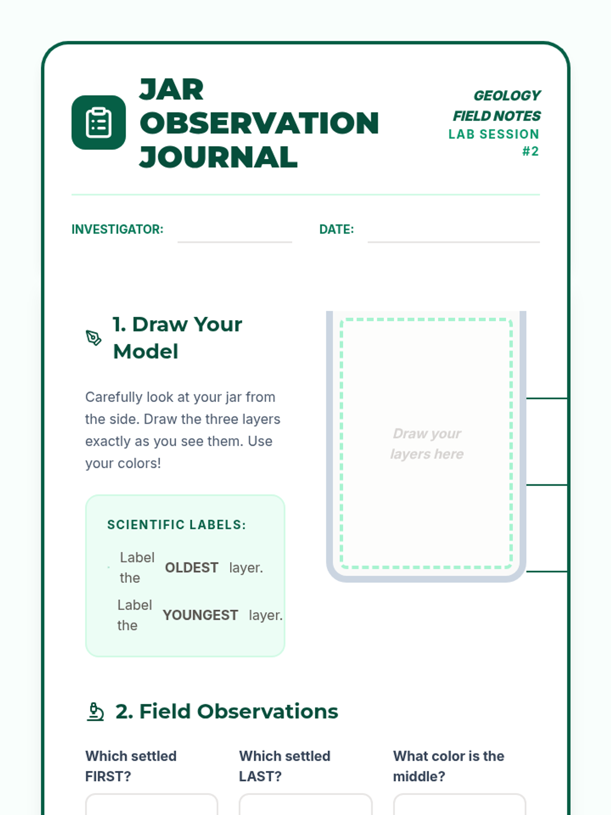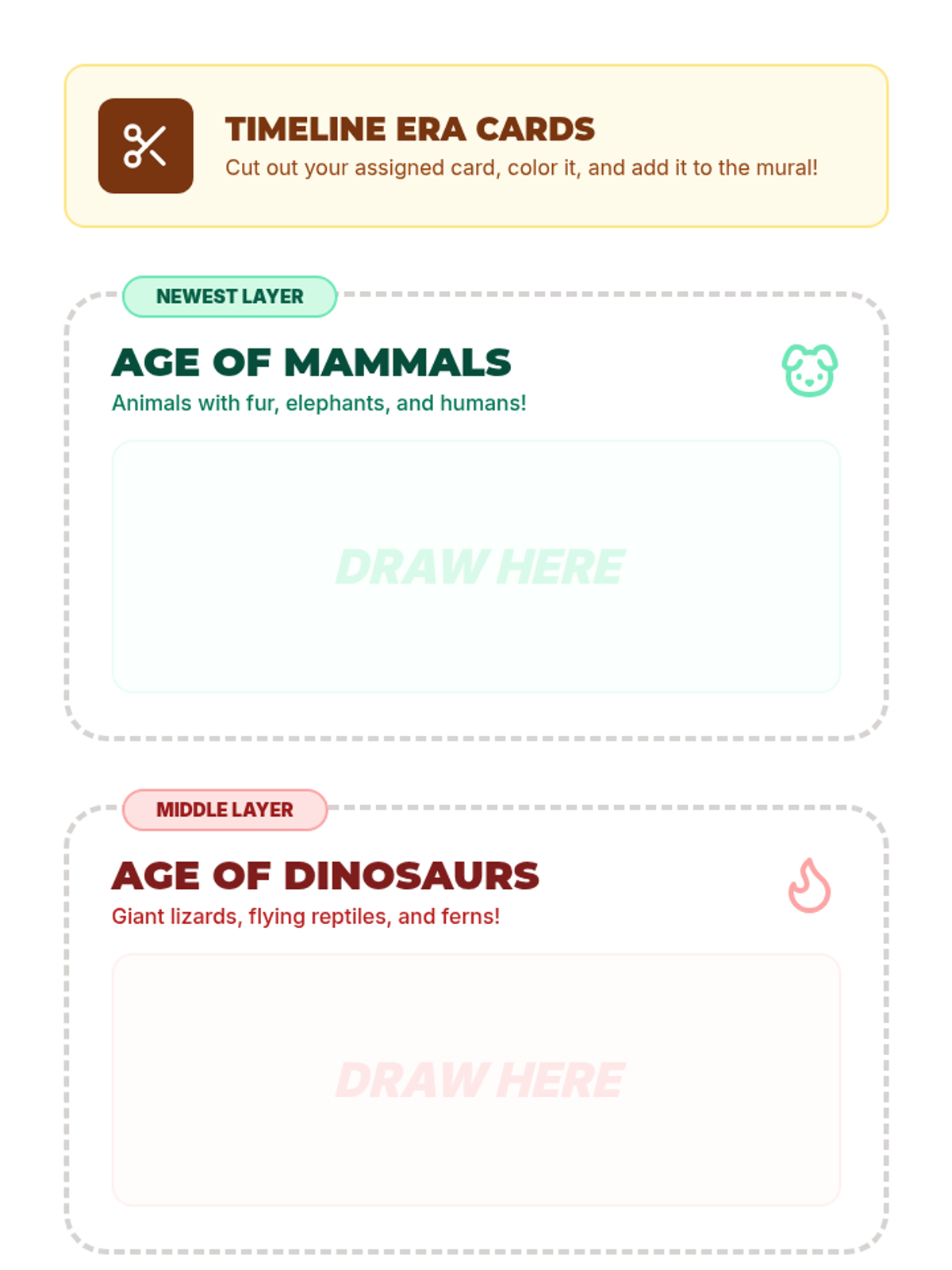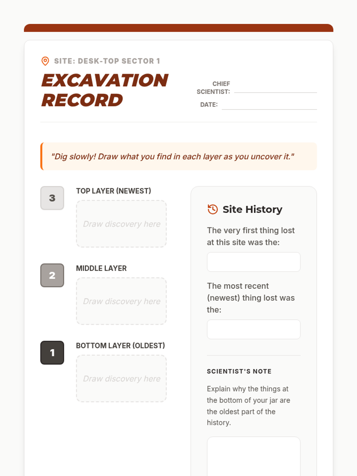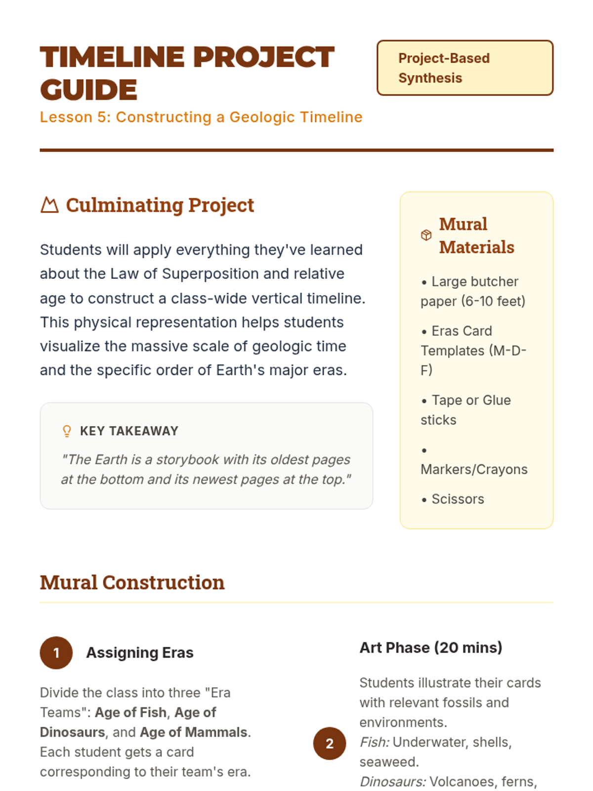 Students explore the concept of stratigraphy and geologic time through the lens of 'layers,' using concrete analogies to understand that lower rock layers are generally older. The sequence moves from simple ordering tasks to interpreting environmental changes and constructing a vertical timeline of Earth's history.