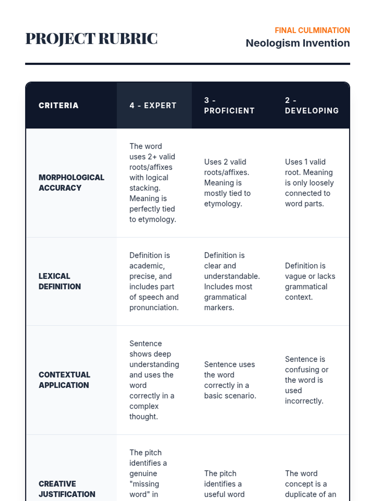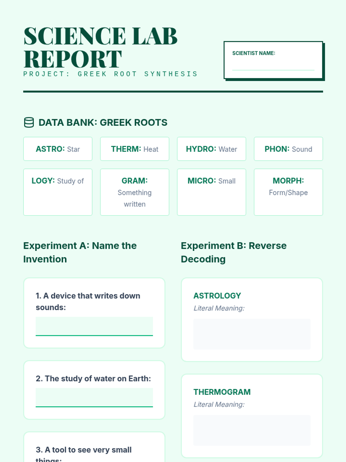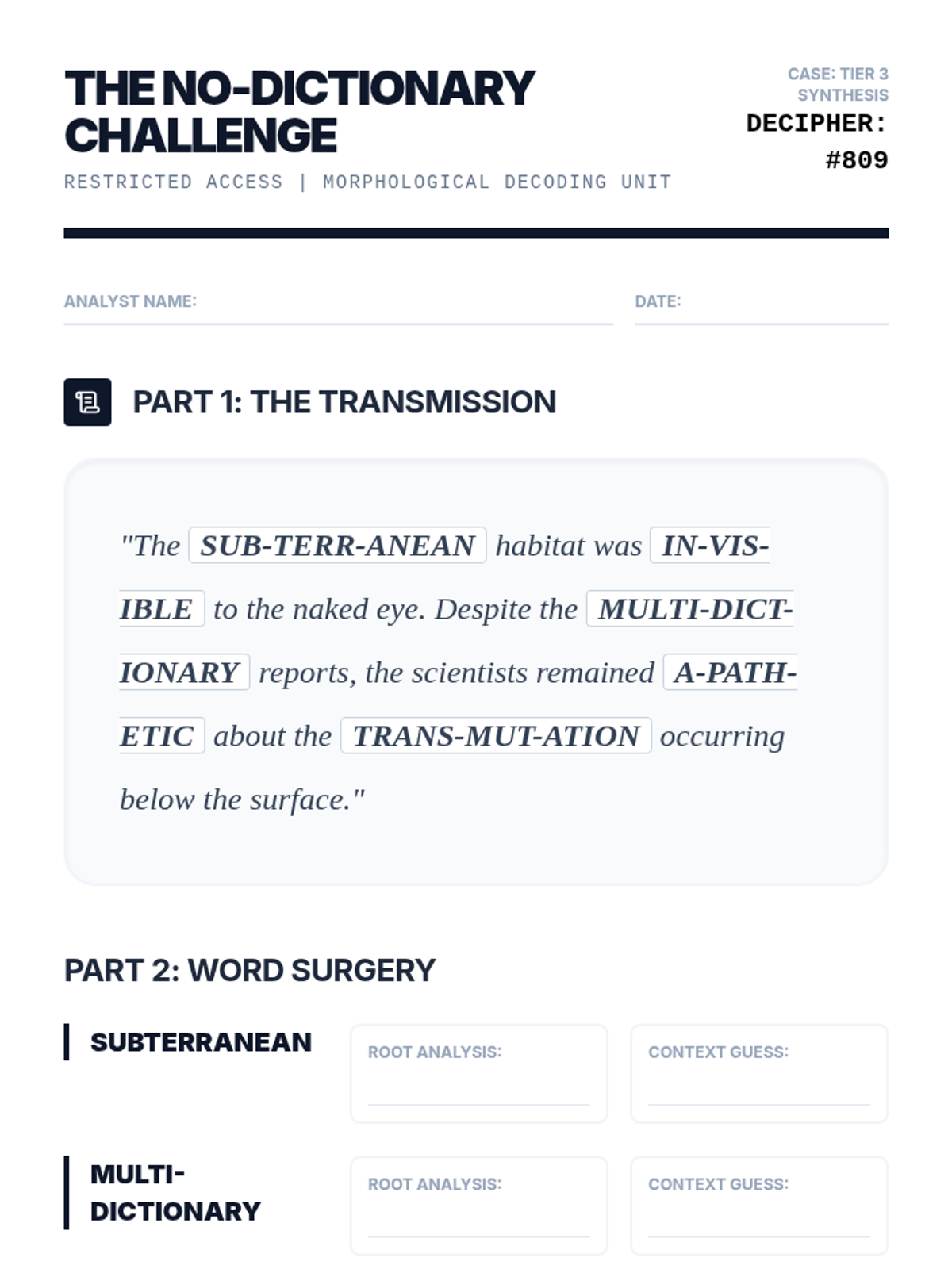 A comprehensive 6th-grade ESL sequence focusing on morphological awareness through the study of Greek and Latin roots, prefixes, and suffixes. Students transition from identifying basic word parts to synthesizing their own neologisms, building advanced academic vocabulary stamina.
