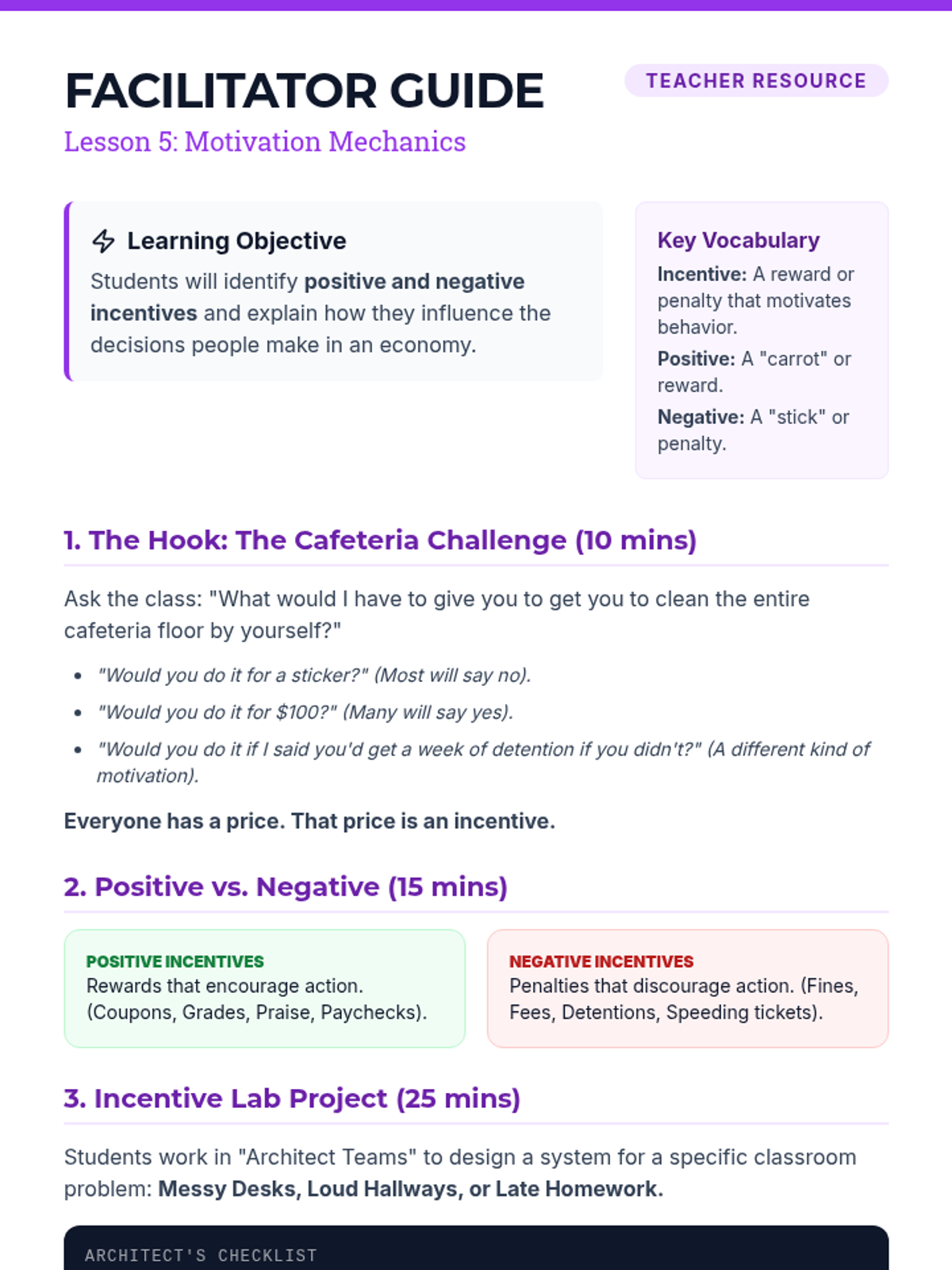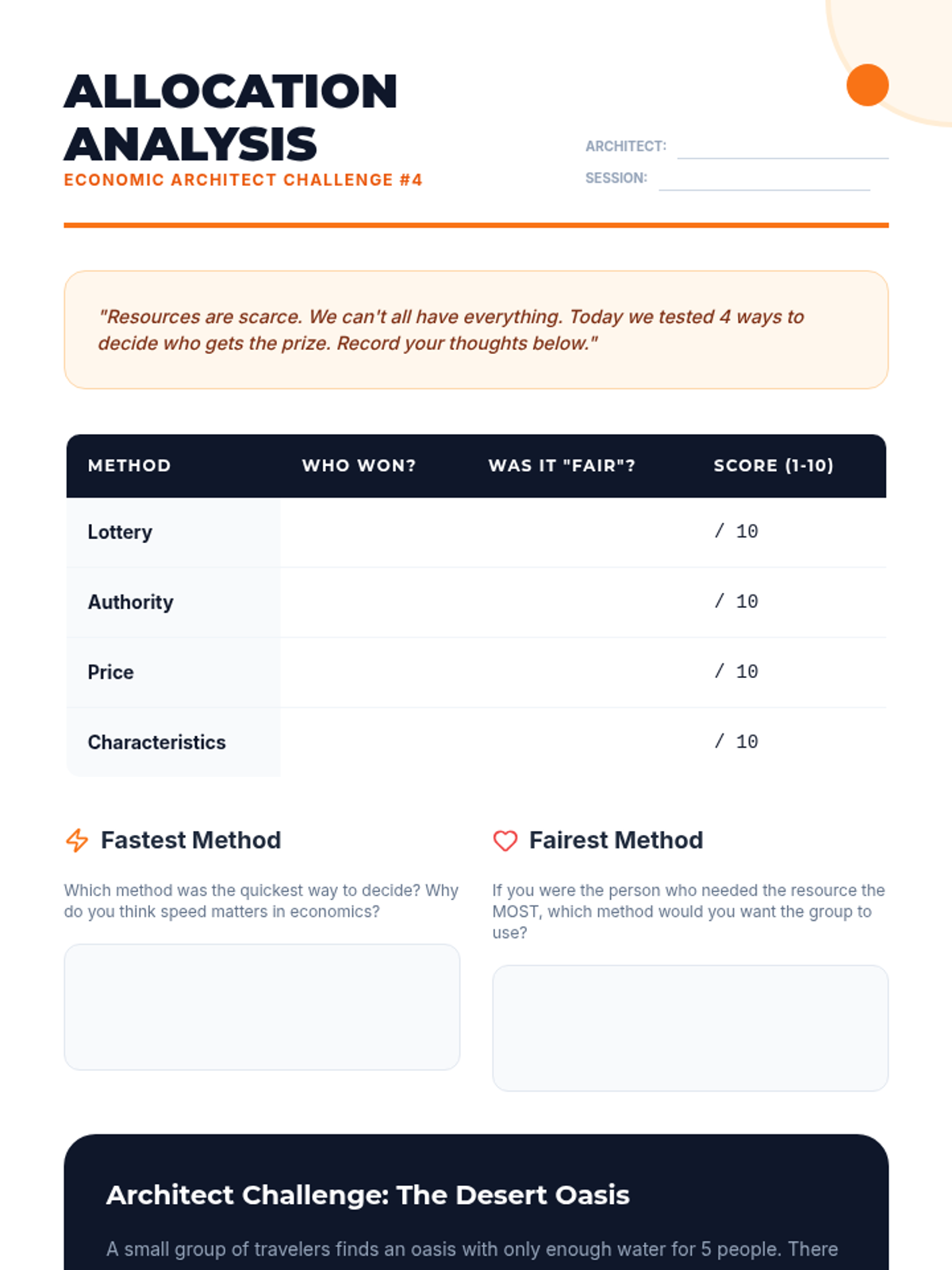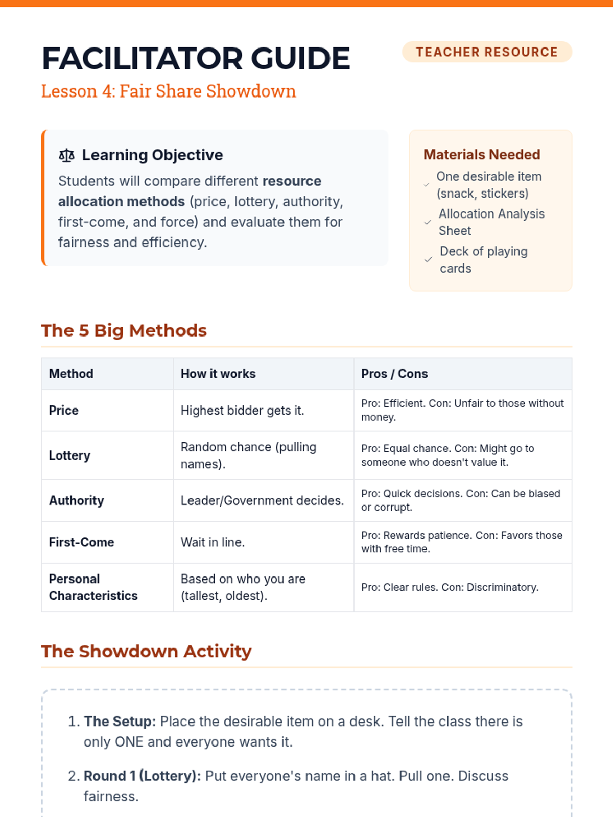 A comprehensive 5th Grade Economics unit that uses simulations and games to teach scarcity, opportunity cost, factors of production, resource allocation, and incentives. Students move from personal survival scenarios to community-wide economic planning.