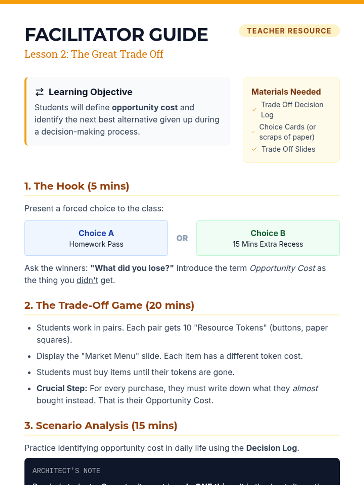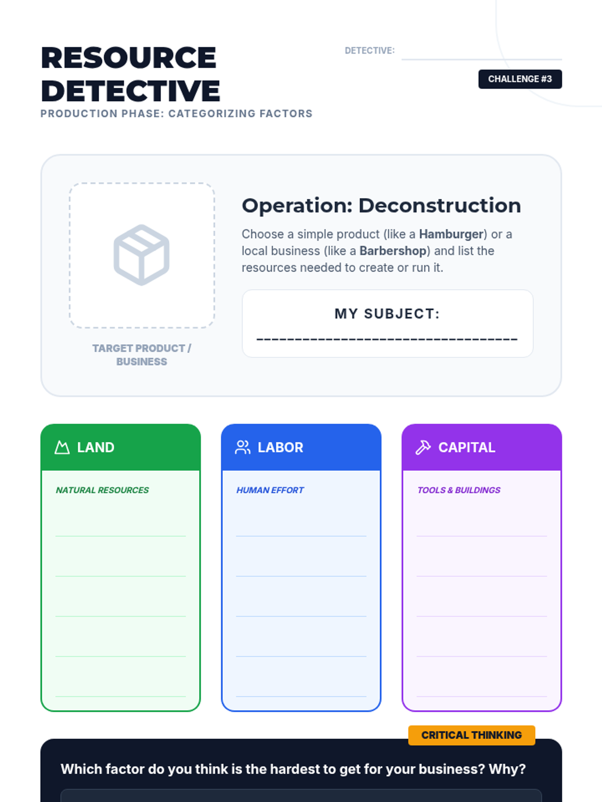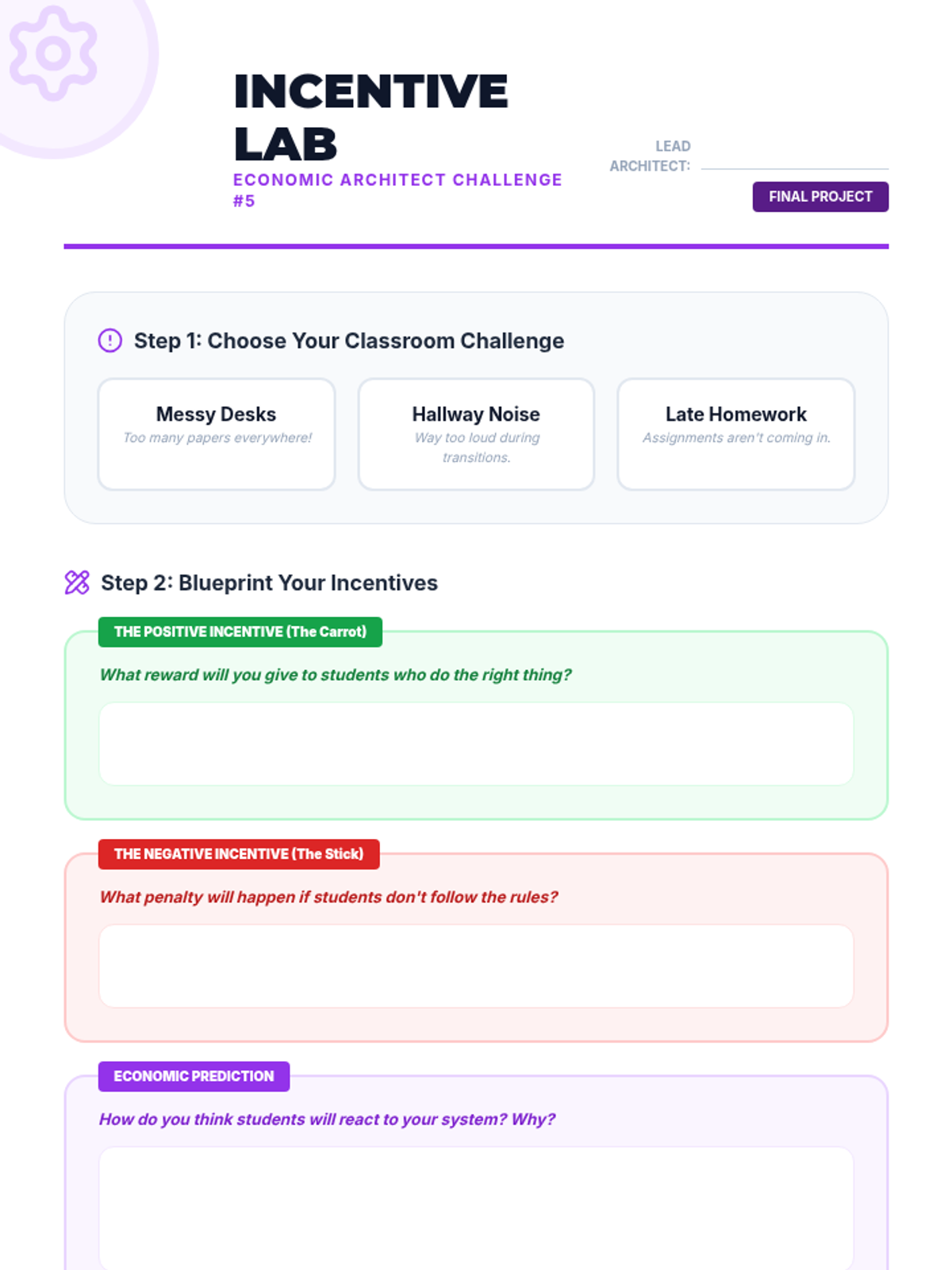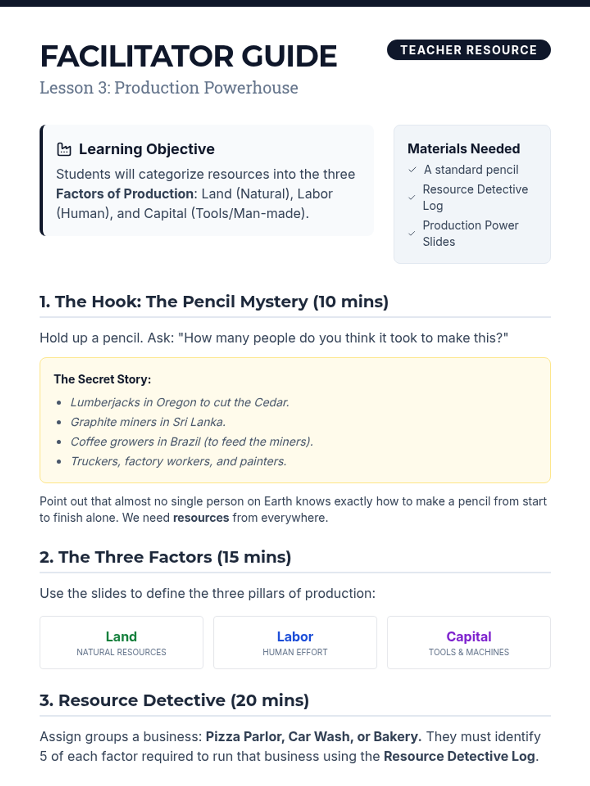 A comprehensive 5th Grade Economics unit that uses simulations and games to teach scarcity, opportunity cost, factors of production, resource allocation, and incentives. Students move from personal survival scenarios to community-wide economic planning.