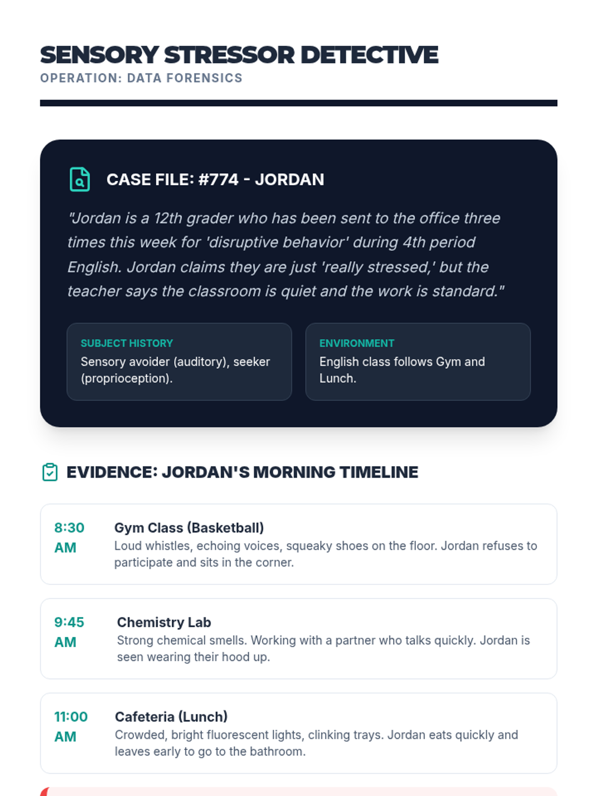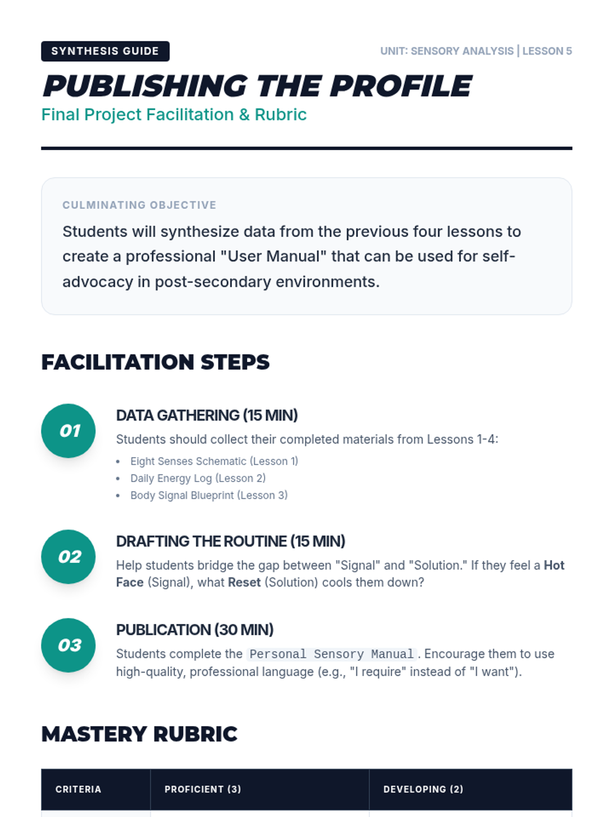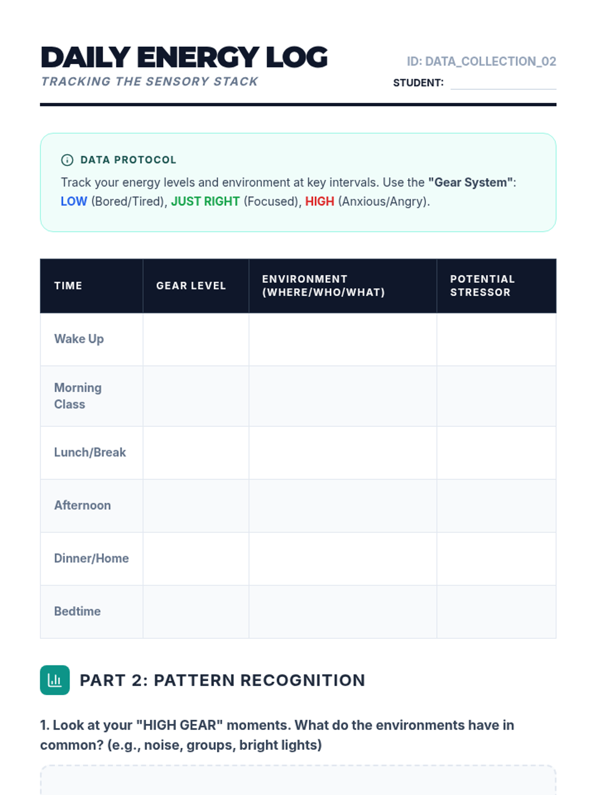 This sequence guides 12th-grade students through a deep self-assessment of their sensory profiles. They explore the neurology of regulation, track personal triggers, and identify body signals to build the self-awareness necessary for independence and advocacy.