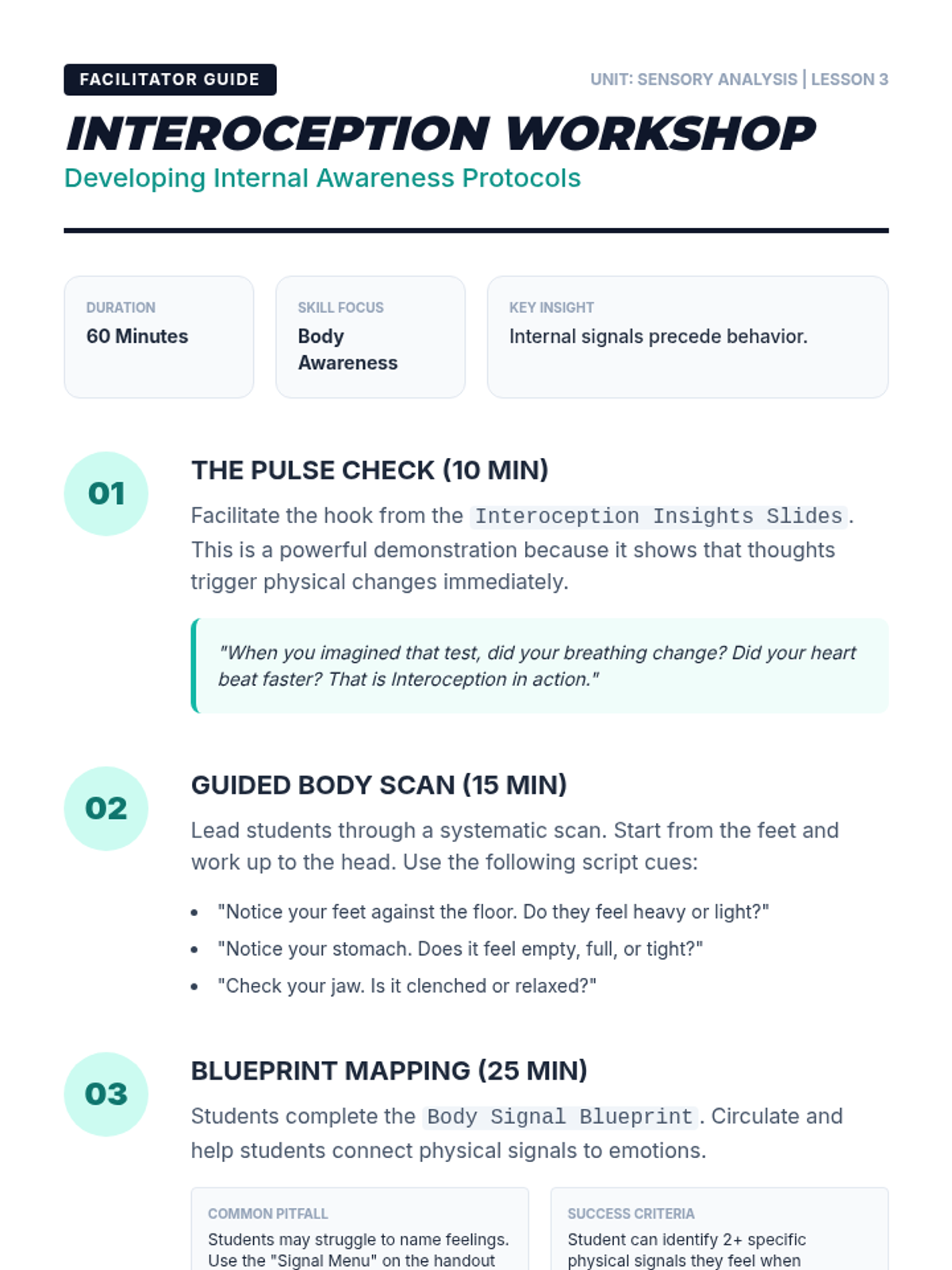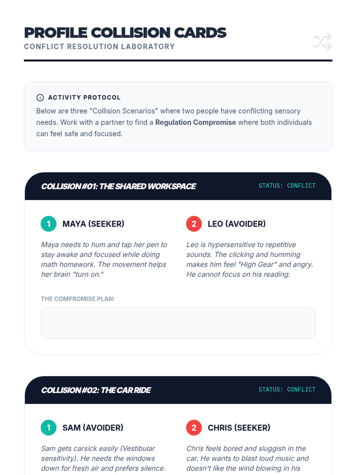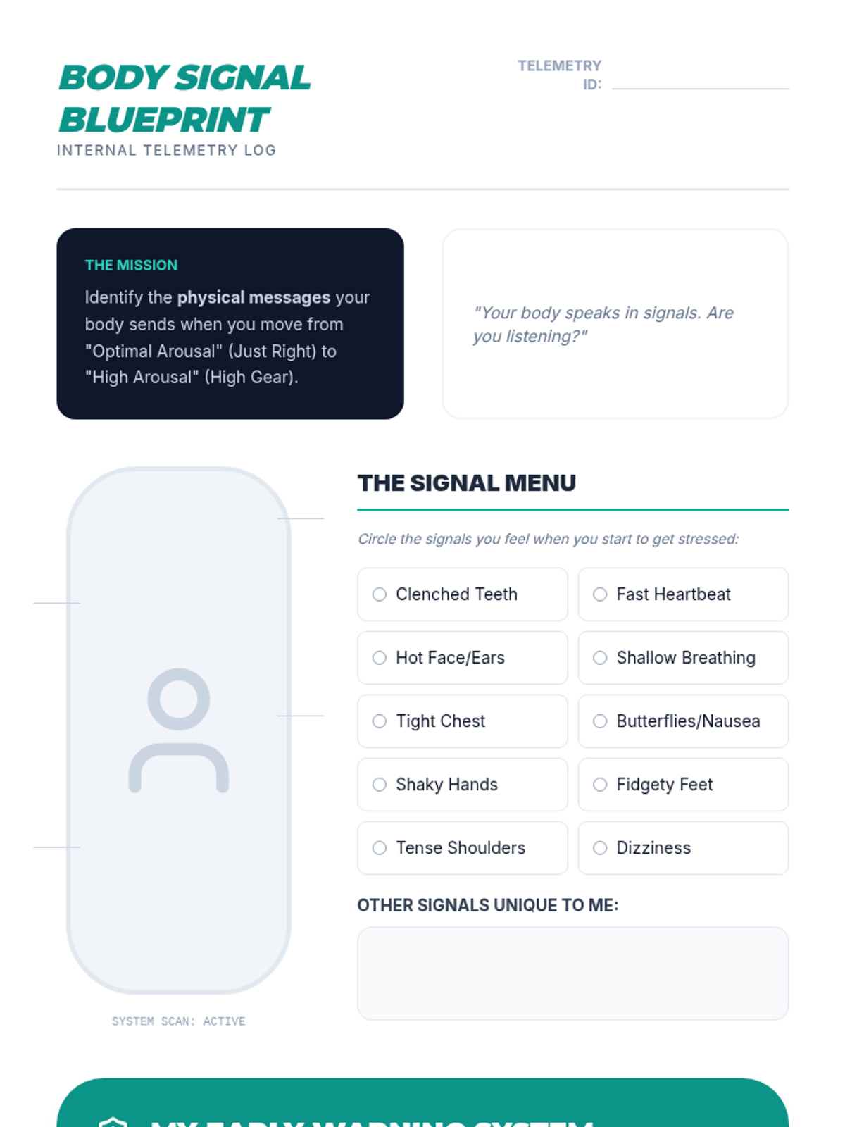 This sequence guides 12th-grade students through a deep self-assessment of their sensory profiles. They explore the neurology of regulation, track personal triggers, and identify body signals to build the self-awareness necessary for independence and advocacy.