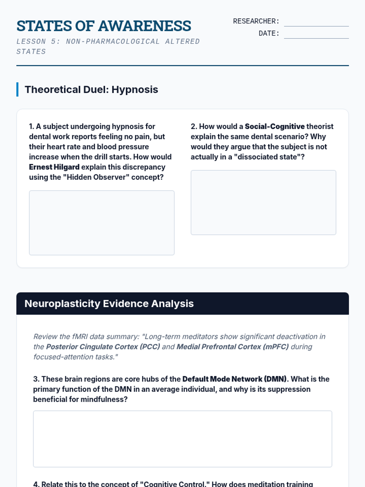 This undergraduate psychology sequence explores the biological and psychological dimensions of consciousness, from circadian regulation and the neurobiology of sleep to the effects of psychoactive drugs and the clinical applications of hypnosis and meditation. Students synthesize neuroscientific data with psychological theory to understand how the brain constructs subjective experience.