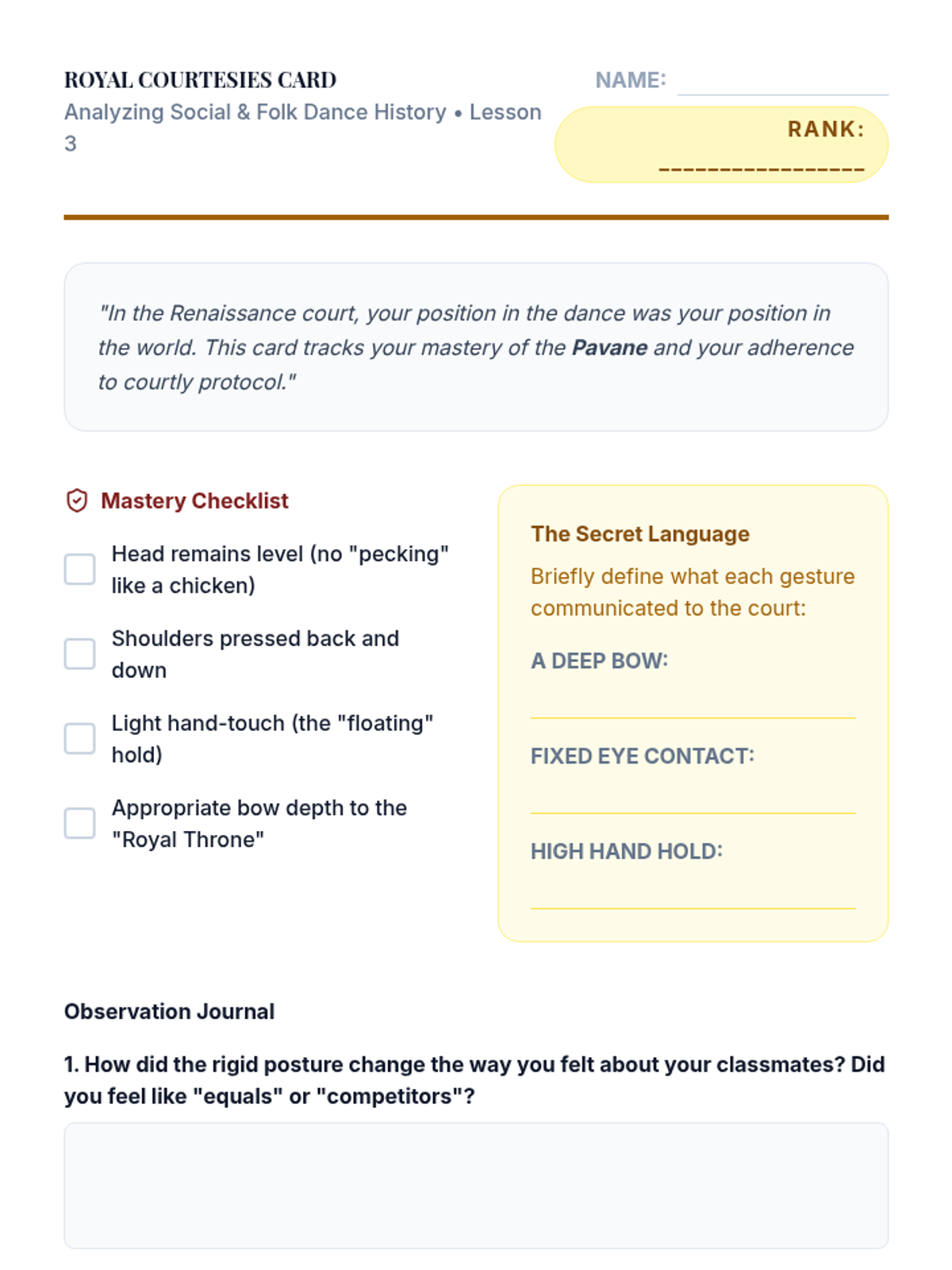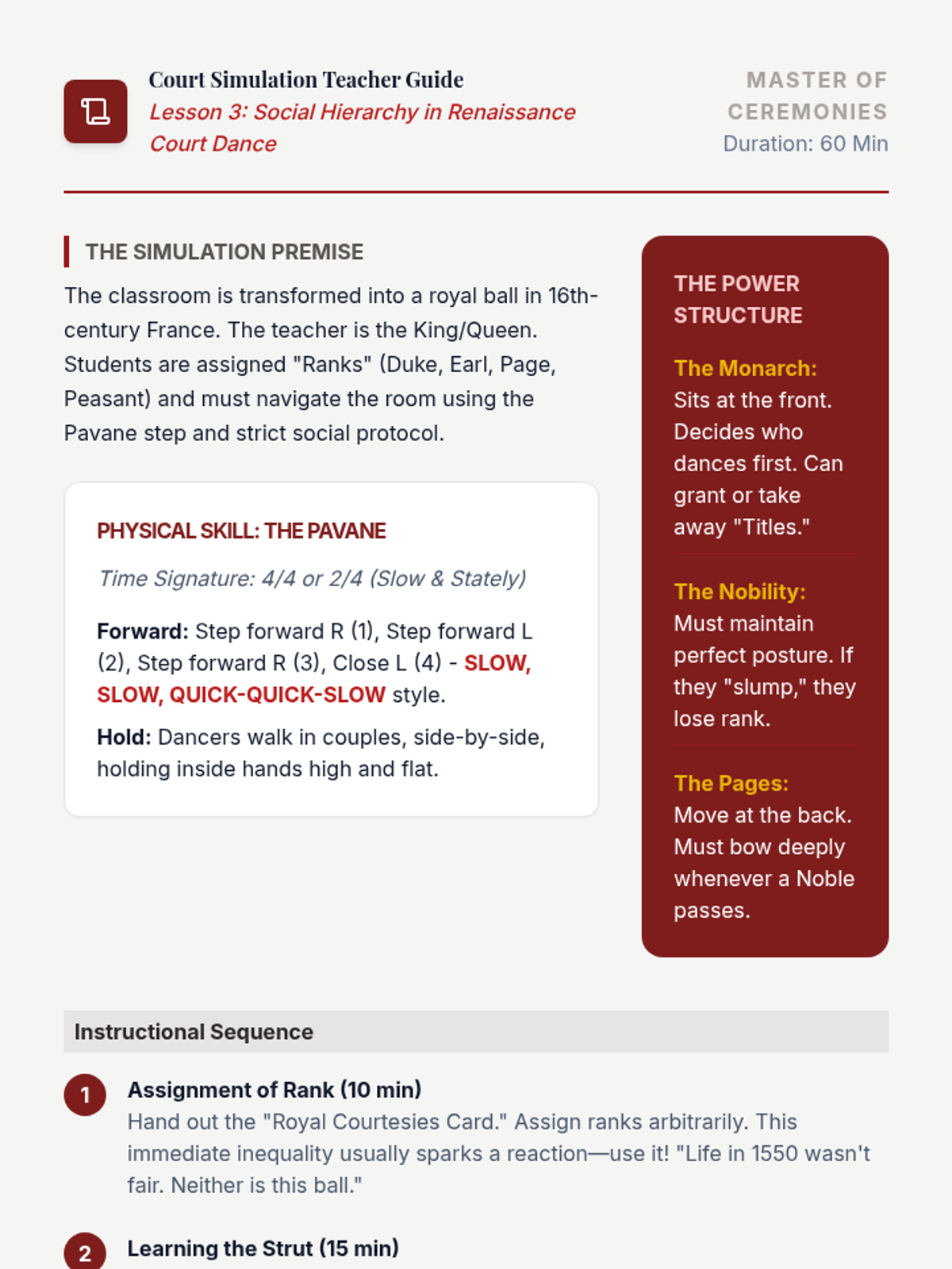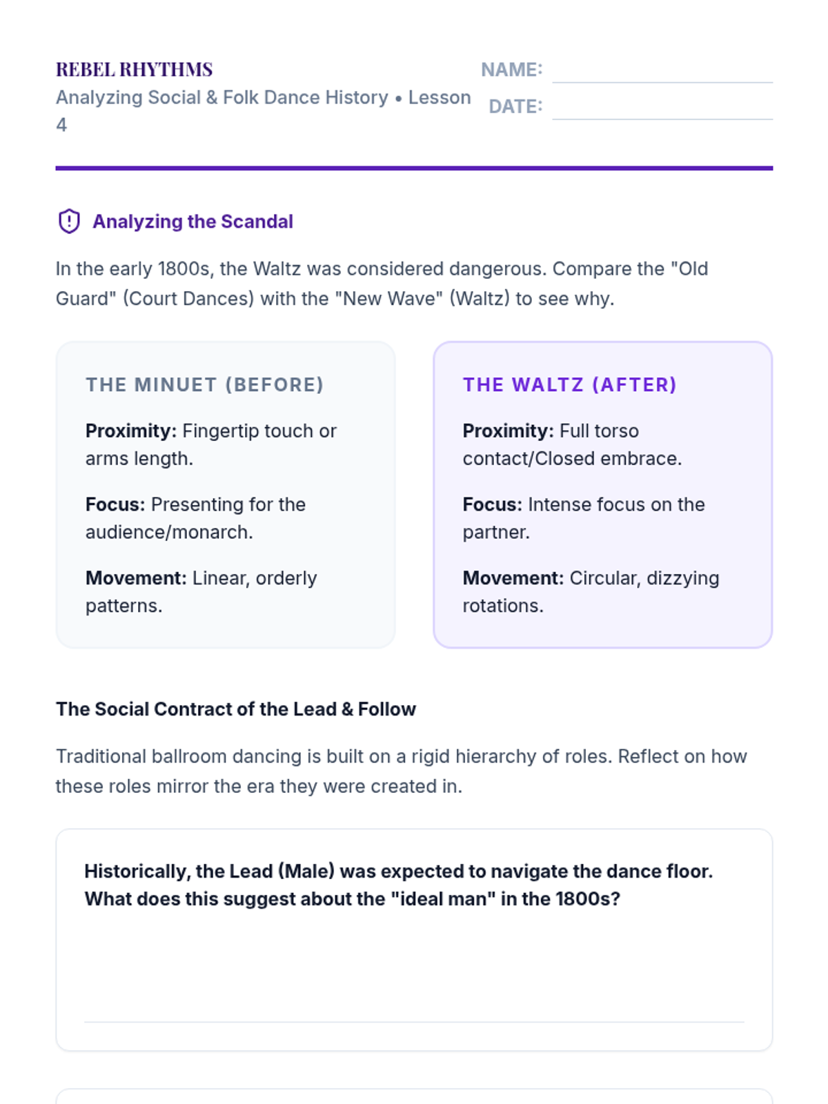 Students explore the social functions of dance, from communal circle dances to hierarchical court dances and the cultural fusion of modern partner styles. They analyze how choreography reflects the values, hierarchies, and gender roles of diverse societies throughout history.