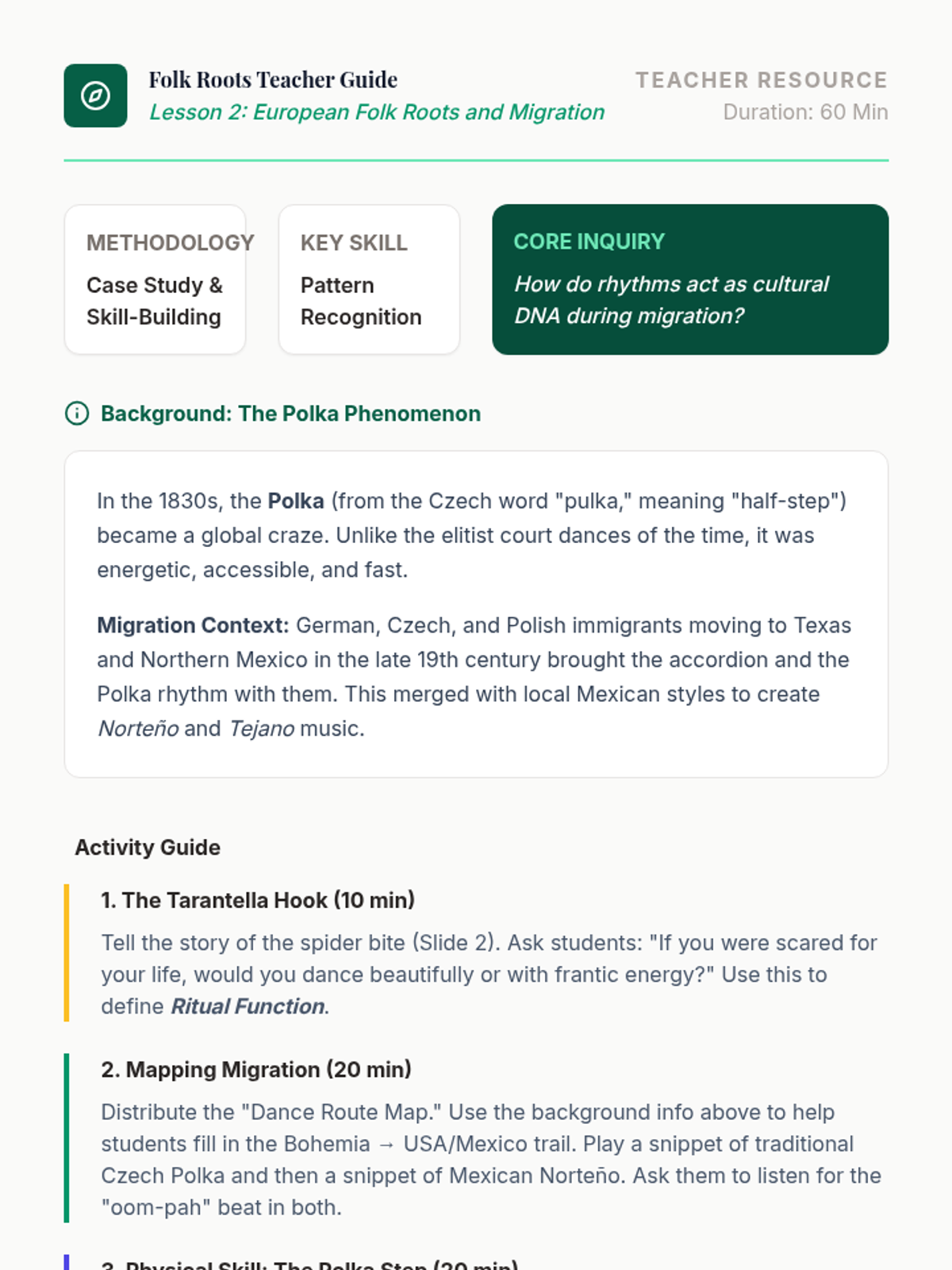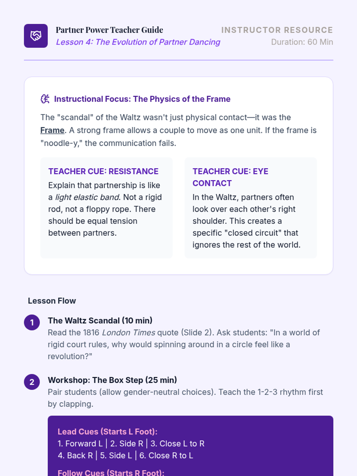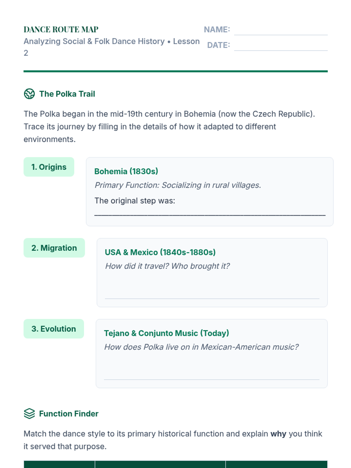 Students explore the social functions of dance, from communal circle dances to hierarchical court dances and the cultural fusion of modern partner styles. They analyze how choreography reflects the values, hierarchies, and gender roles of diverse societies throughout history.