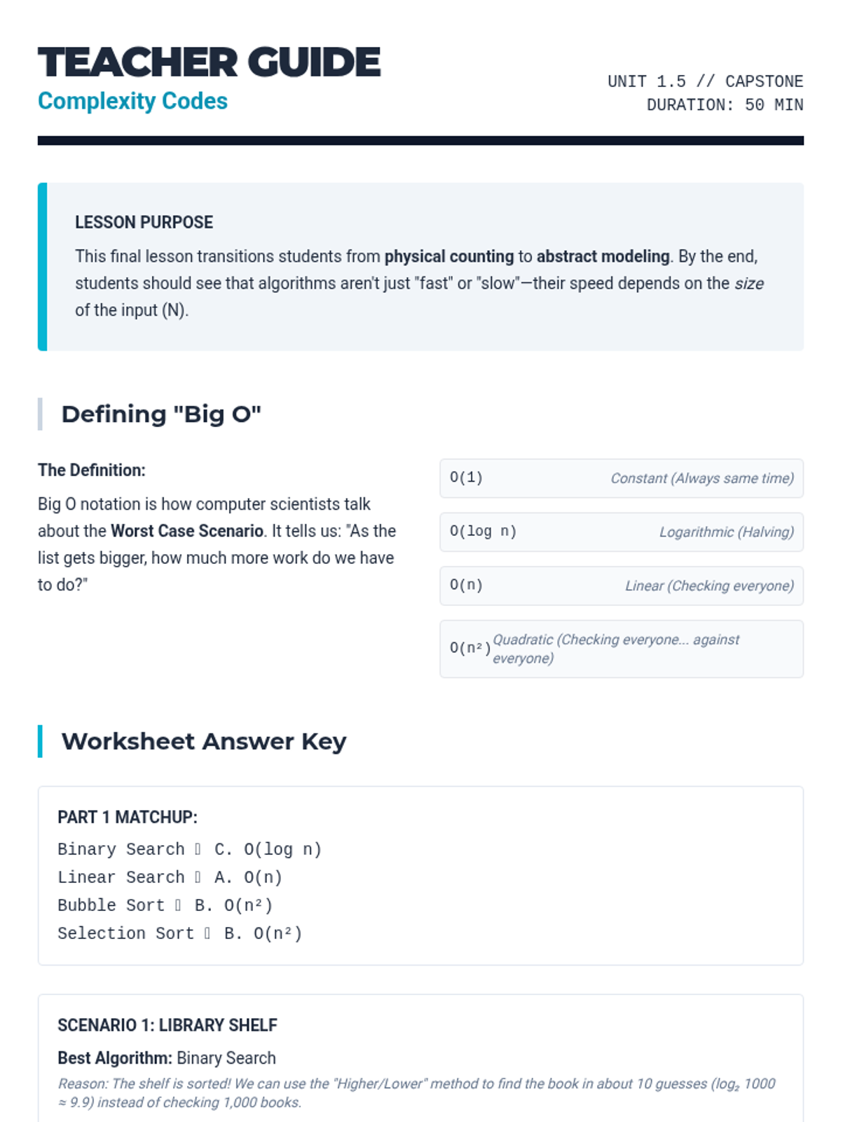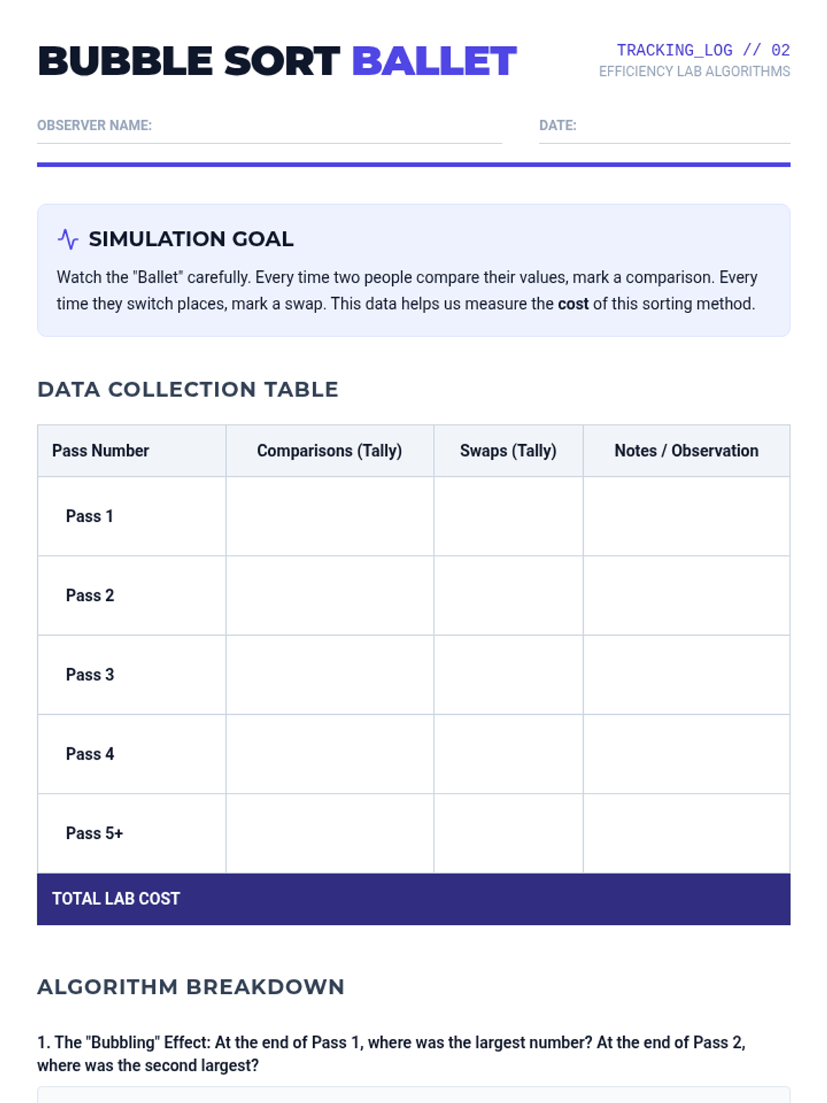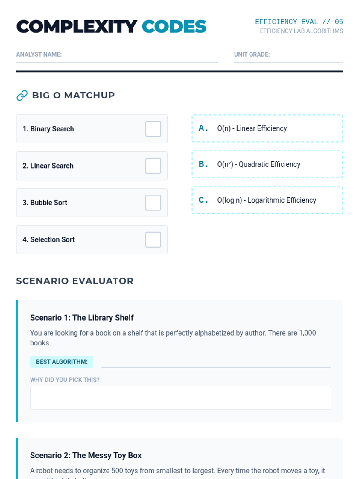 A comprehensive unit on algorithmic efficiency where students use physical simulations and comparative analysis to explore how computer scientists measure the 'cost' of solving problems. Students move from simple search methods to complex sorting algorithms, culminating in an introduction to computational complexity.
