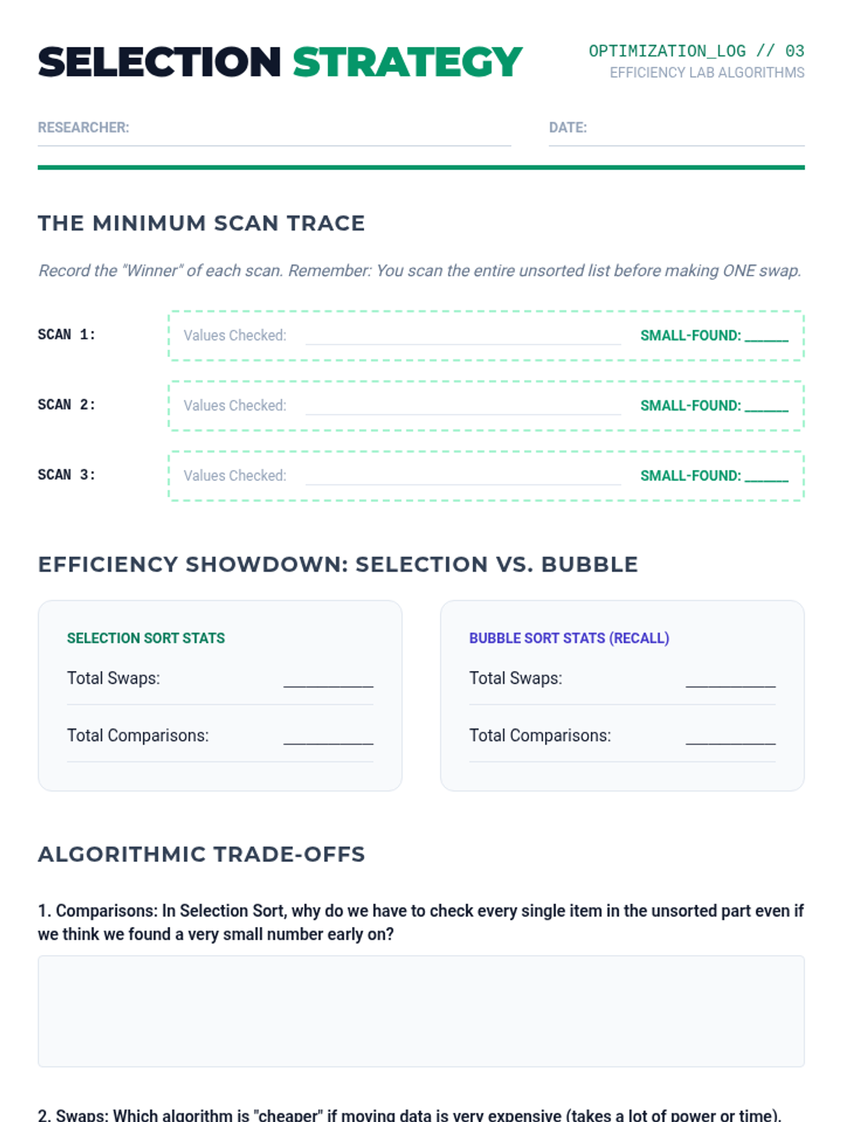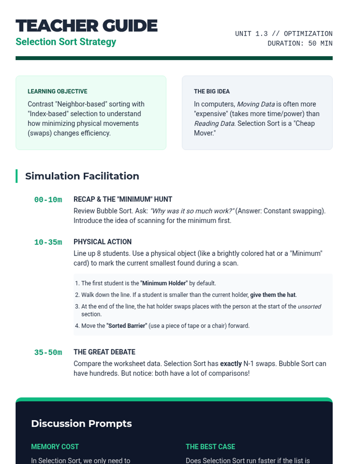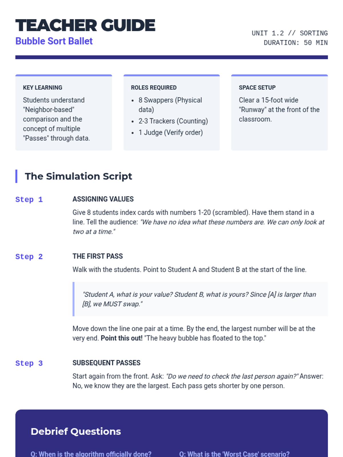 A comprehensive unit on algorithmic efficiency where students use physical simulations and comparative analysis to explore how computer scientists measure the 'cost' of solving problems. Students move from simple search methods to complex sorting algorithms, culminating in an introduction to computational complexity.