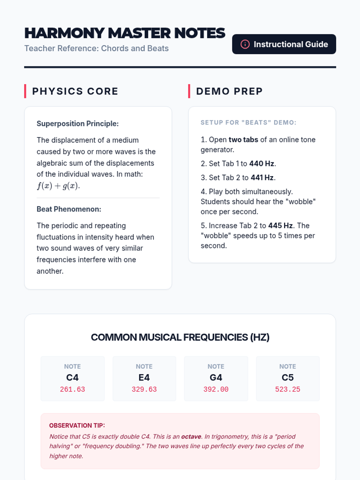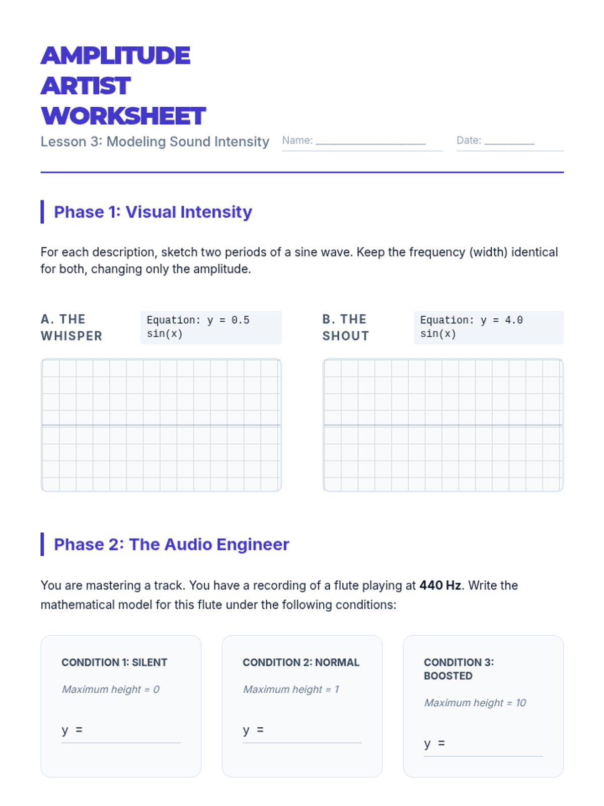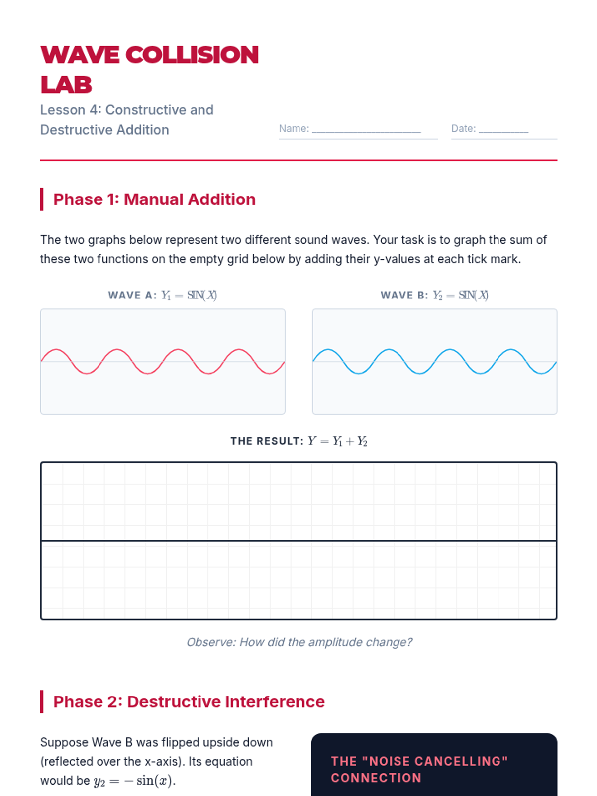 A high school trigonometry sequence that uses the physics of sound waves to teach modeling with trigonometric functions. Students explore pitch as frequency, volume as amplitude, and the superposition of waves to create harmonies and digital tones.