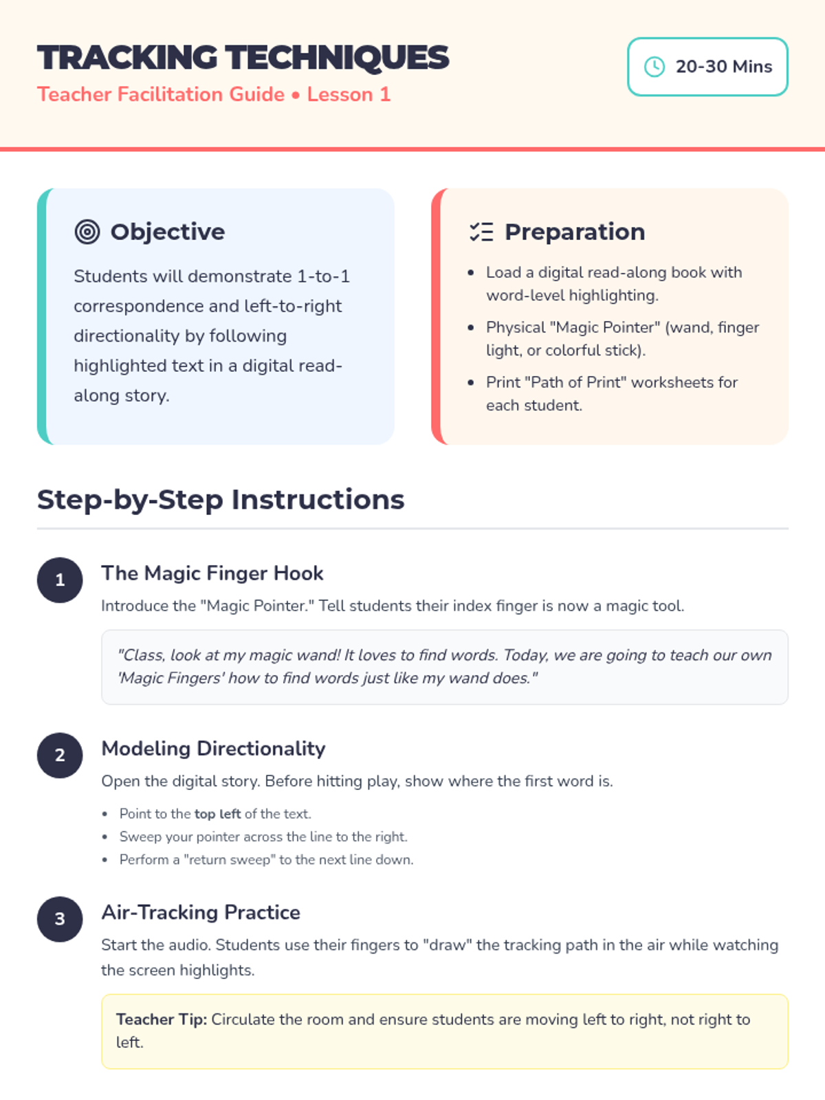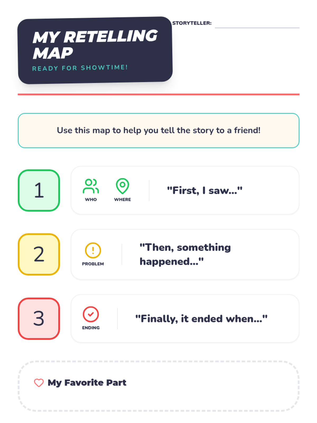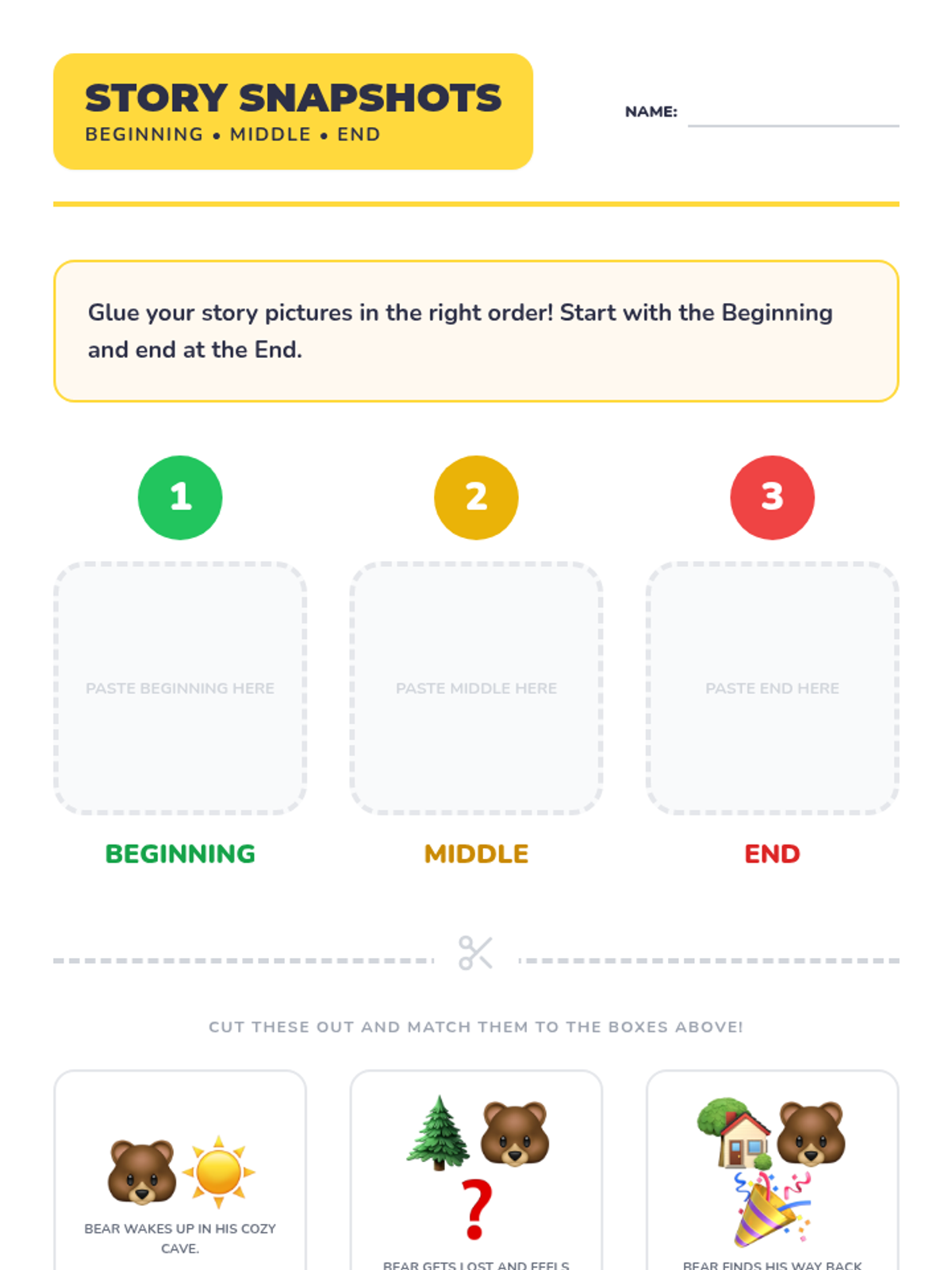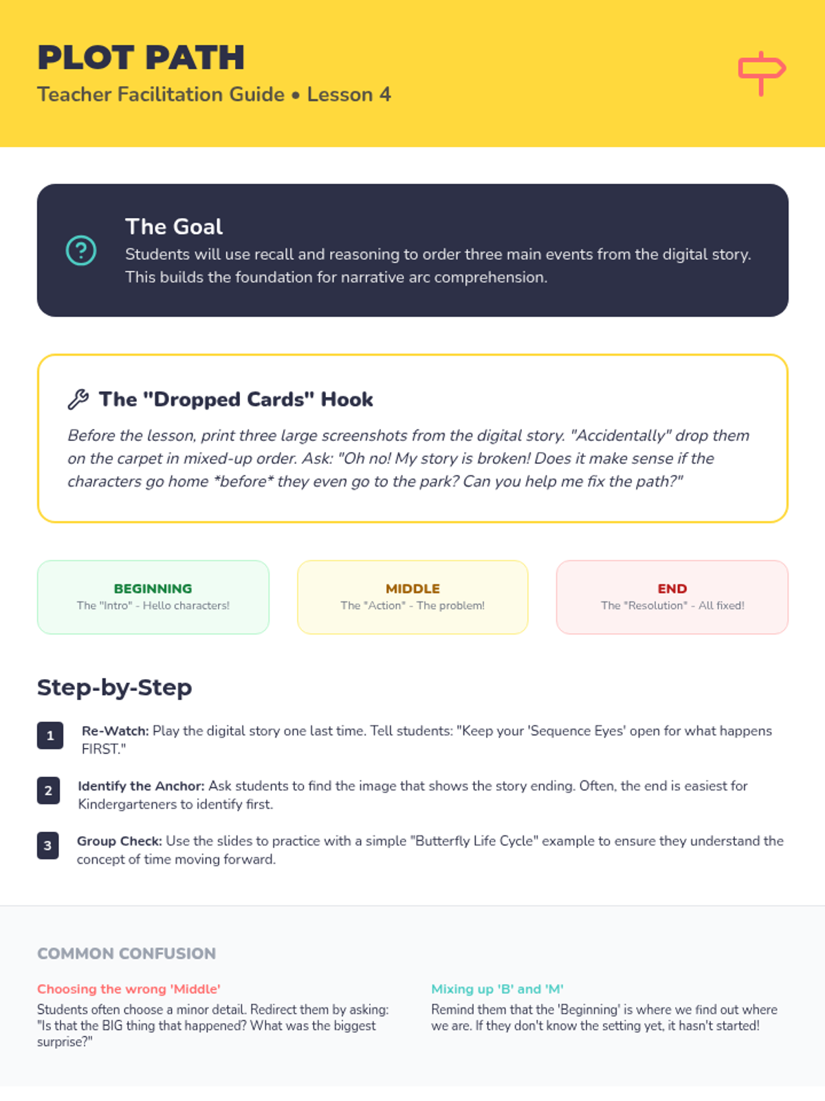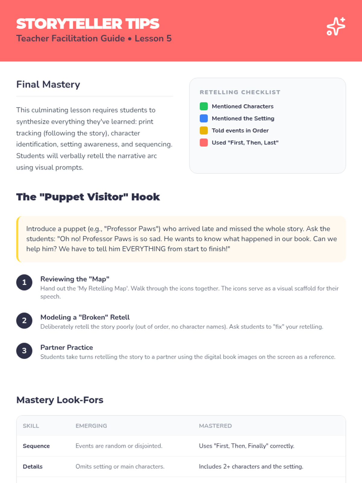 A Kindergarten ELA sequence focused on narrative structure through read-along stories. Students progress from tracking print directionality to identifying characters and settings, finally mastering the ability to sequence and retell stories.
