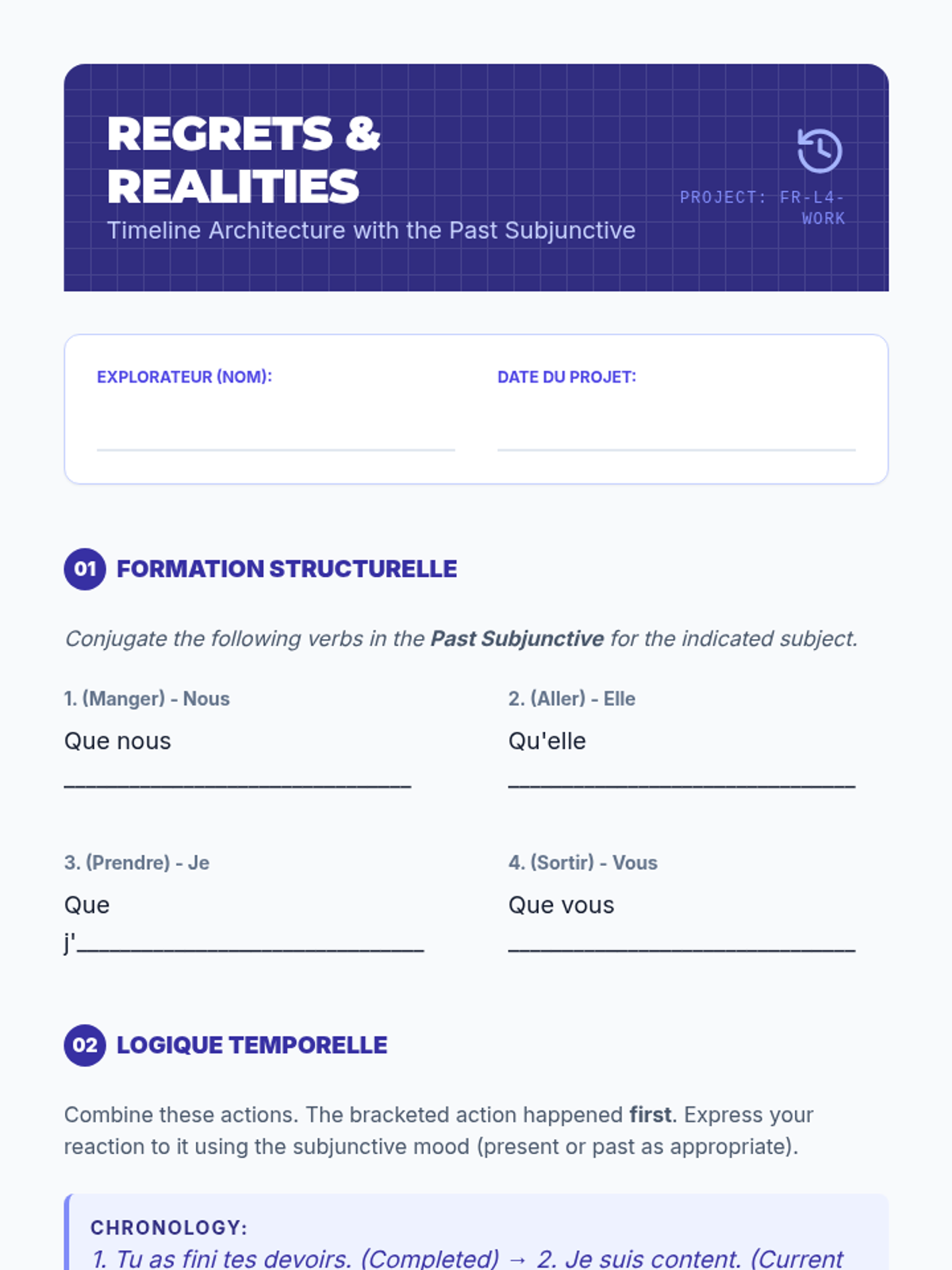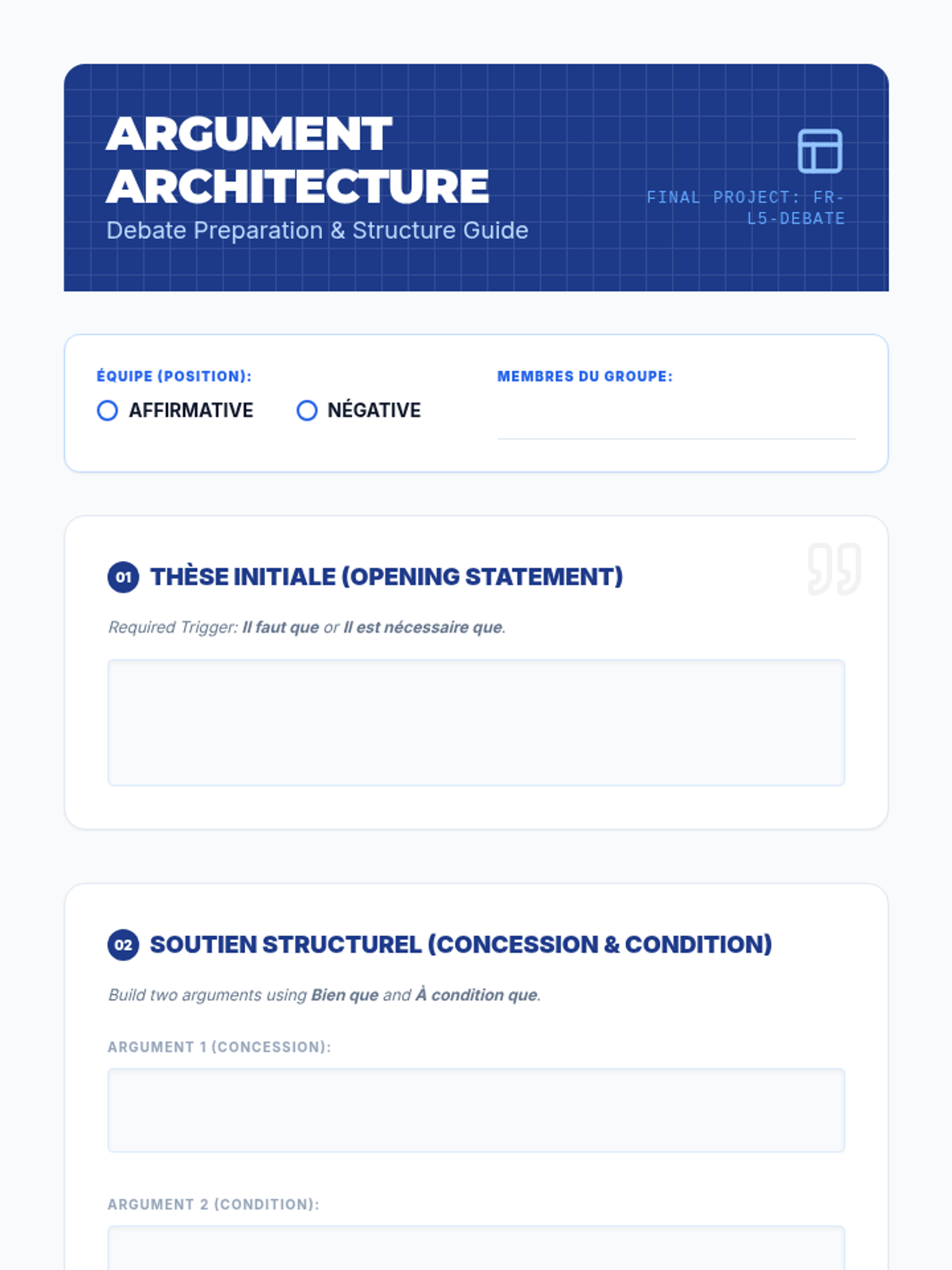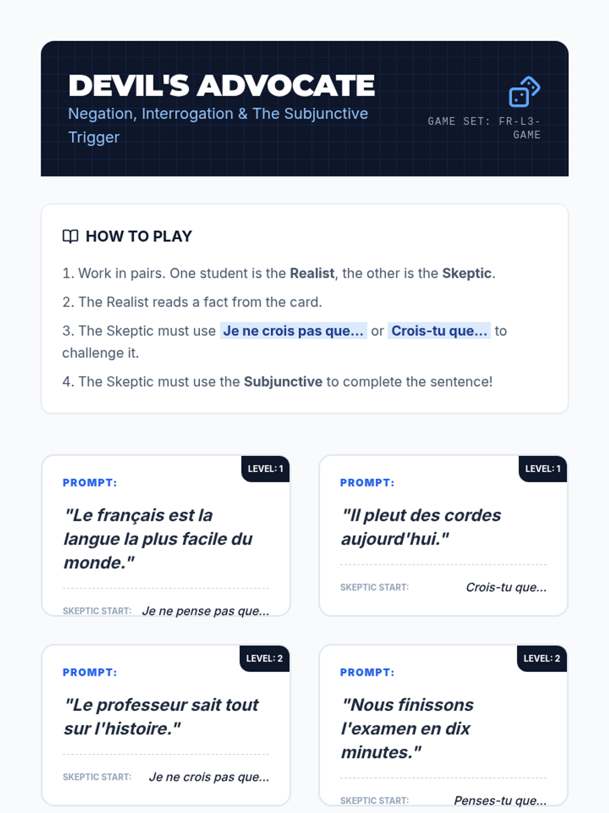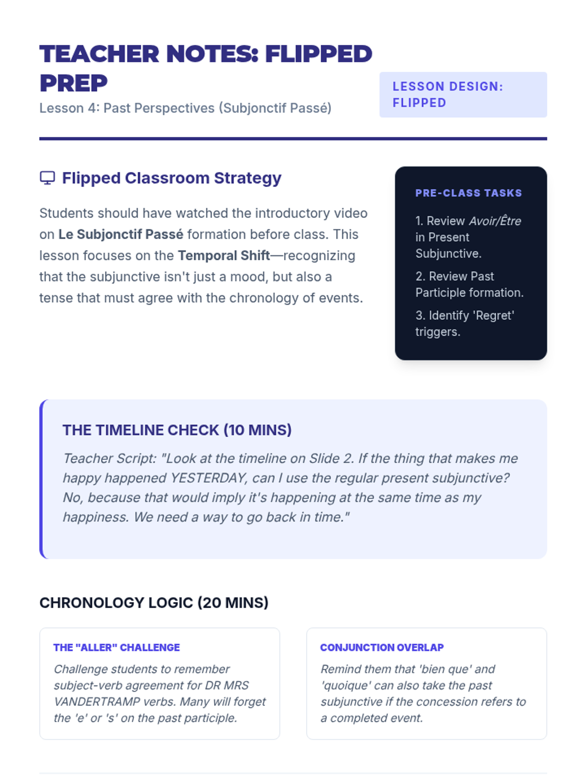 This advanced French grammar sequence guides 10th-grade students through the complexities of the subjunctive mood, focusing on conjunctions of purpose, time, concession, and condition, as well as the nuances of doubt in negation and interrogation. The unit culminates in a formal debate where students must architect their arguments using these sophisticated structures.