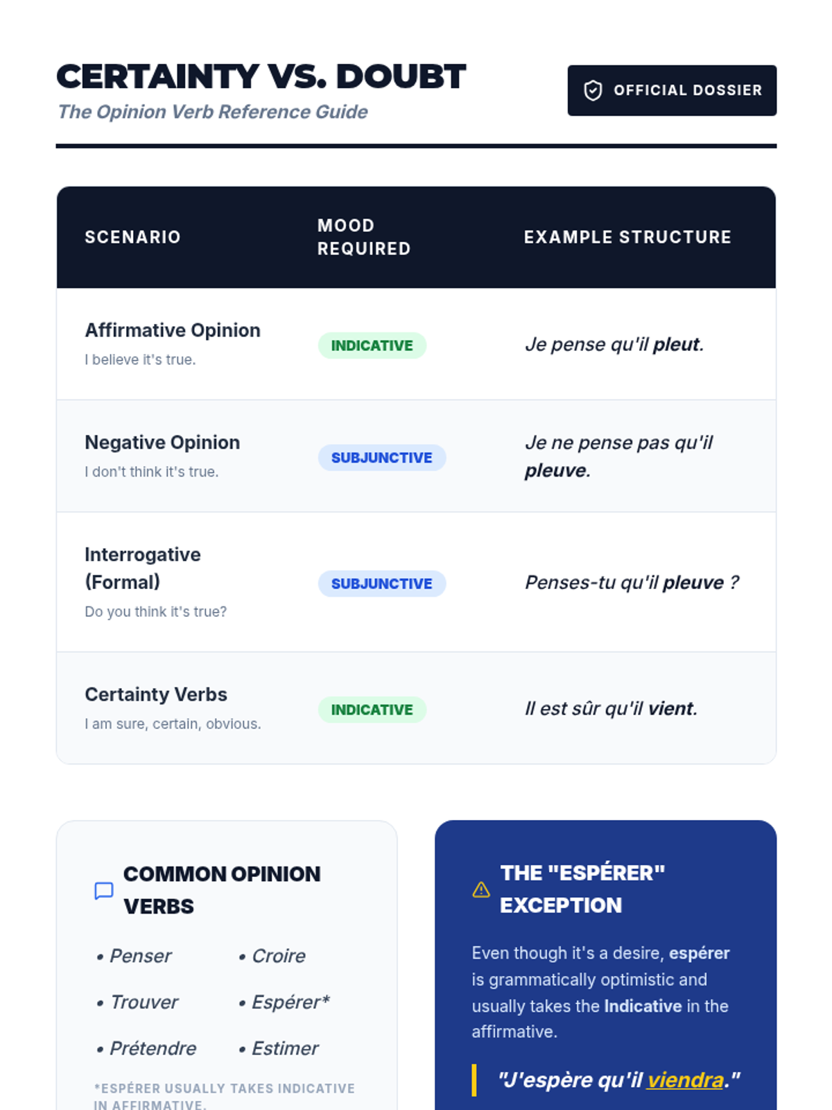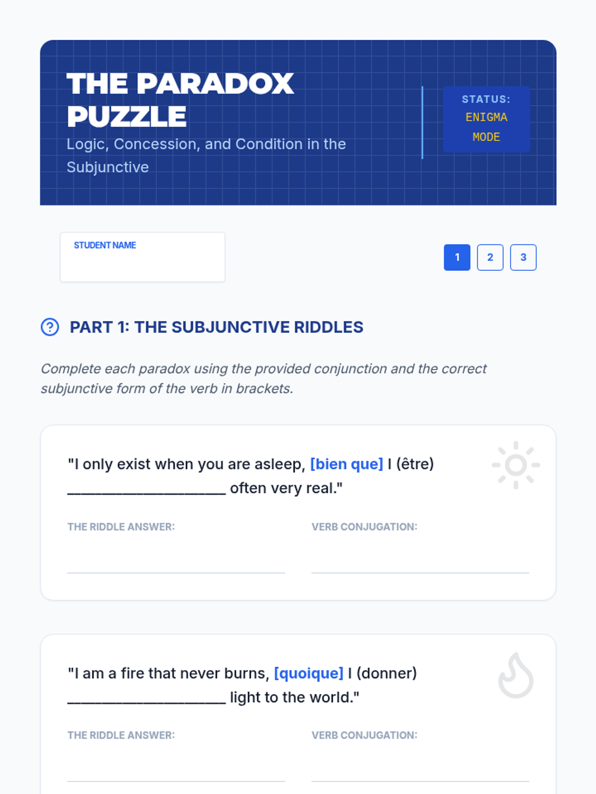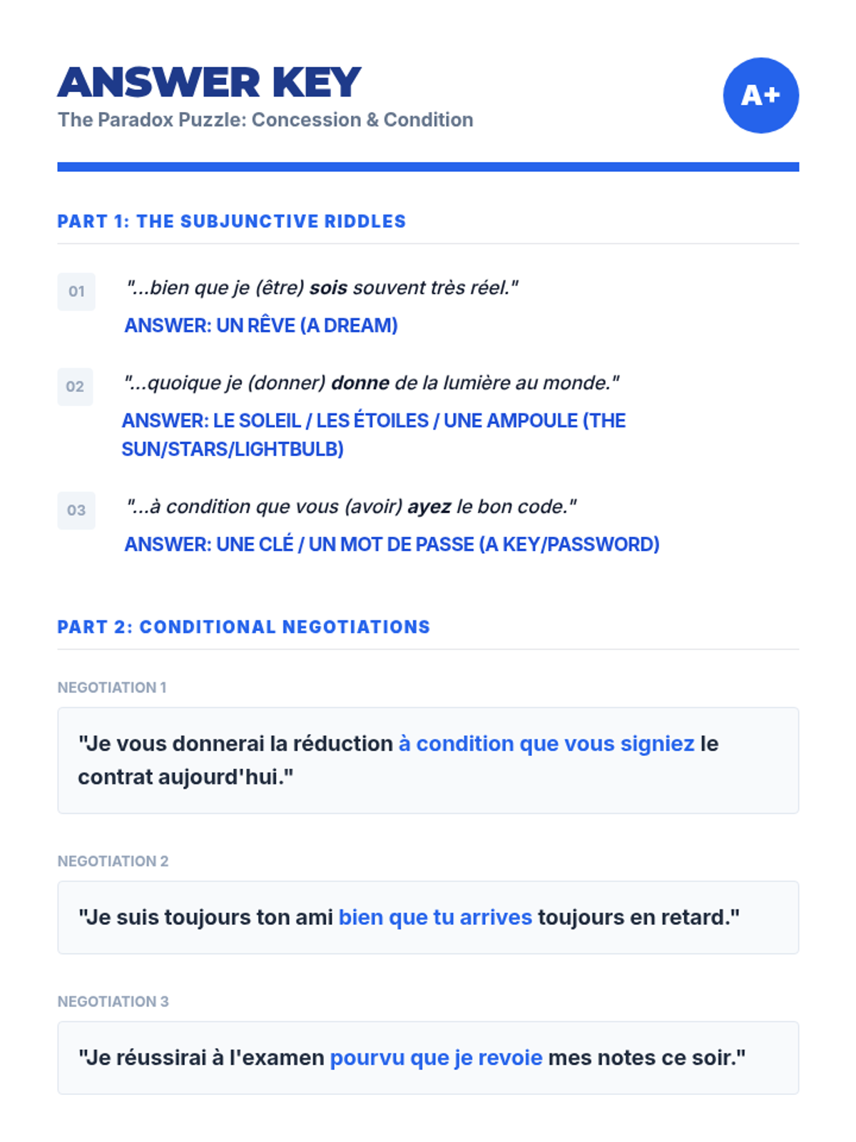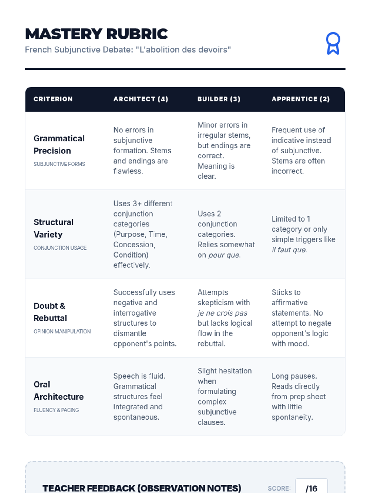 This advanced French grammar sequence guides 10th-grade students through the complexities of the subjunctive mood, focusing on conjunctions of purpose, time, concession, and condition, as well as the nuances of doubt in negation and interrogation. The unit culminates in a formal debate where students must architect their arguments using these sophisticated structures.