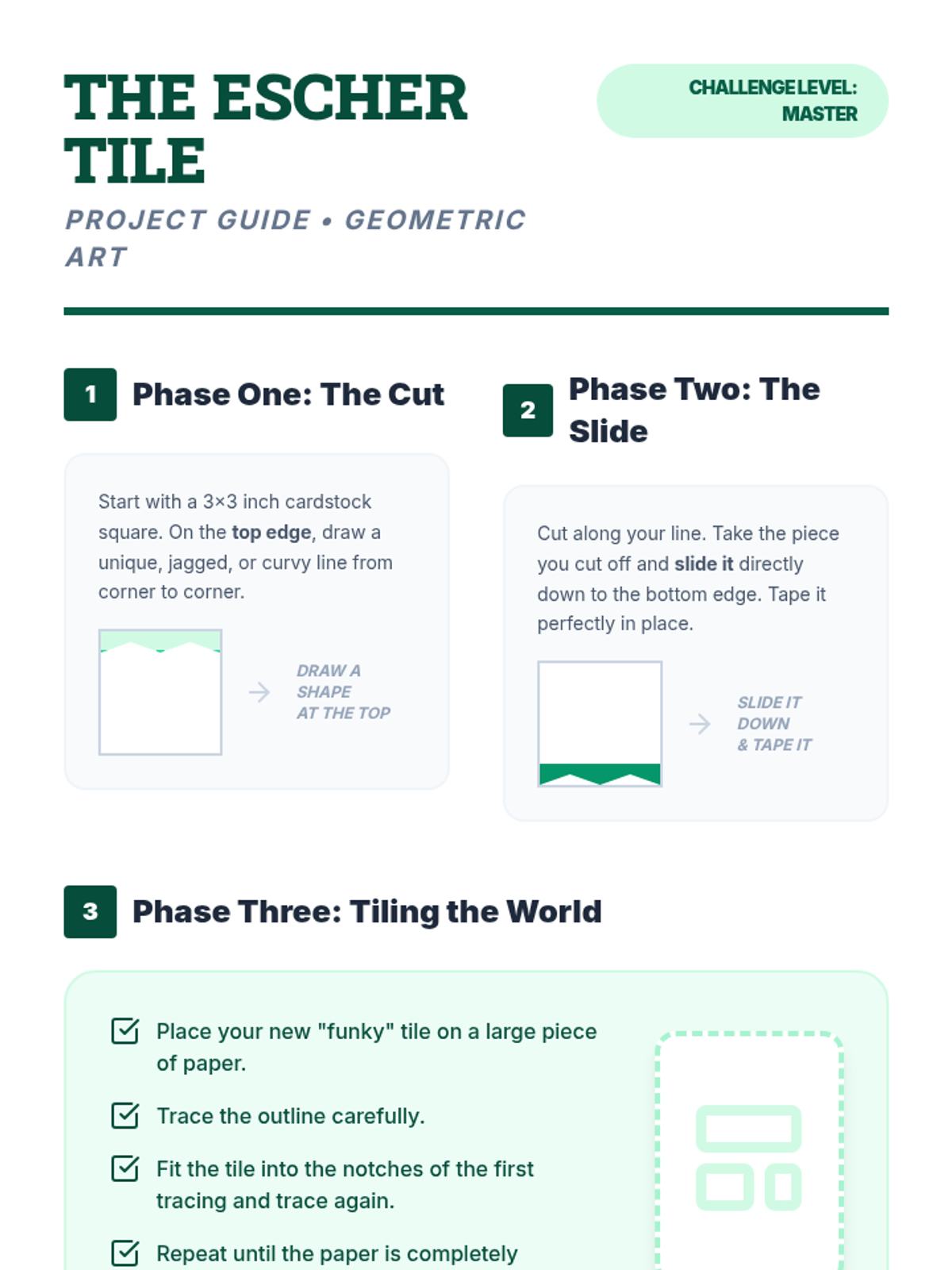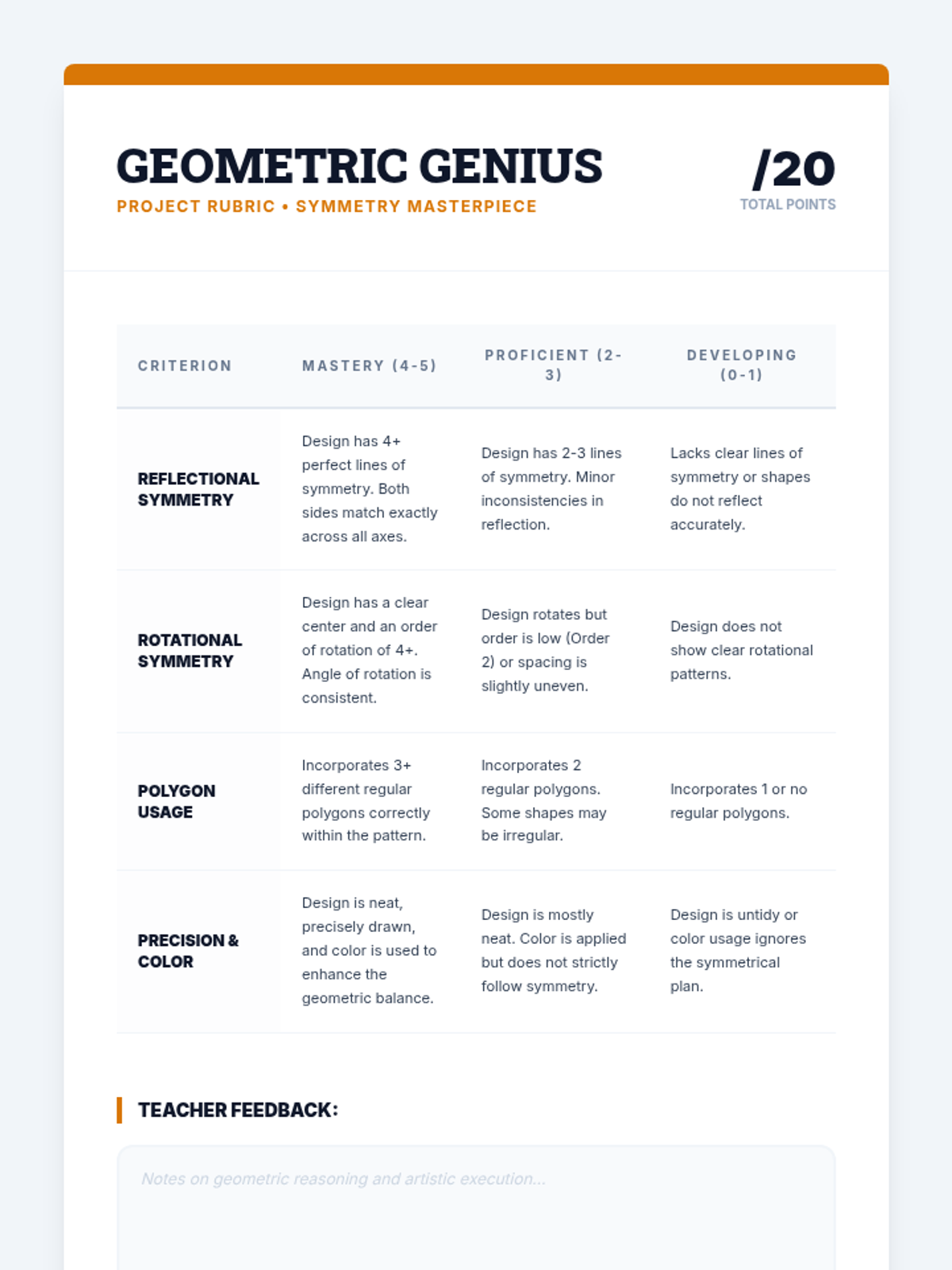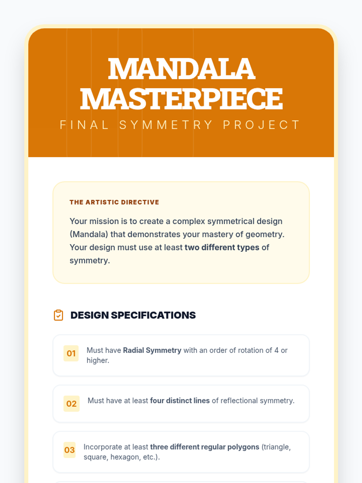 This 5th-grade geometry sequence explores symmetry and spatial reasoning through art and movement. Students progress from concrete manipulation with mirrors and paper folding to abstract visualization of rotational symmetry and tessellations, culminating in a complex symmetrical art project inspired by cultural patterns.