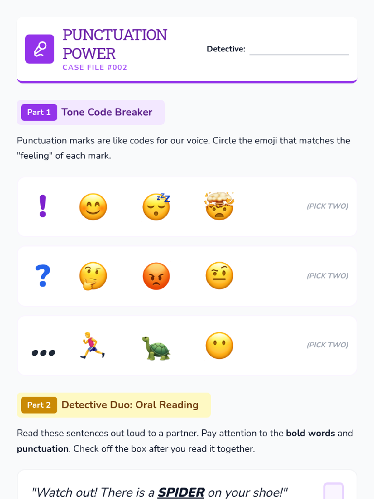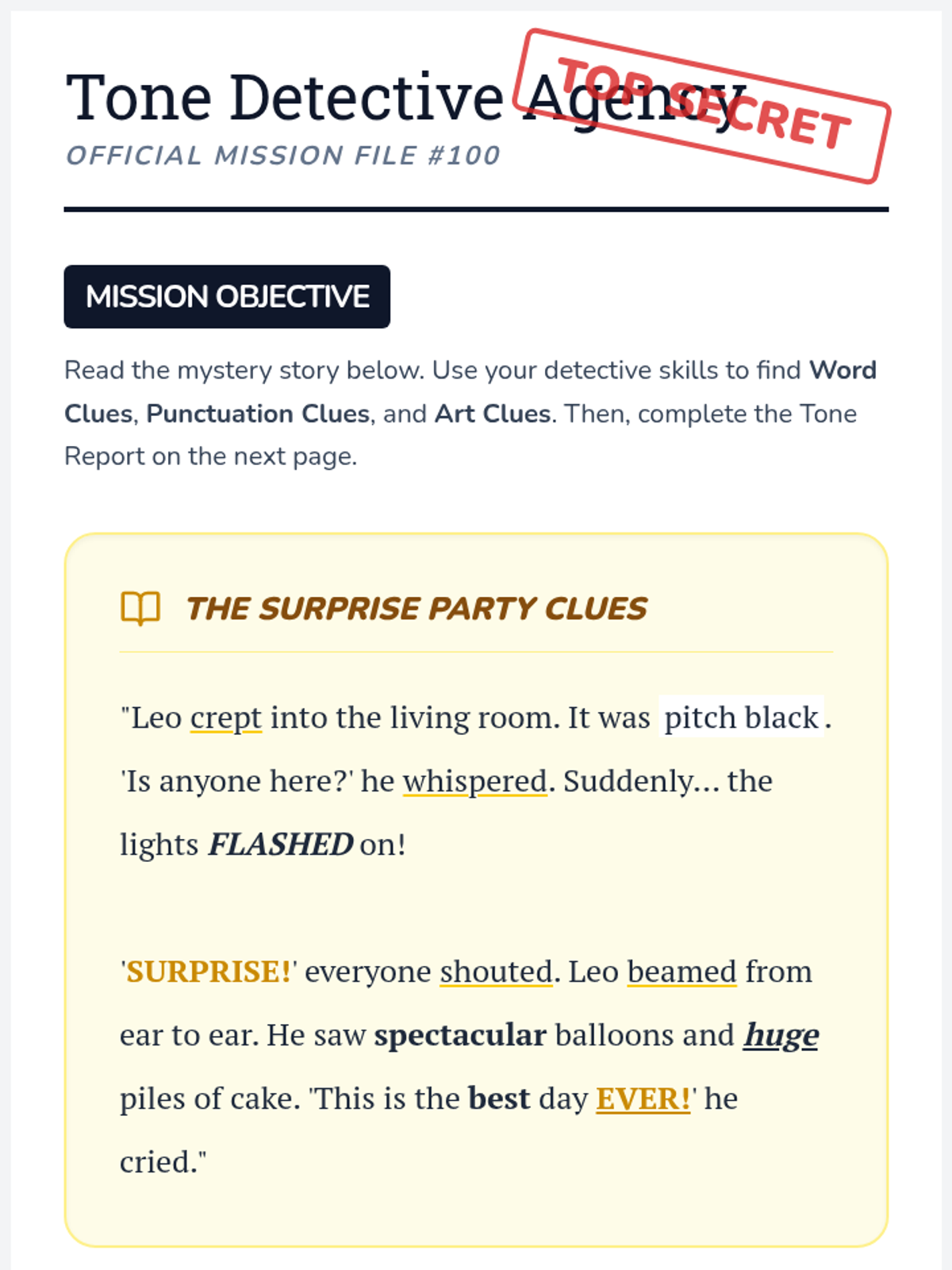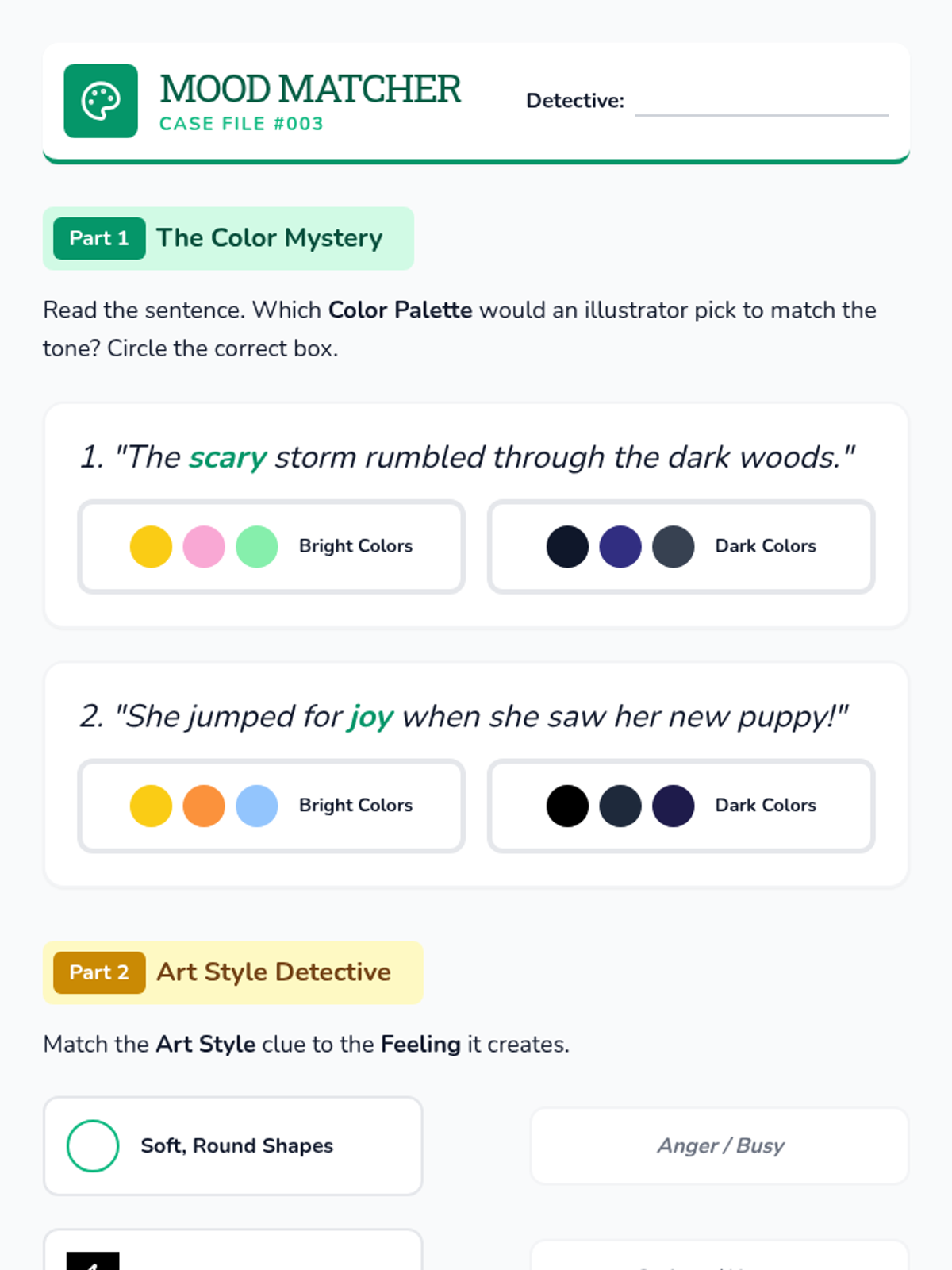 A 2nd-grade ELA sequence exploring how authors use specific word choices, punctuation, and illustrations to convey tone and emotion in their writing. Students progress from identifying simple emotion words to synthesizing evidence to determine the mood of a text.
