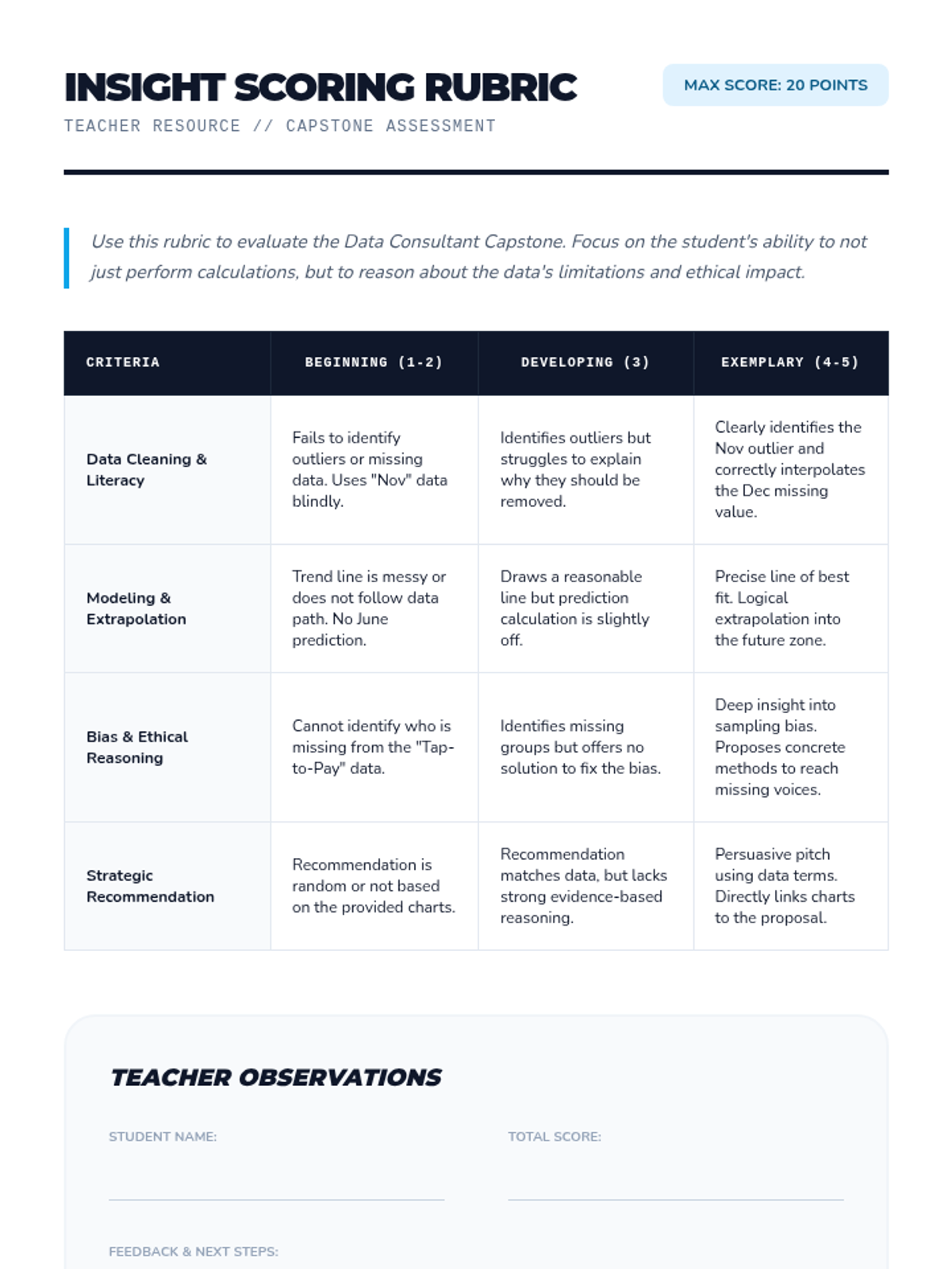 Students move from describing data to interpreting and modeling it. They explore correlation vs. causation, trend lines, predictive modeling, and the ethics of data bias using real-world datasets and case studies.