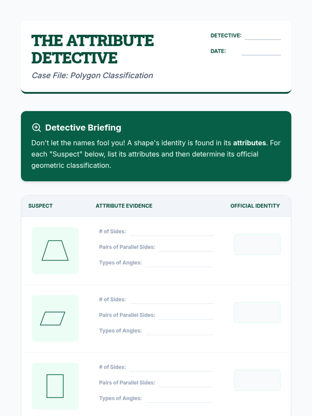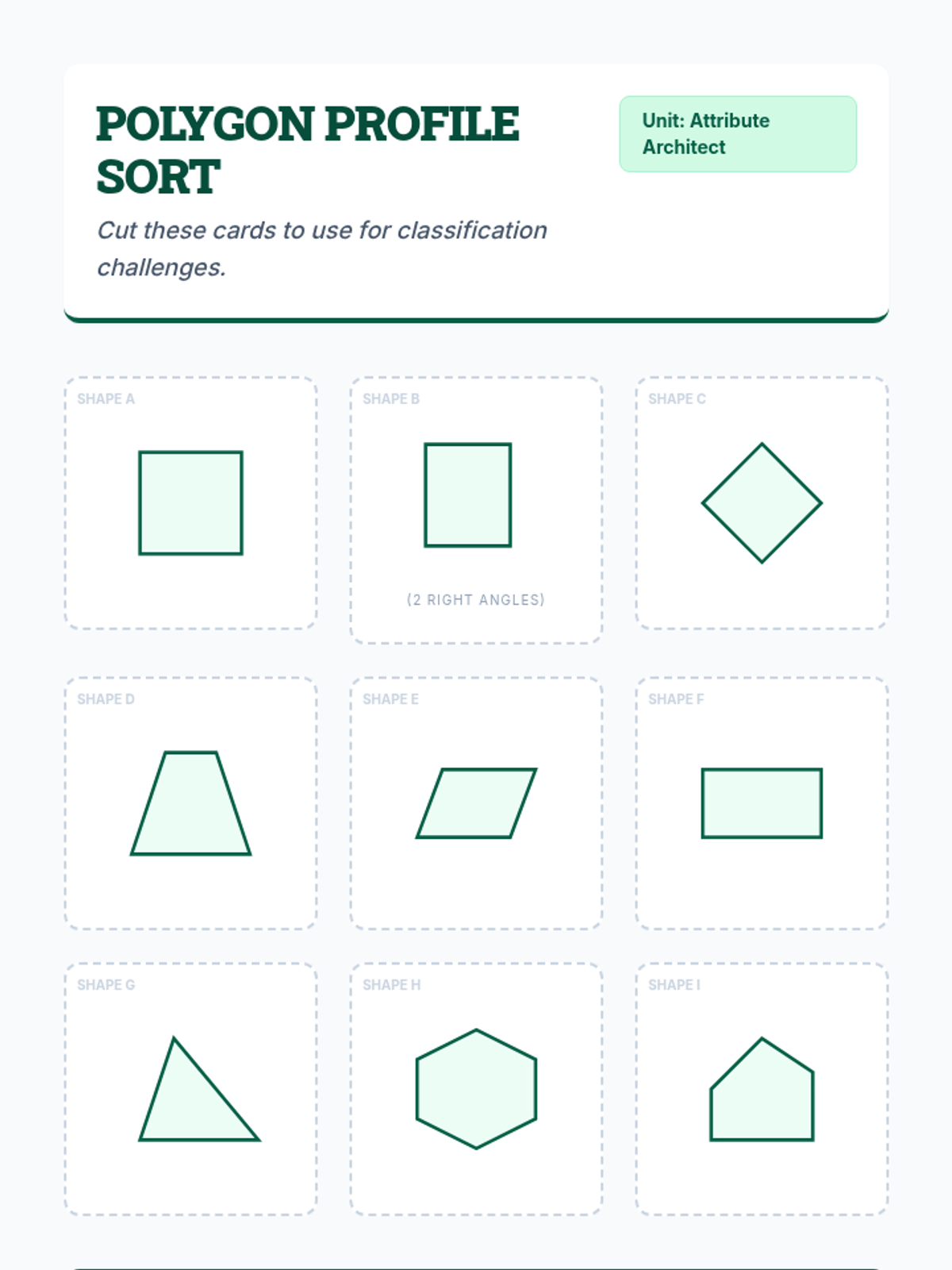 A mastery-based sequence focusing on the logical hierarchy of geometric shapes, addressing complex classifications and property-based definitions through Venn diagrams and logic puzzles.