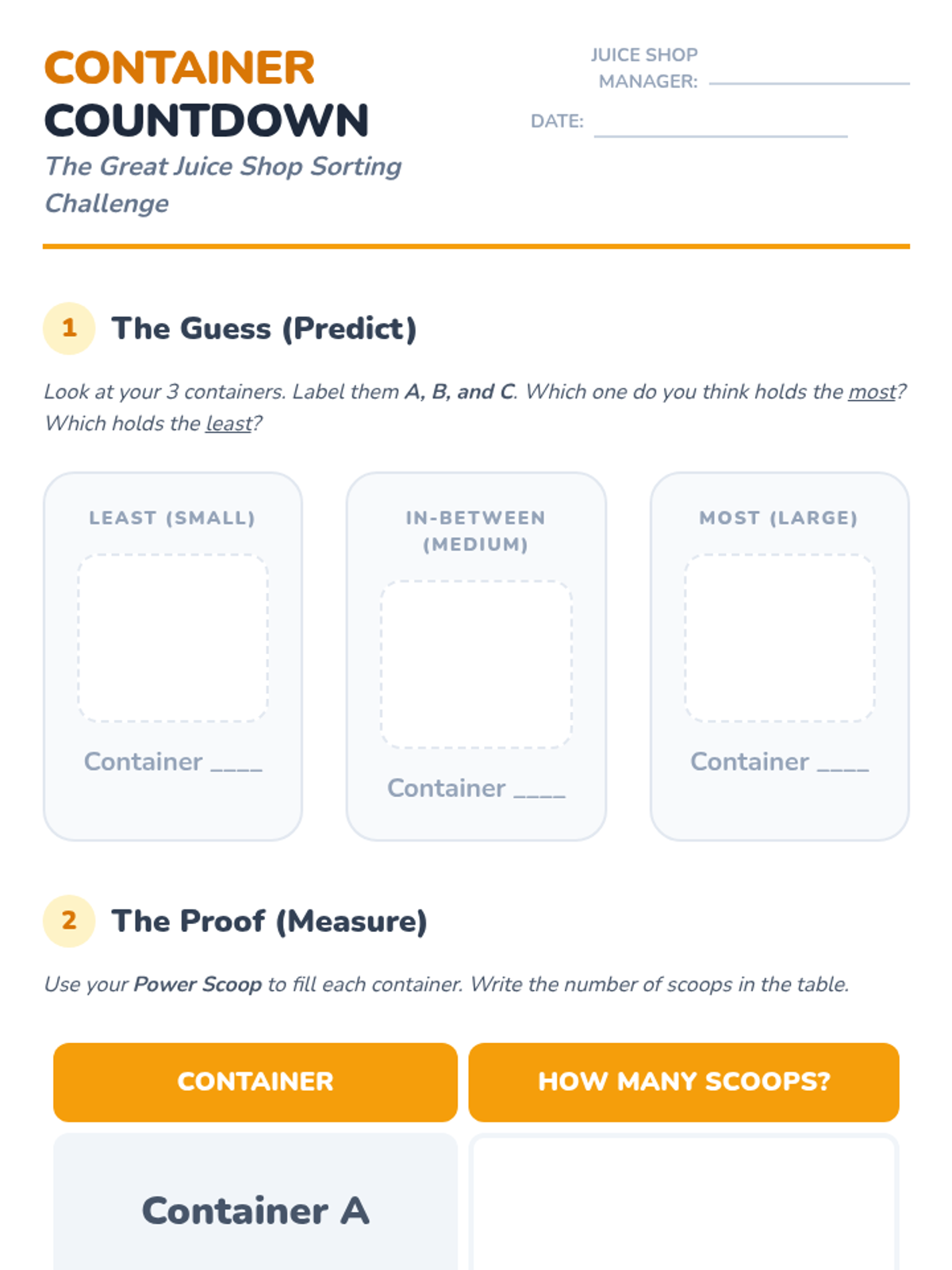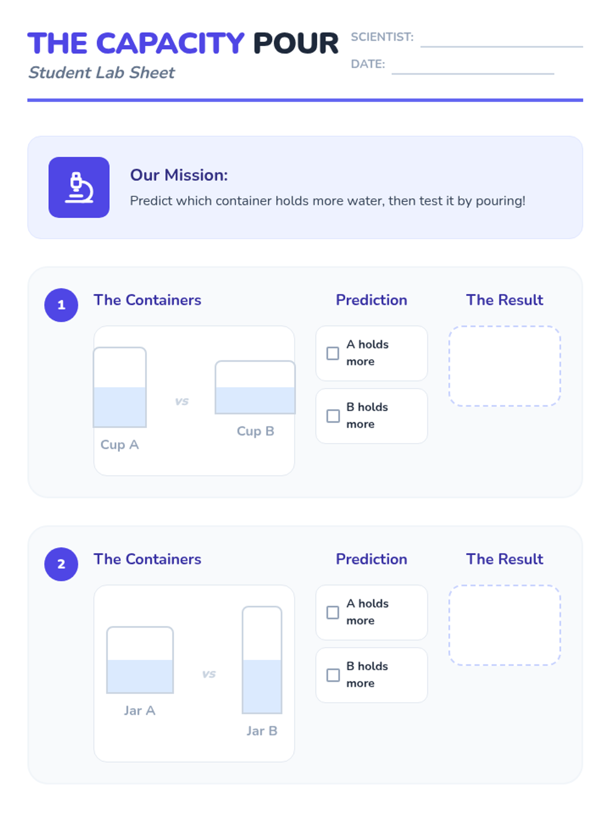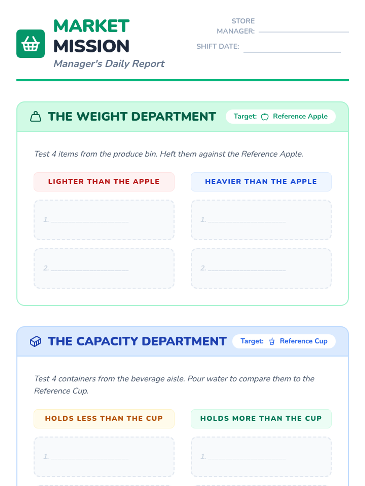 A hands-on exploration of weight and capacity for 1st-grade students, focusing on sensory 'hefting', visual verification with scales, and volume comparison through pouring and counting units. Students conclude with a marketplace simulation to apply their skills in a real-world context.