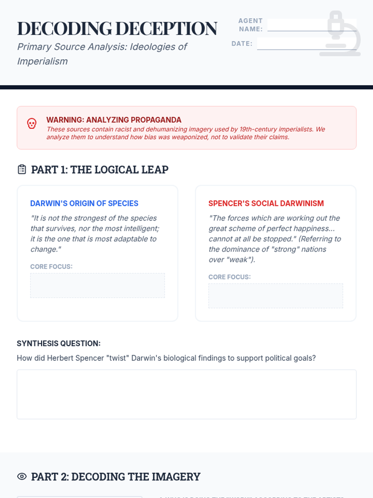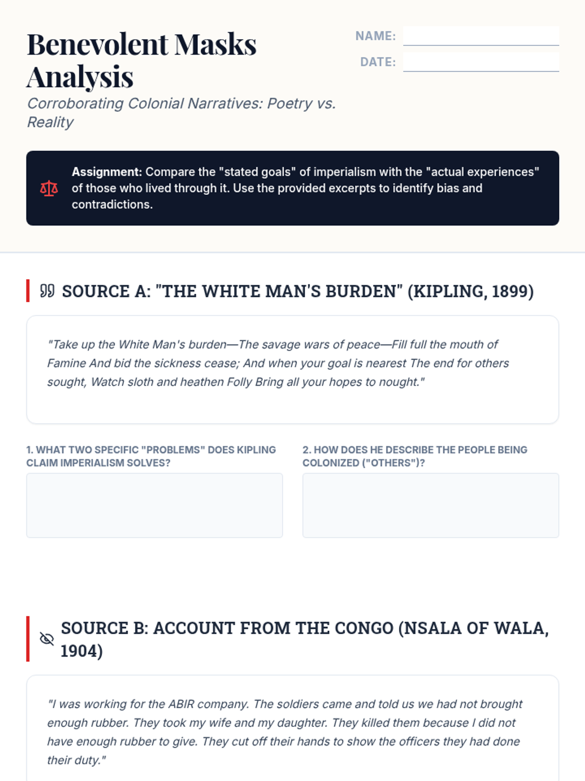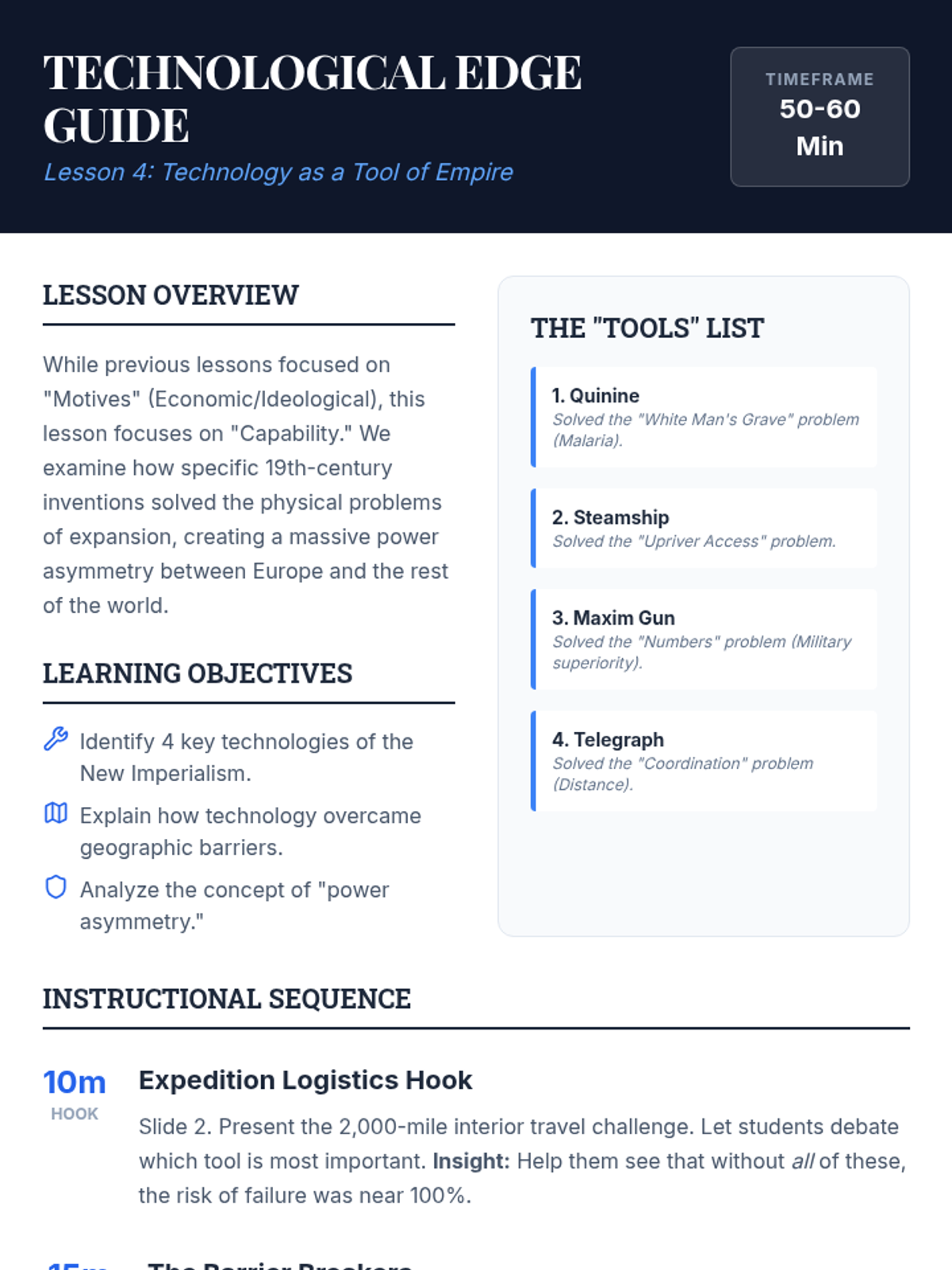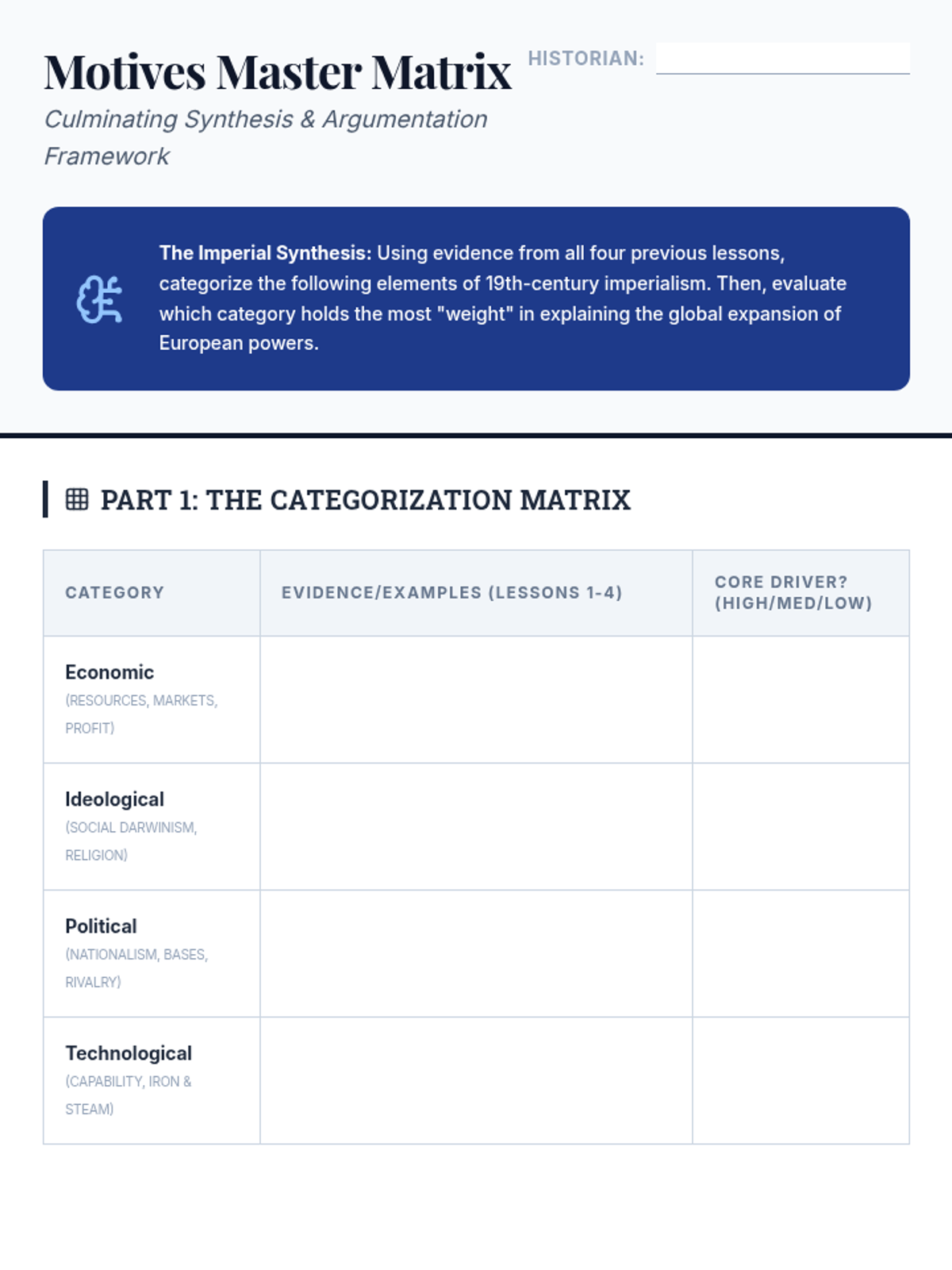 A 5-lesson sequence for 9th-grade students exploring the economic, ideological, and technological drivers of 19th-century imperialism. Students analyze the shift from industrial needs to pseudo-scientific justifications and evaluate the human impact through primary source analysis.