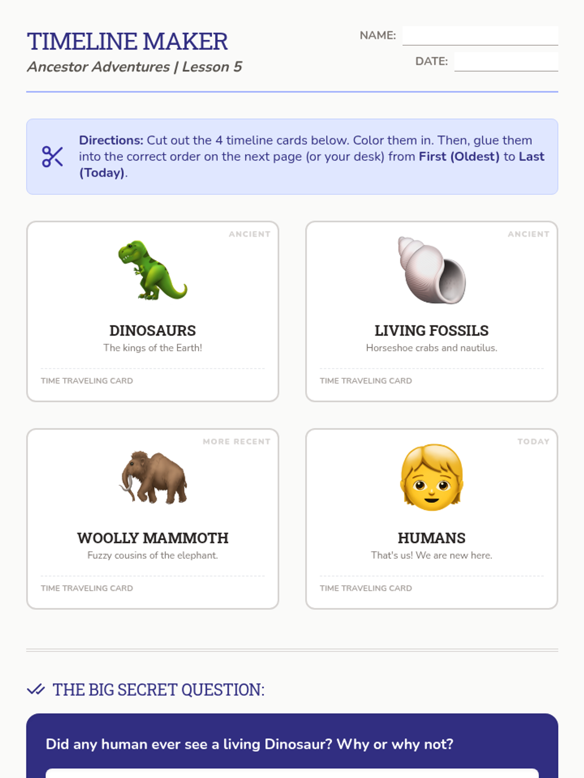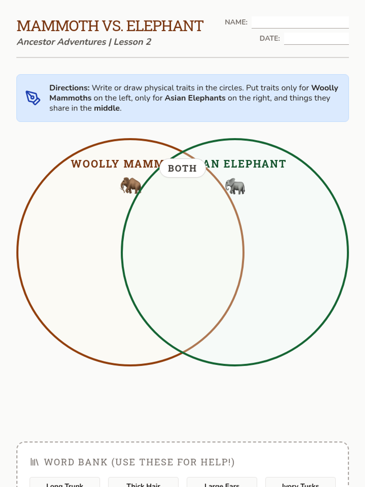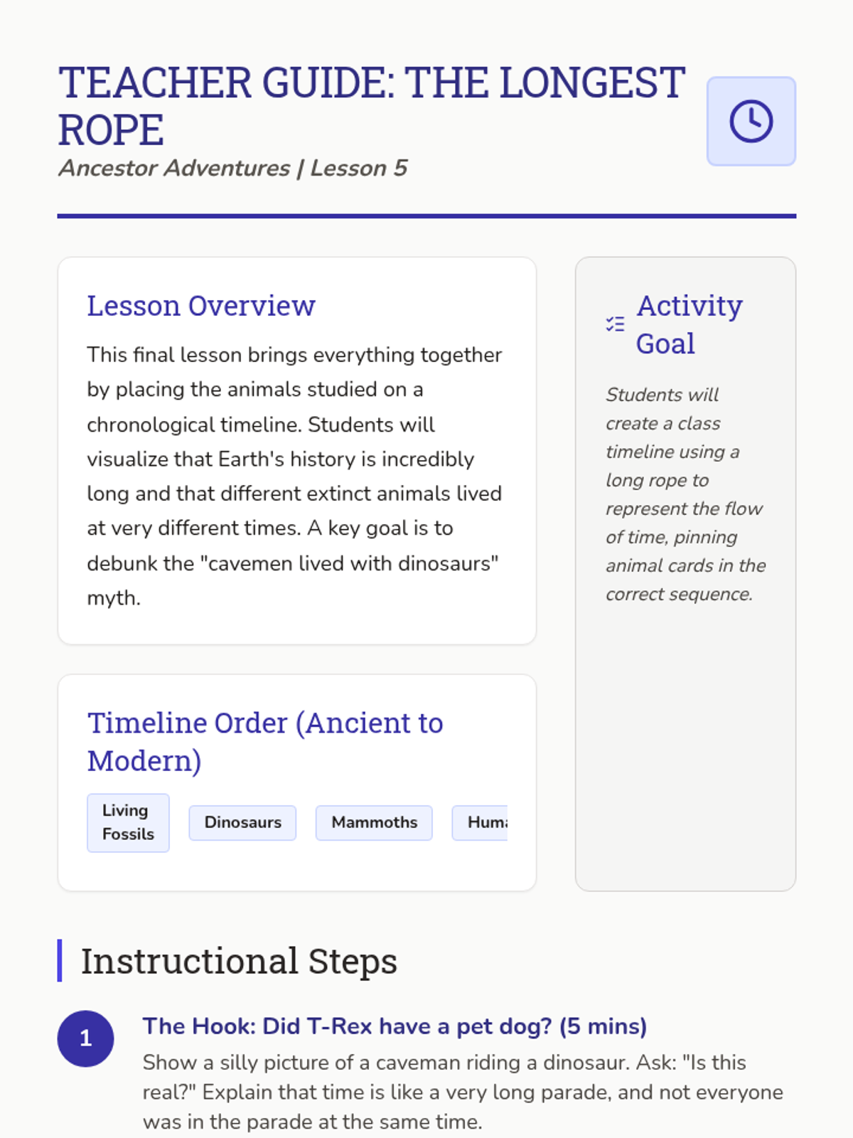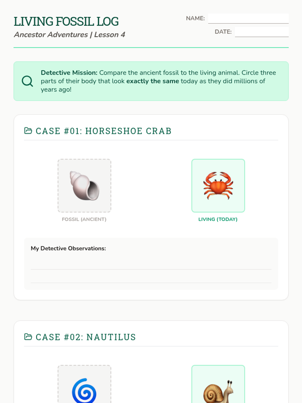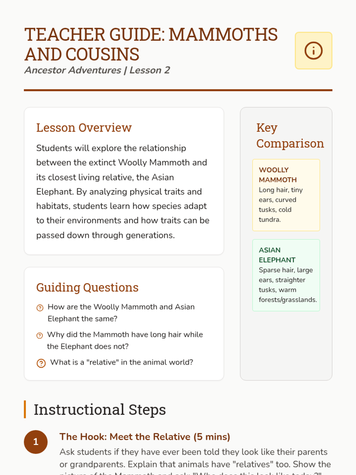 This sequence connects the ancient past to the present by comparing extinct animals with their modern relatives. Students analyze similarities and differences in anatomy and behavior to understand continuity of life and evolutionary concepts through case studies like Mammoths and Megalodons.