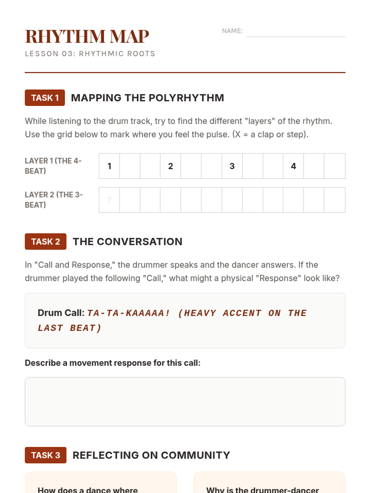 This sequence explores the anthropological roots of dance, focusing on how indigenous cultures use movement for ritual, storytelling, and community. Students analyze traditions from Maori, Hawaiian, and West African cultures to understand the sacred and social functions of dance.