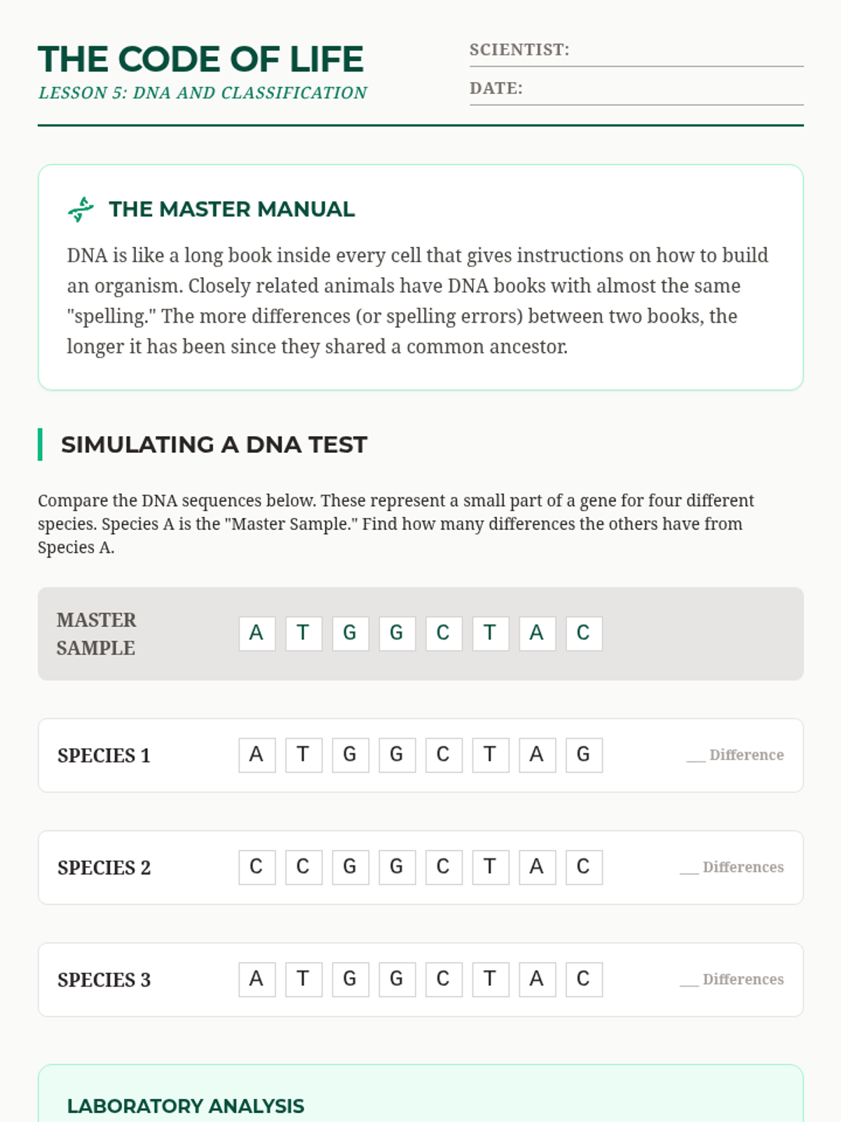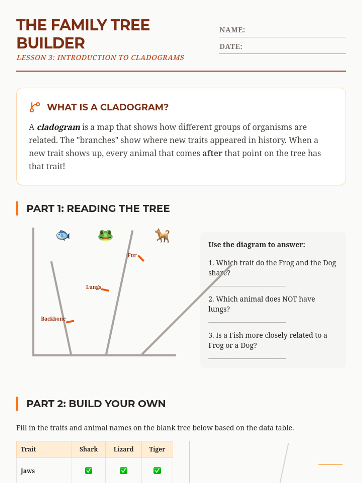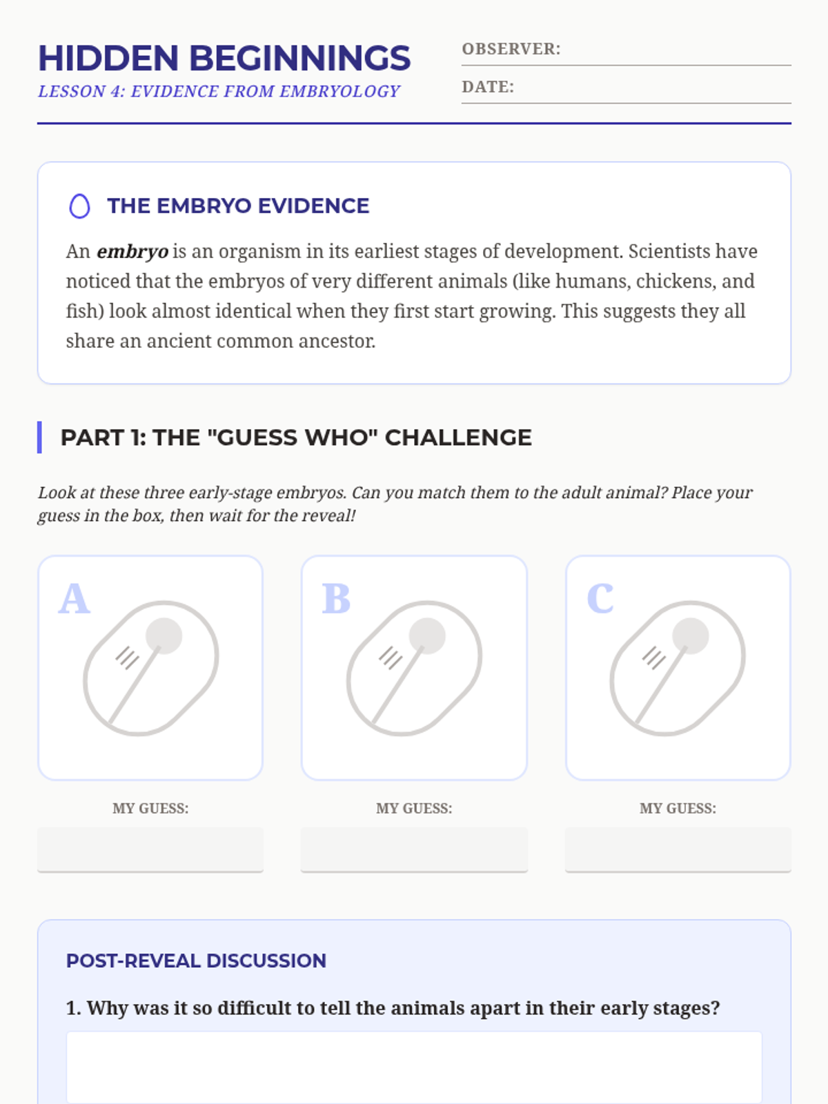 This 5th-grade biology sequence explores classification through the lens of shared ancestry and evolutionary history. Students move beyond superficial appearances to analyze homologous structures, simple cladograms, embryonic development, and basic genetic similarities to understand how living things are related.