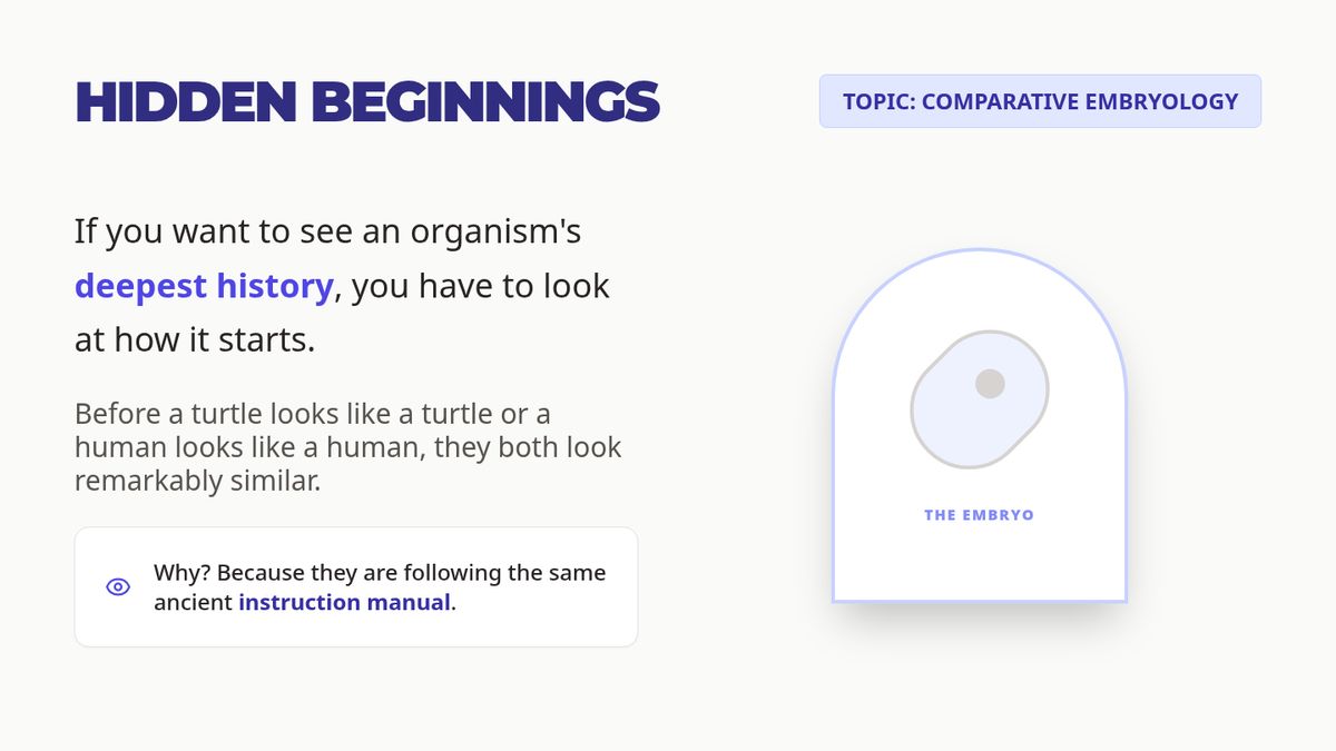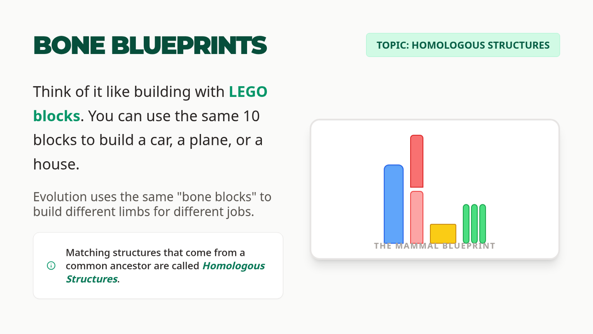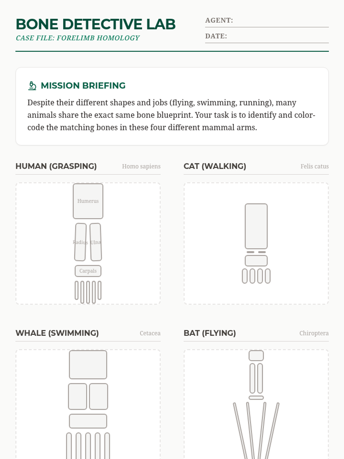 This 5th-grade biology sequence explores classification through the lens of shared ancestry and evolutionary history. Students move beyond superficial appearances to analyze homologous structures, simple cladograms, embryonic development, and basic genetic similarities to understand how living things are related.