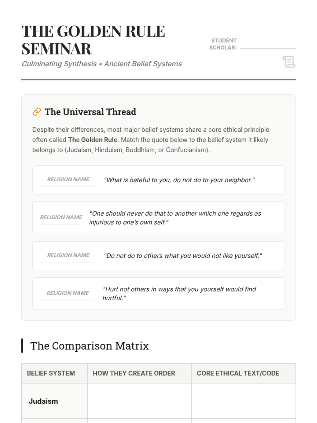 A comparative study of Judaism, Hinduism, Buddhism, and Confucianism, focusing on how these belief systems provided ethical codes and social order in the ancient world.