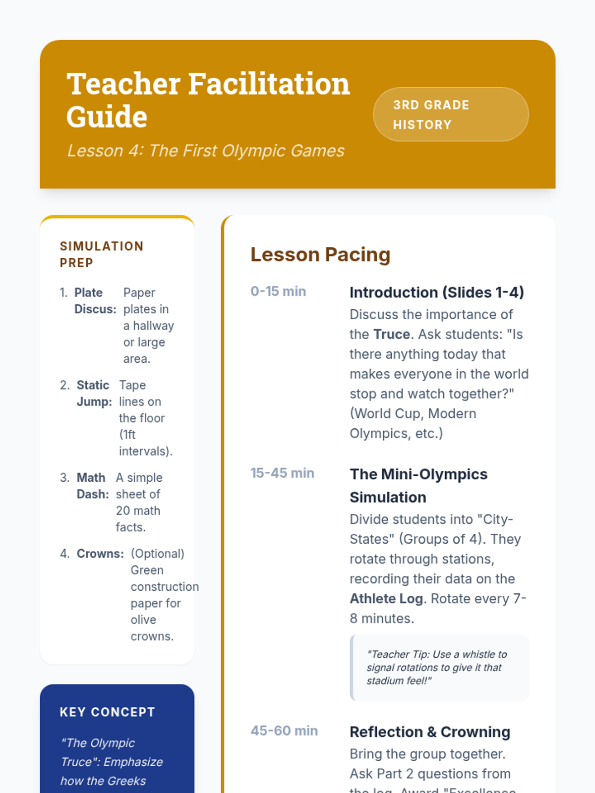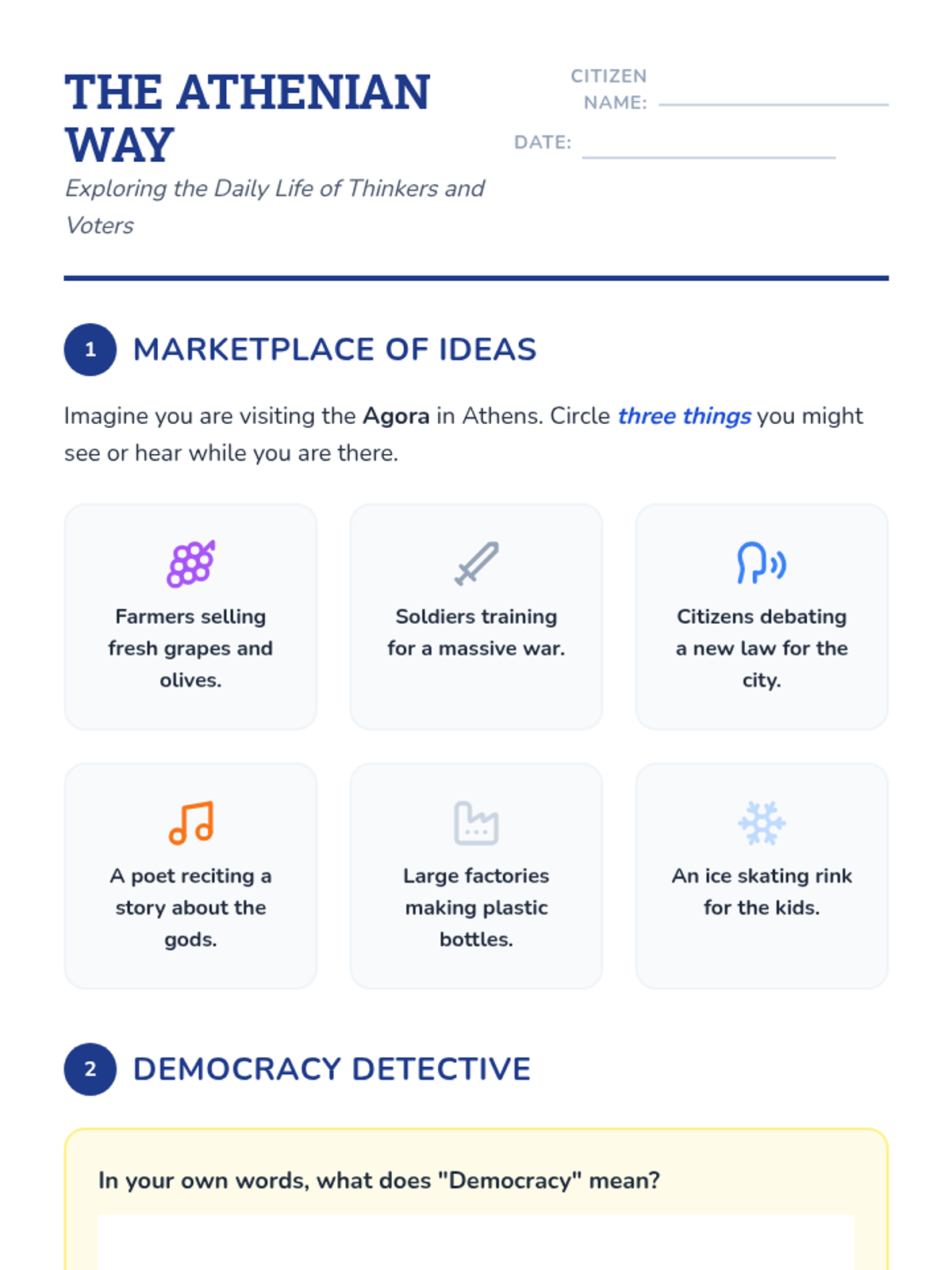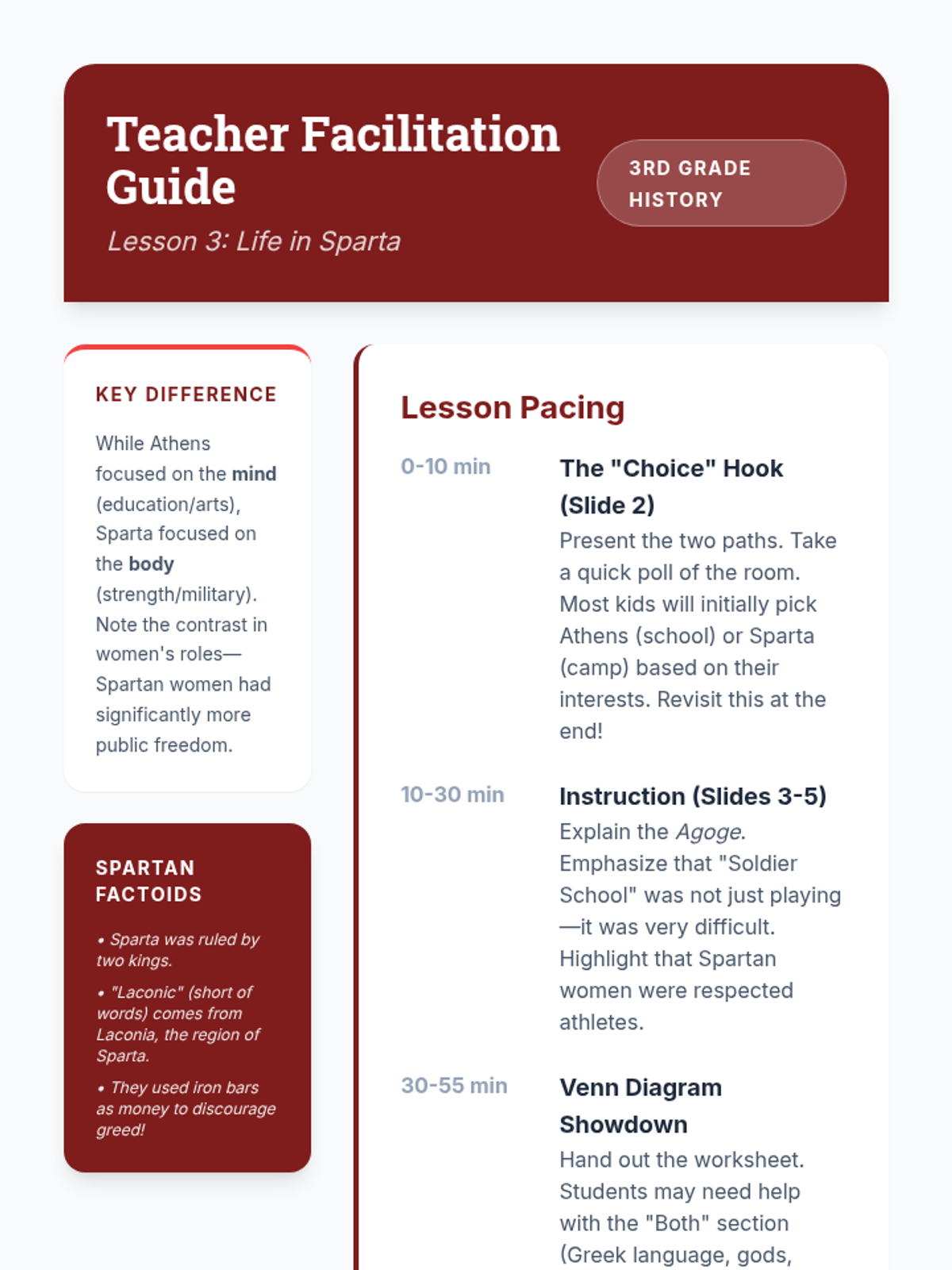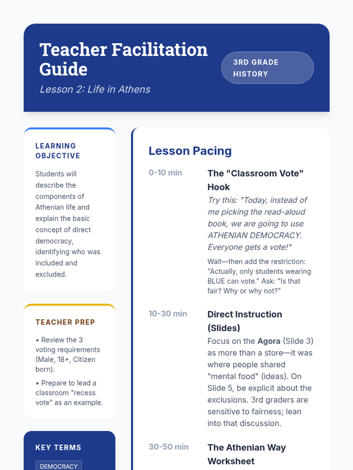 A 3rd-grade sequence exploring the geography, governance, and daily life of Ancient Greece, specifically contrasting Athens and Sparta. Students learn how mountainous geography led to isolated city-states and investigate the origins of democracy and the Olympics.