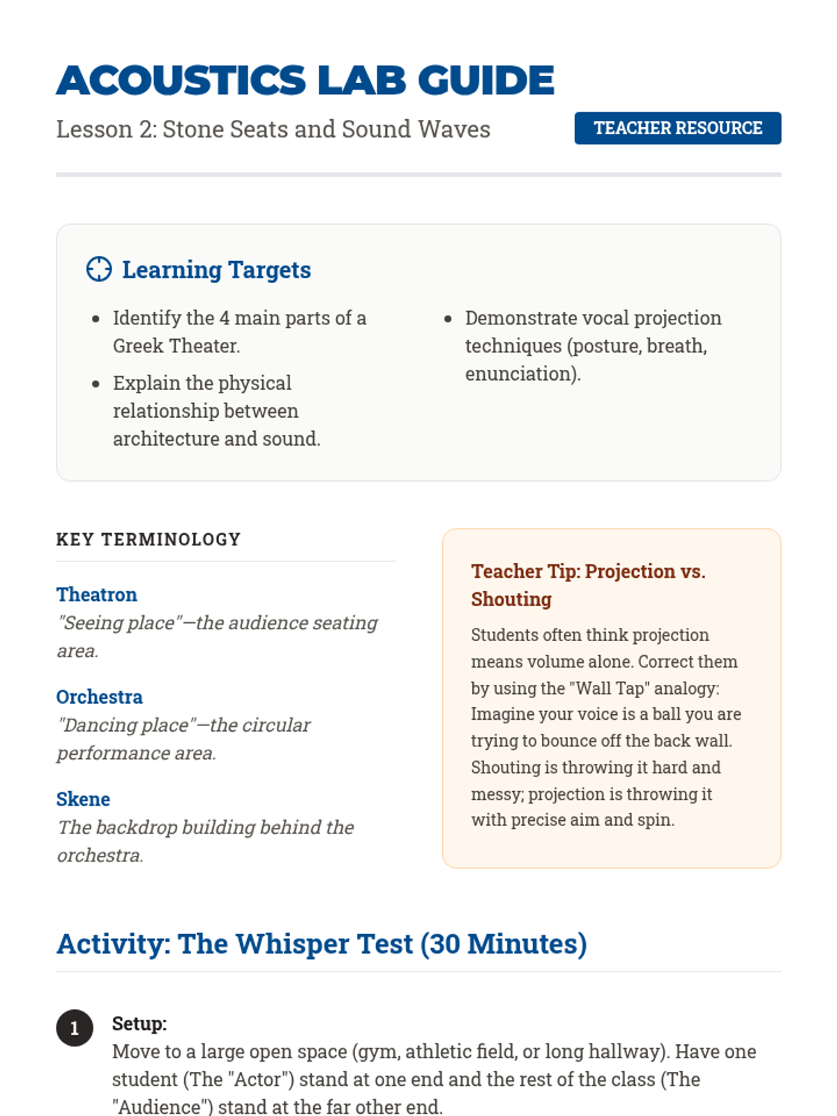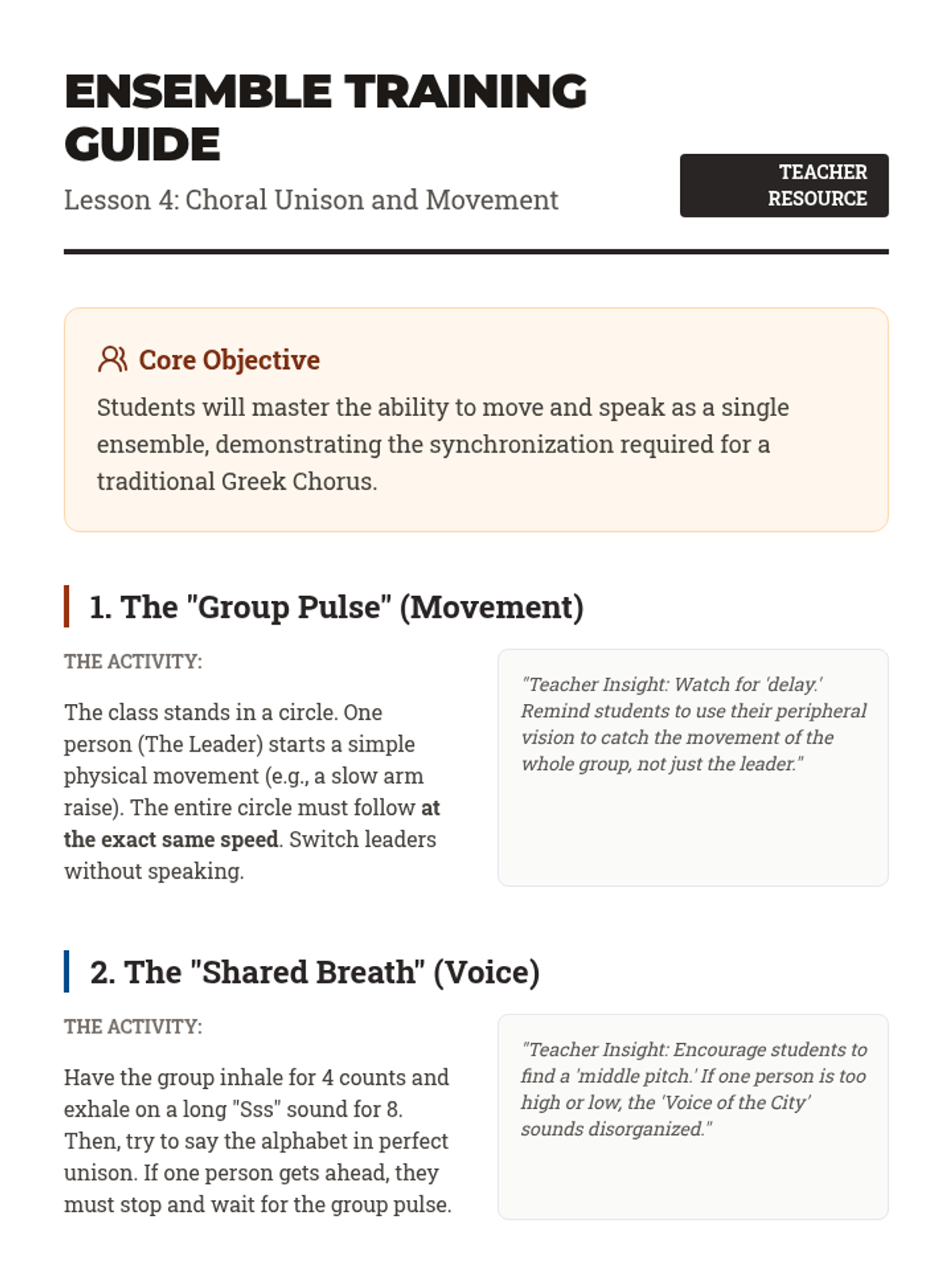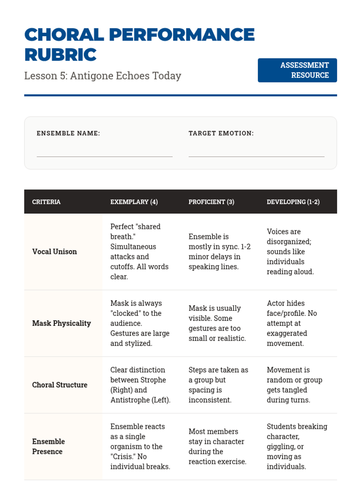 A comprehensive unit for 7th graders exploring the architecture, rituals, and performance techniques of Ancient Greek theater, culminating in a choral performance.