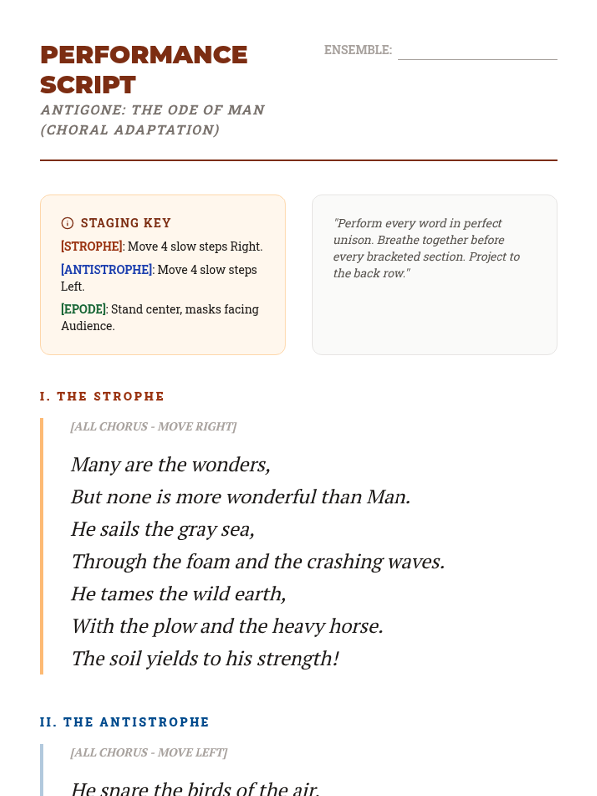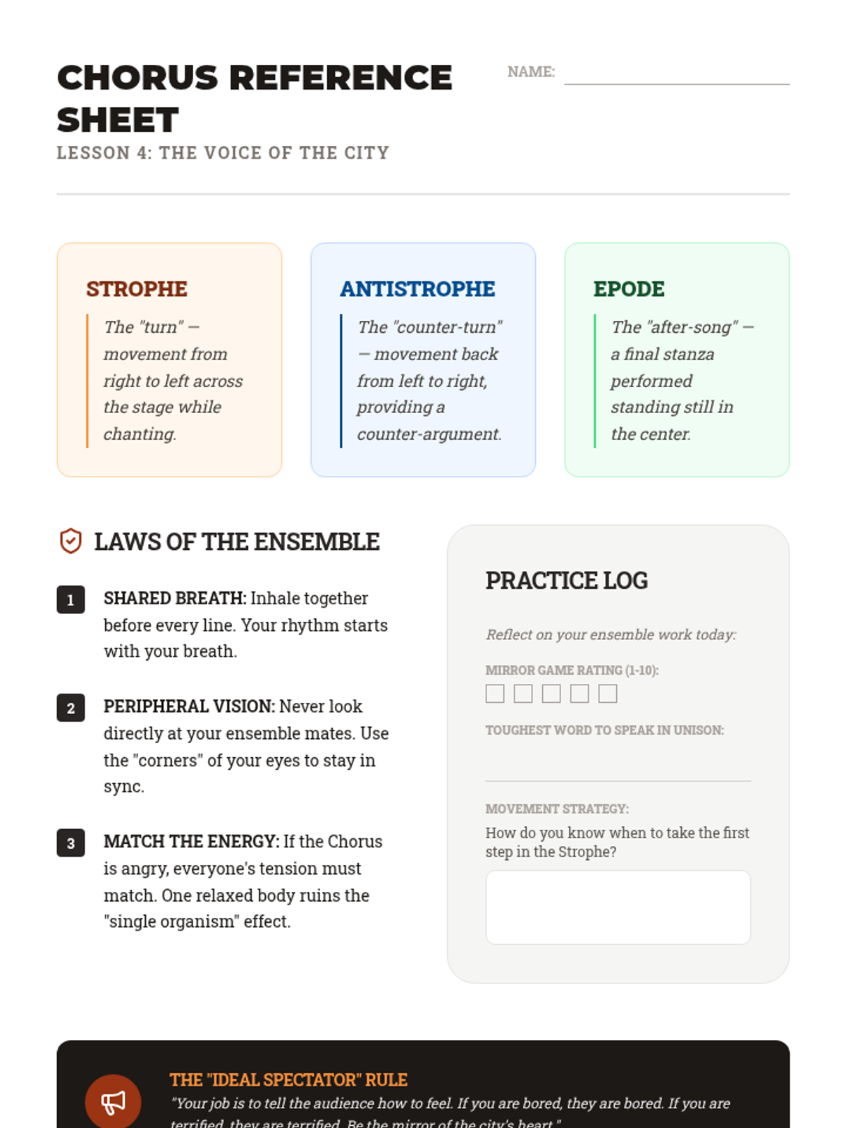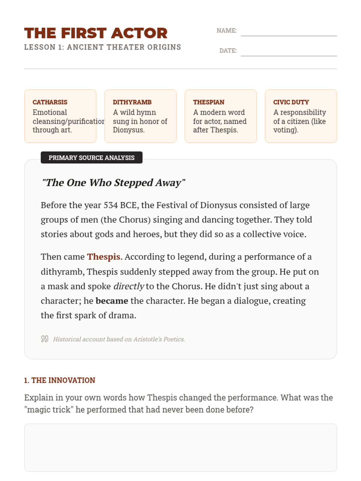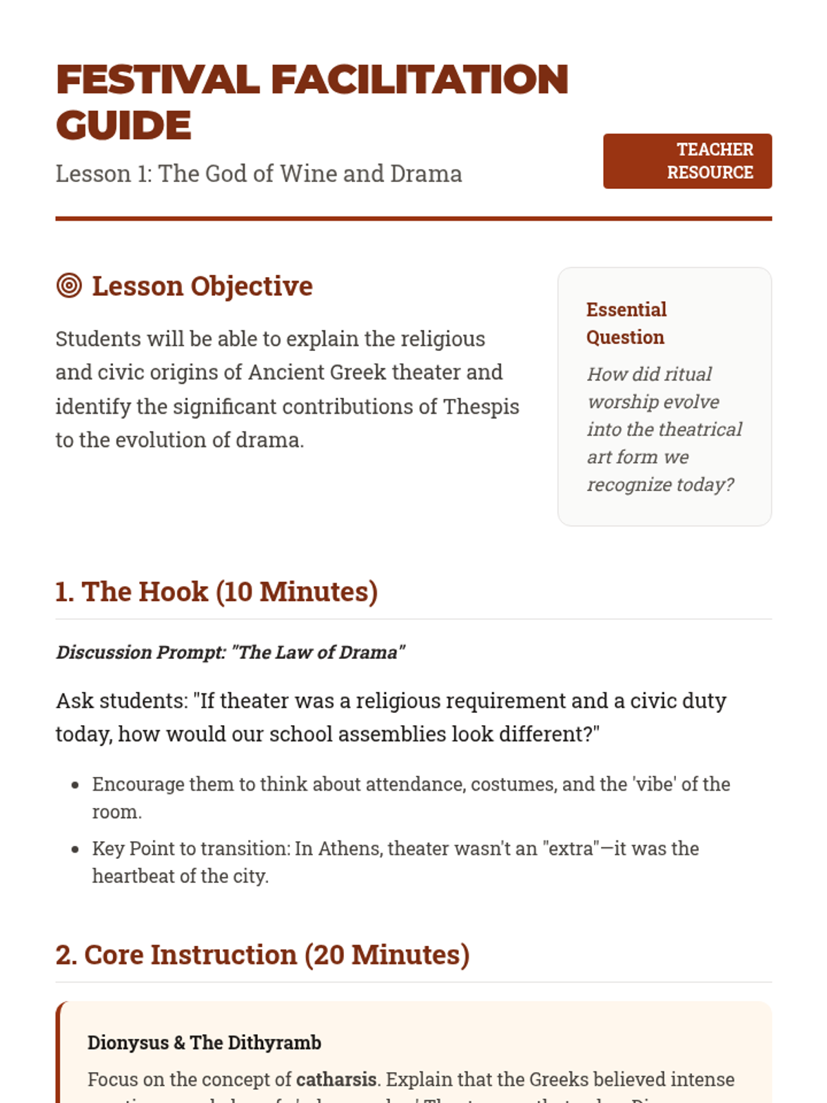A comprehensive unit for 7th graders exploring the architecture, rituals, and performance techniques of Ancient Greek theater, culminating in a choral performance.