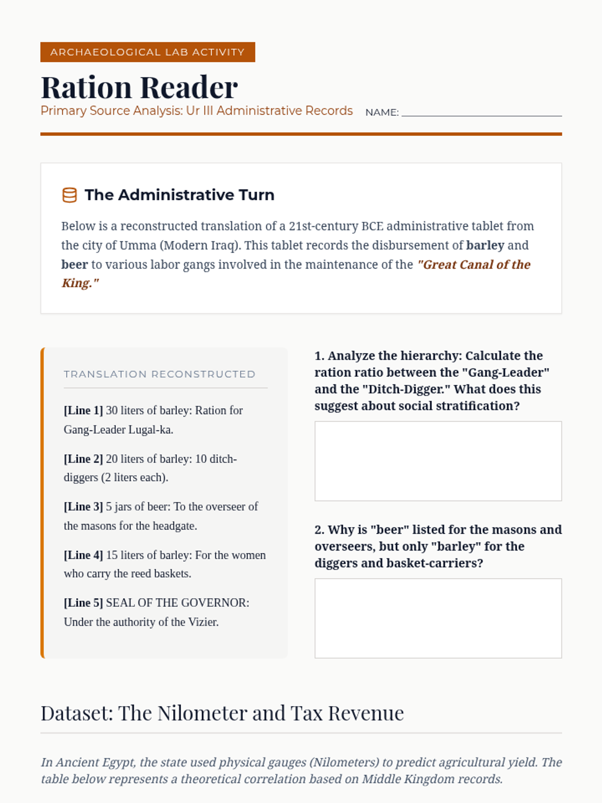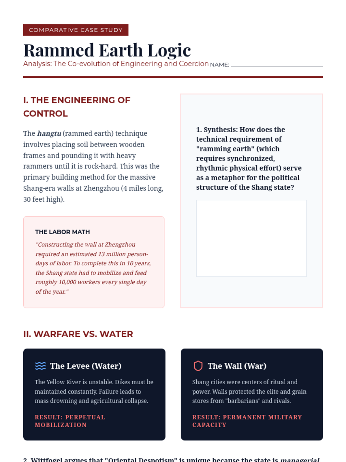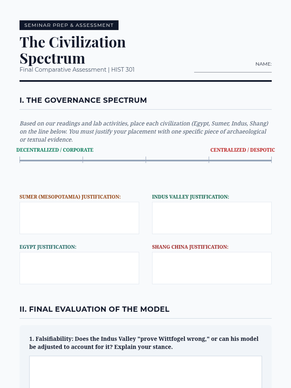 An undergraduate-level sequence exploring the correlation between water management and political centralization in ancient Egypt, Mesopotamia, the Indus Valley, and Shang China, using Karl Wittfogel's 'Hydraulic State' model as a critical framework.
