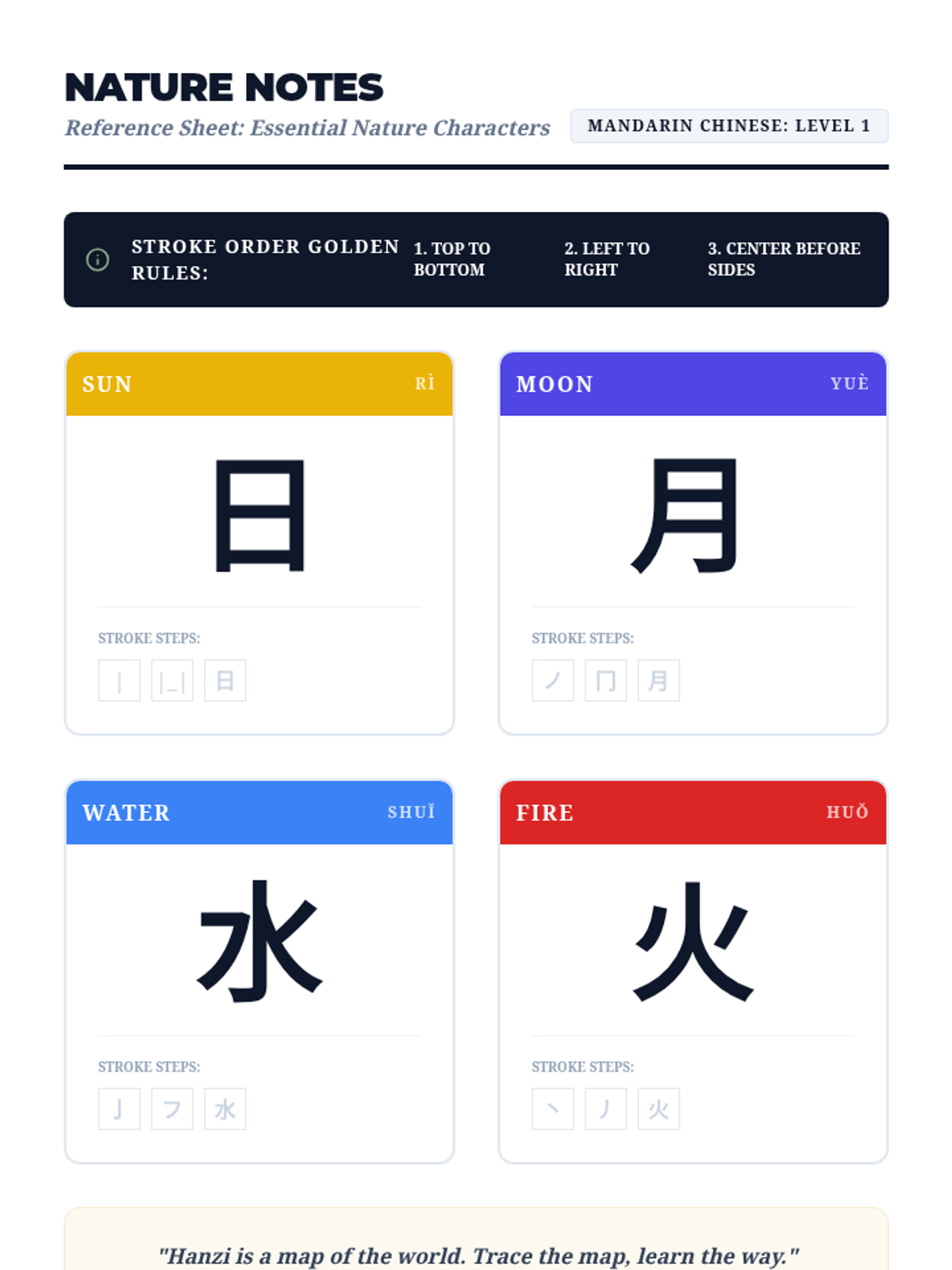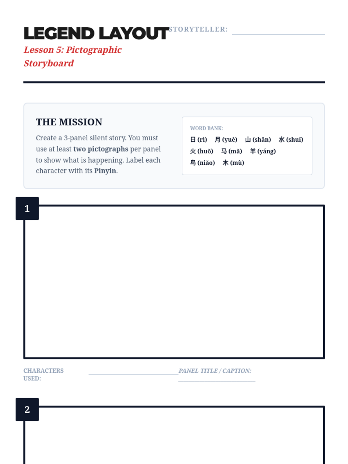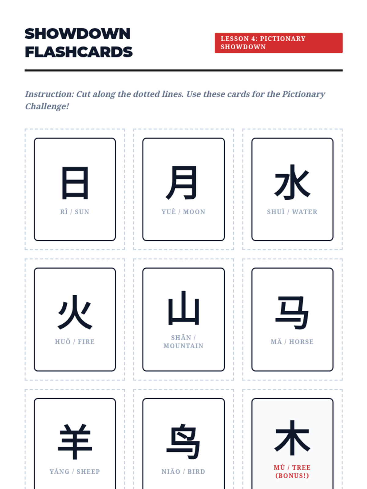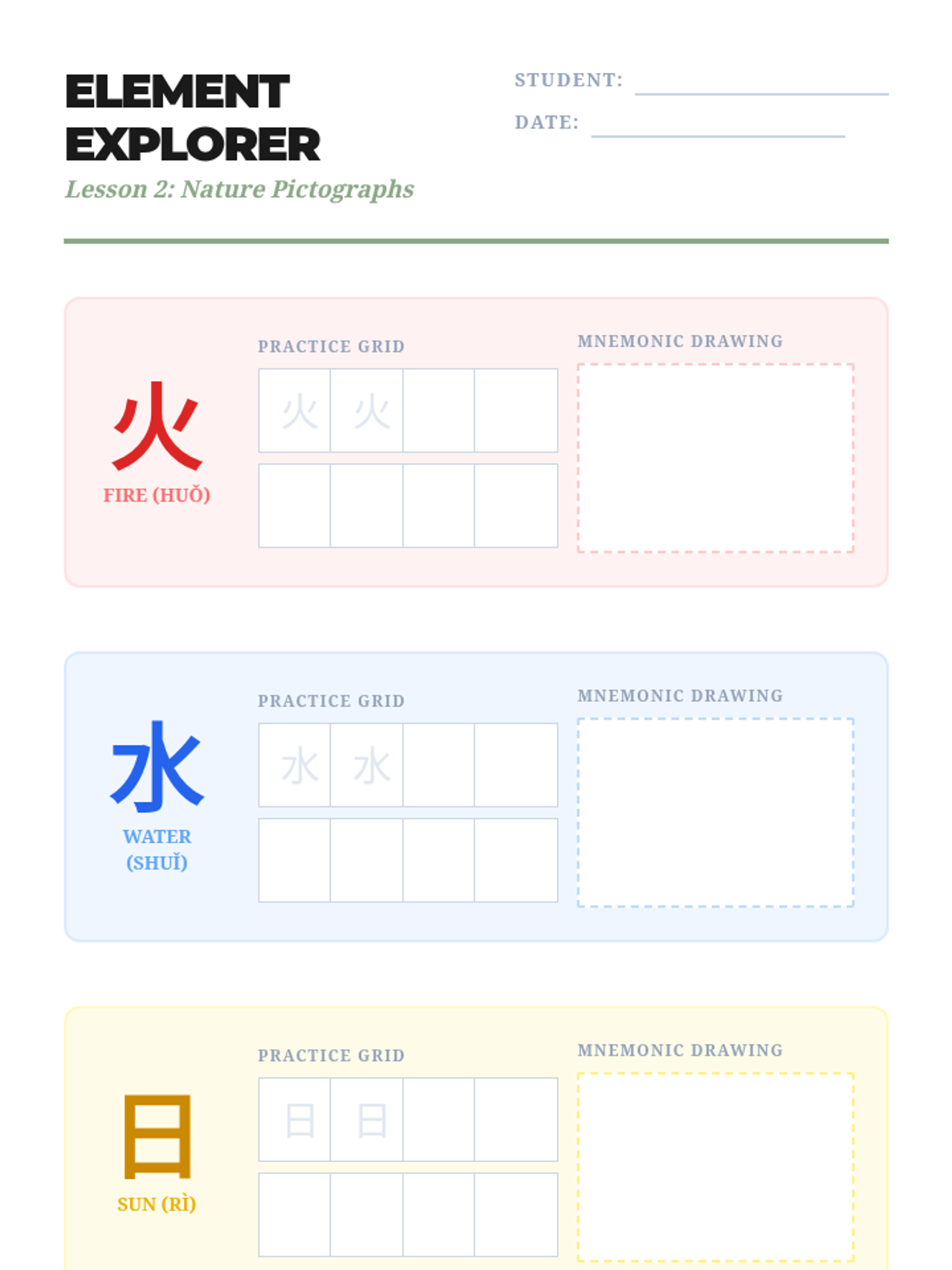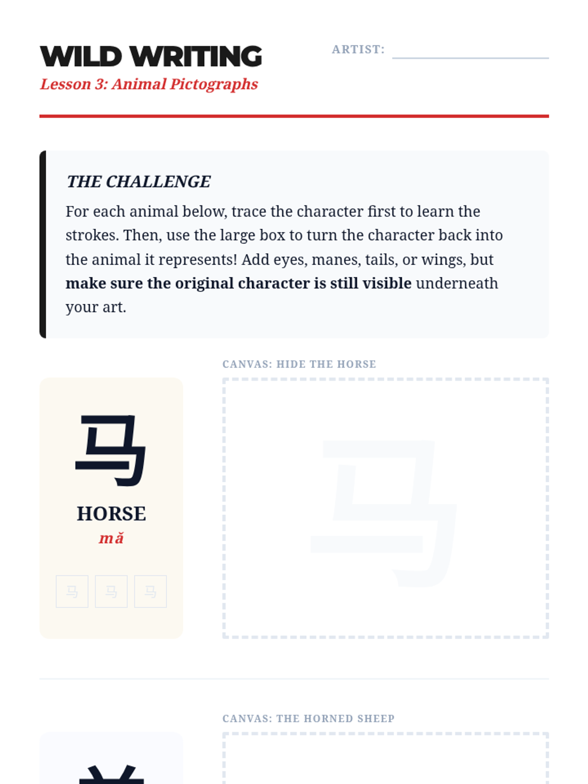 Students explore the pictographic evolution of Mandarin Chinese characters, tracing modern symbols back to ancient Oracle Bone script. The sequence focuses on nature and animal characters, helping students build visual associations and mnemonics to master basic Hanzi.