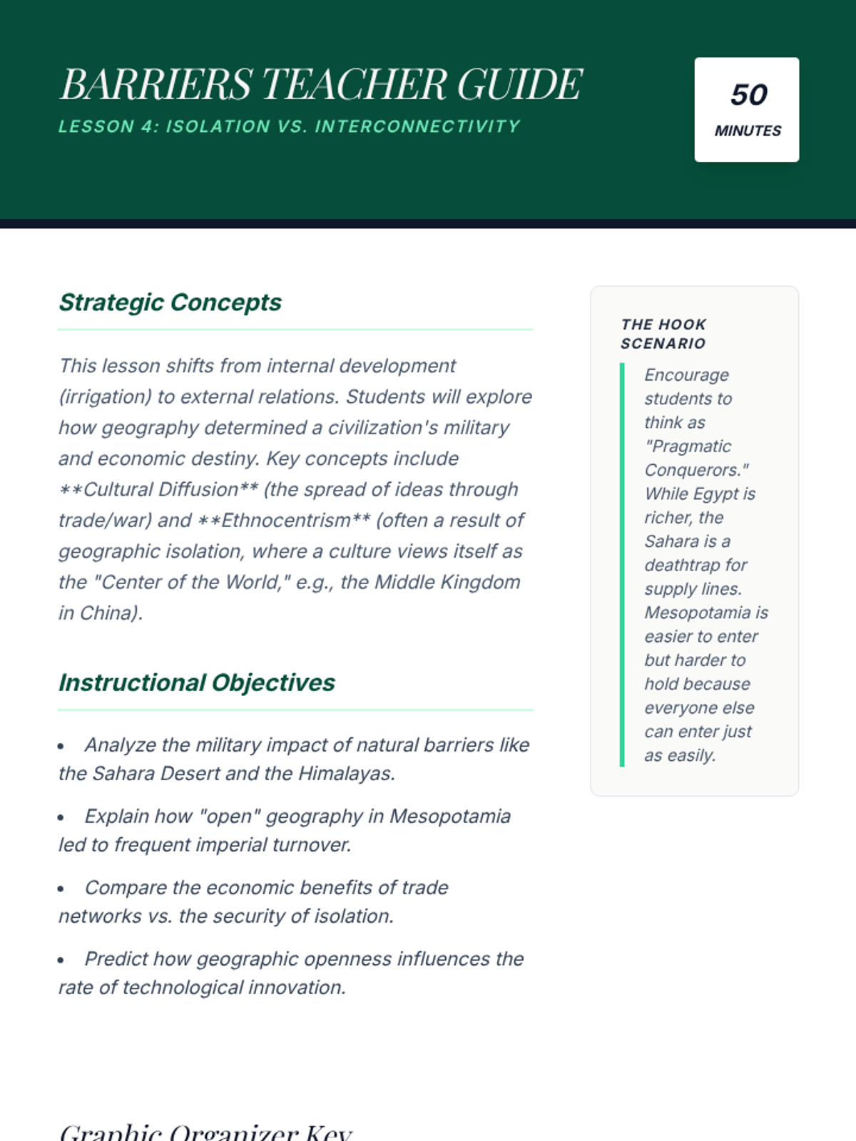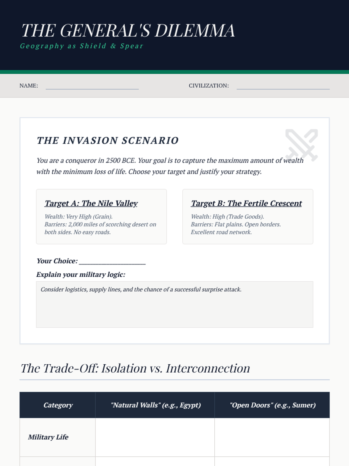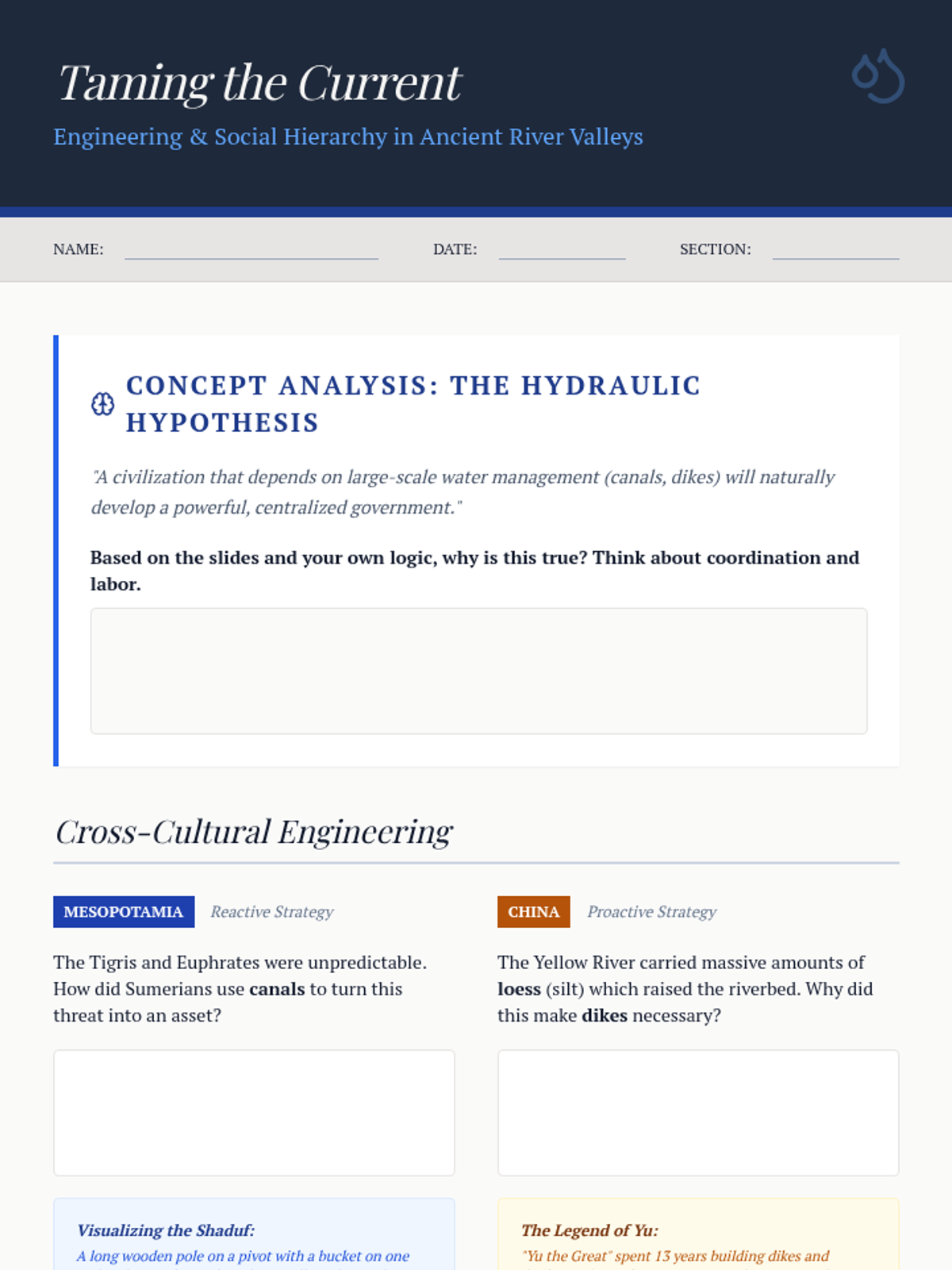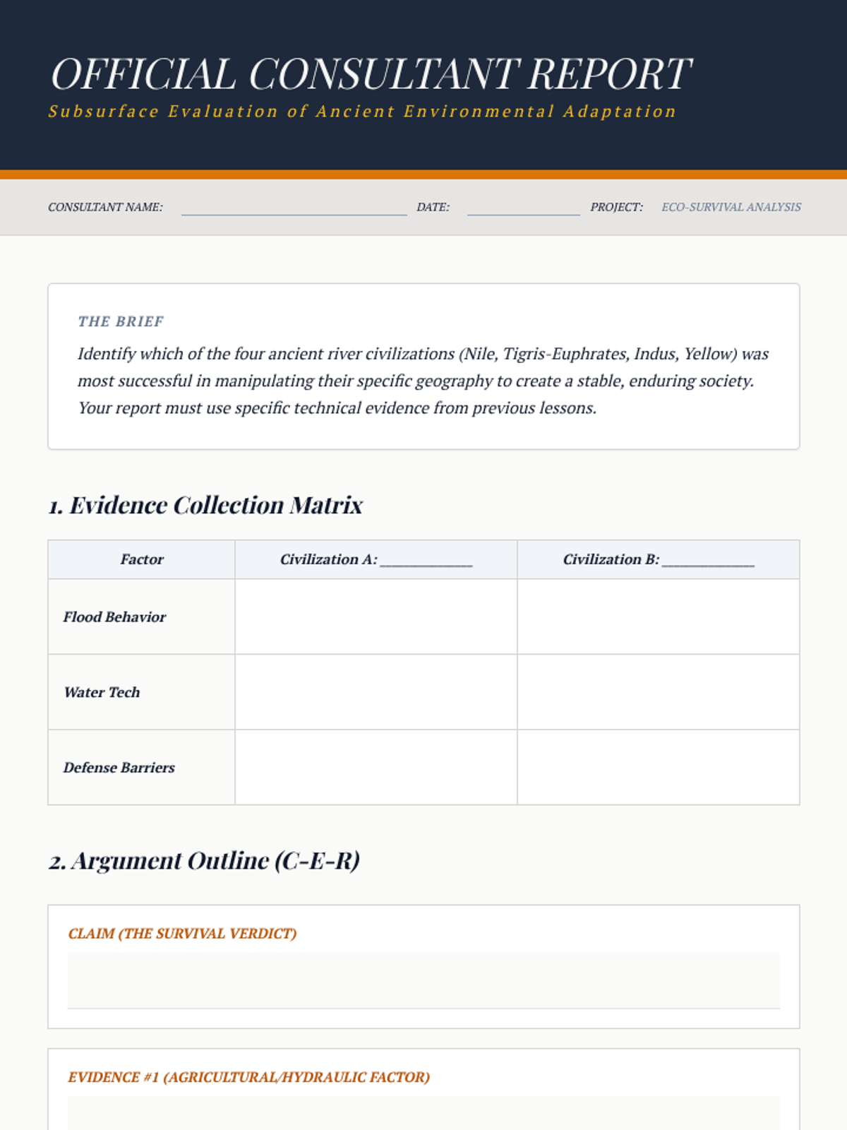 This unit explores the interplay between geography and the development of the four major river valley civilizations: the Nile, Tigris-Euphrates, Indus, and Yellow Rivers. Students analyze how environmental predictability and natural barriers influenced agricultural success, societal structure, and cultural outlooks.