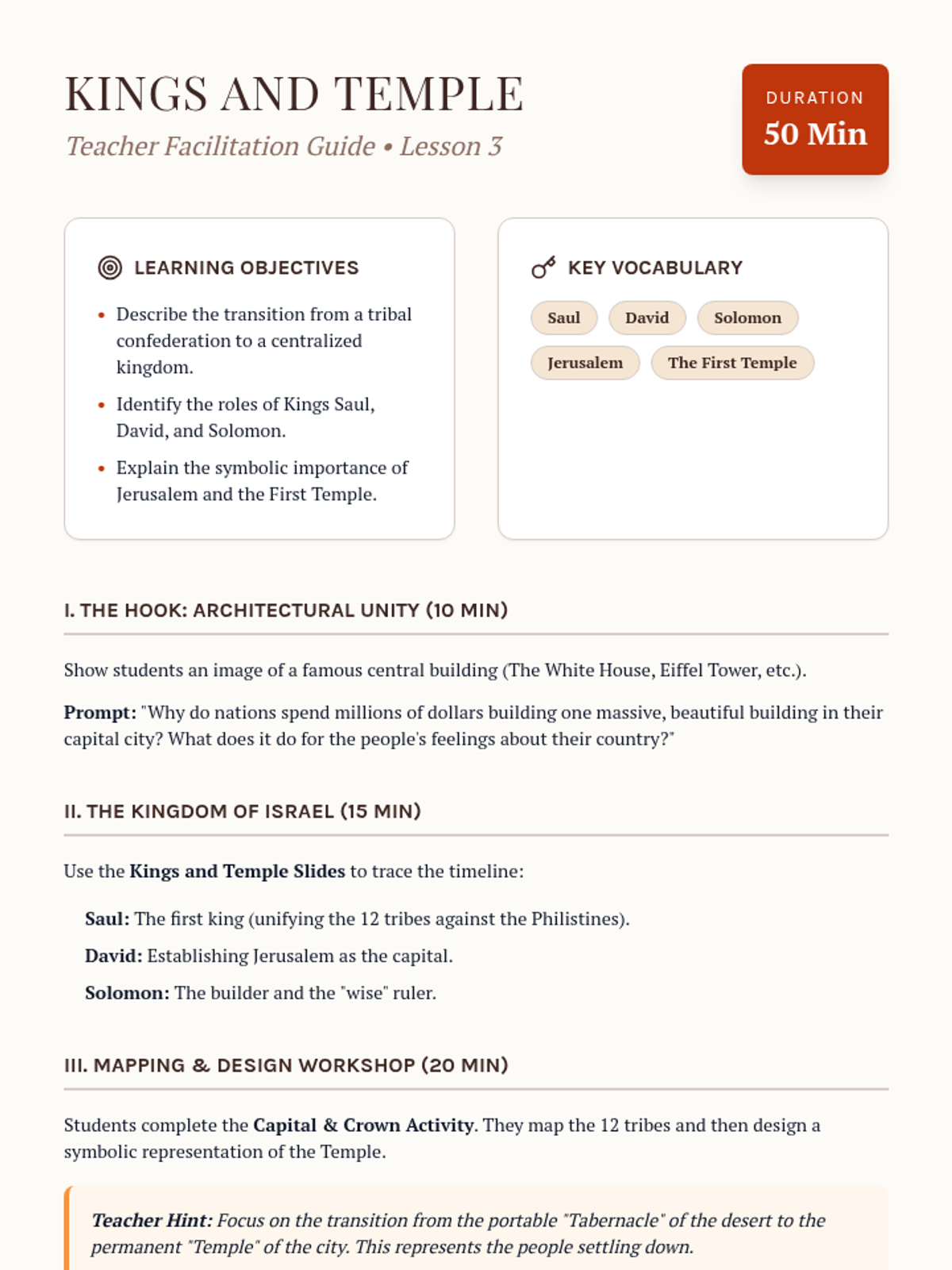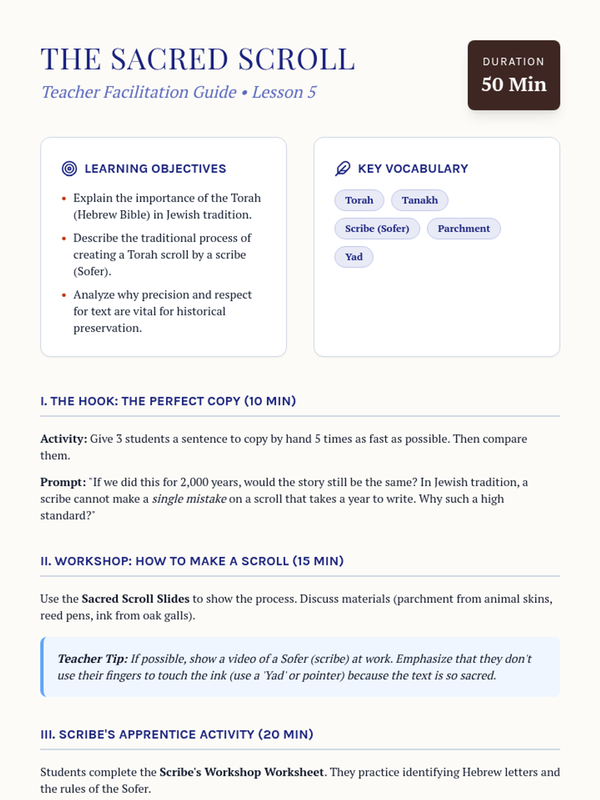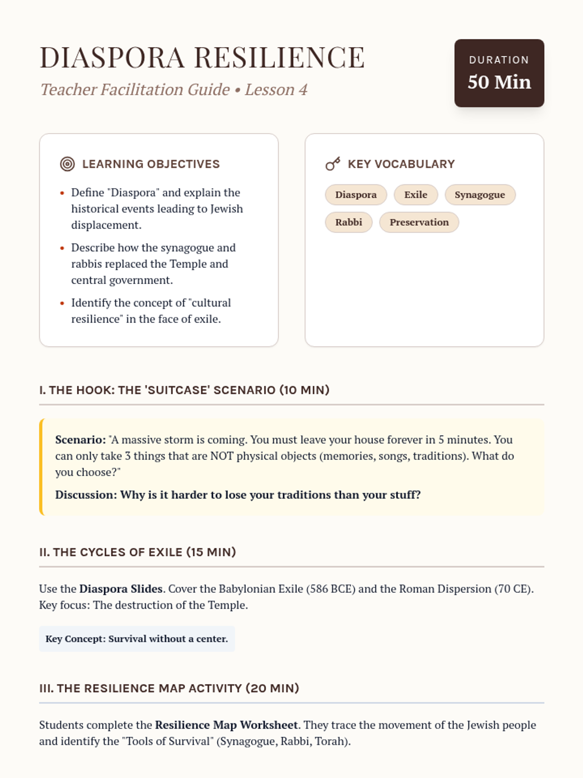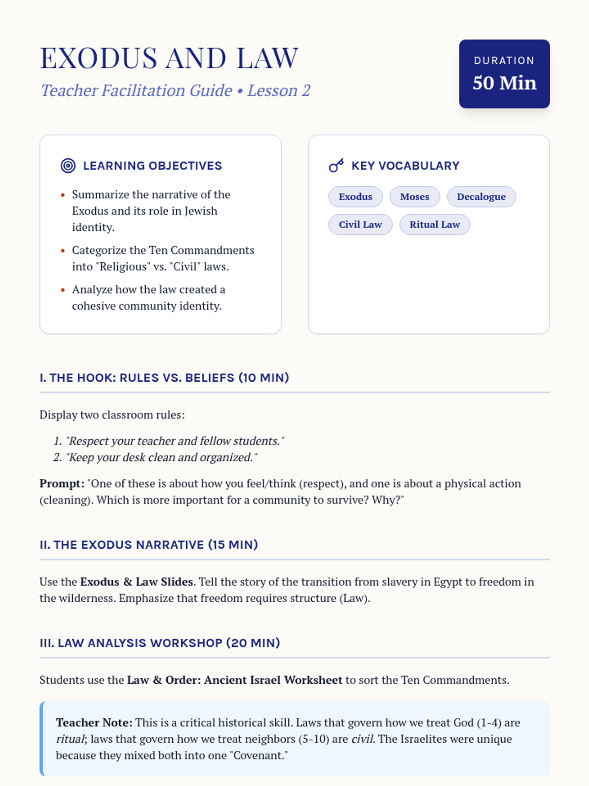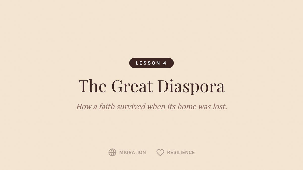 A comprehensive 5-lesson unit for 6th-grade students exploring the origins of Judaism, from the Covenant of Abraham through the Exodus and the Diaspora. Students examine ethical monotheism, the development of law, and the cultural resilience of the Jewish people through sacred texts and traditions.
