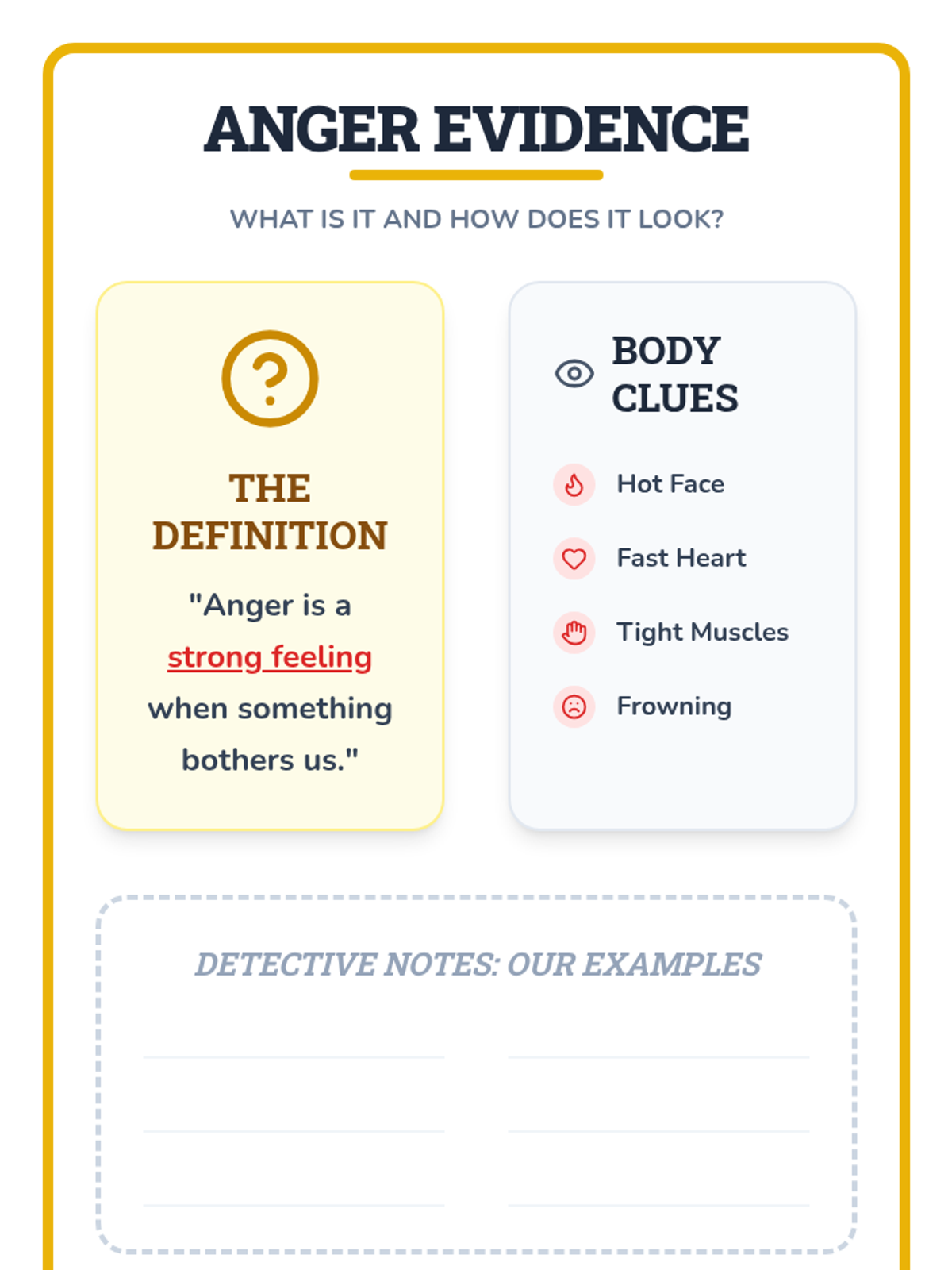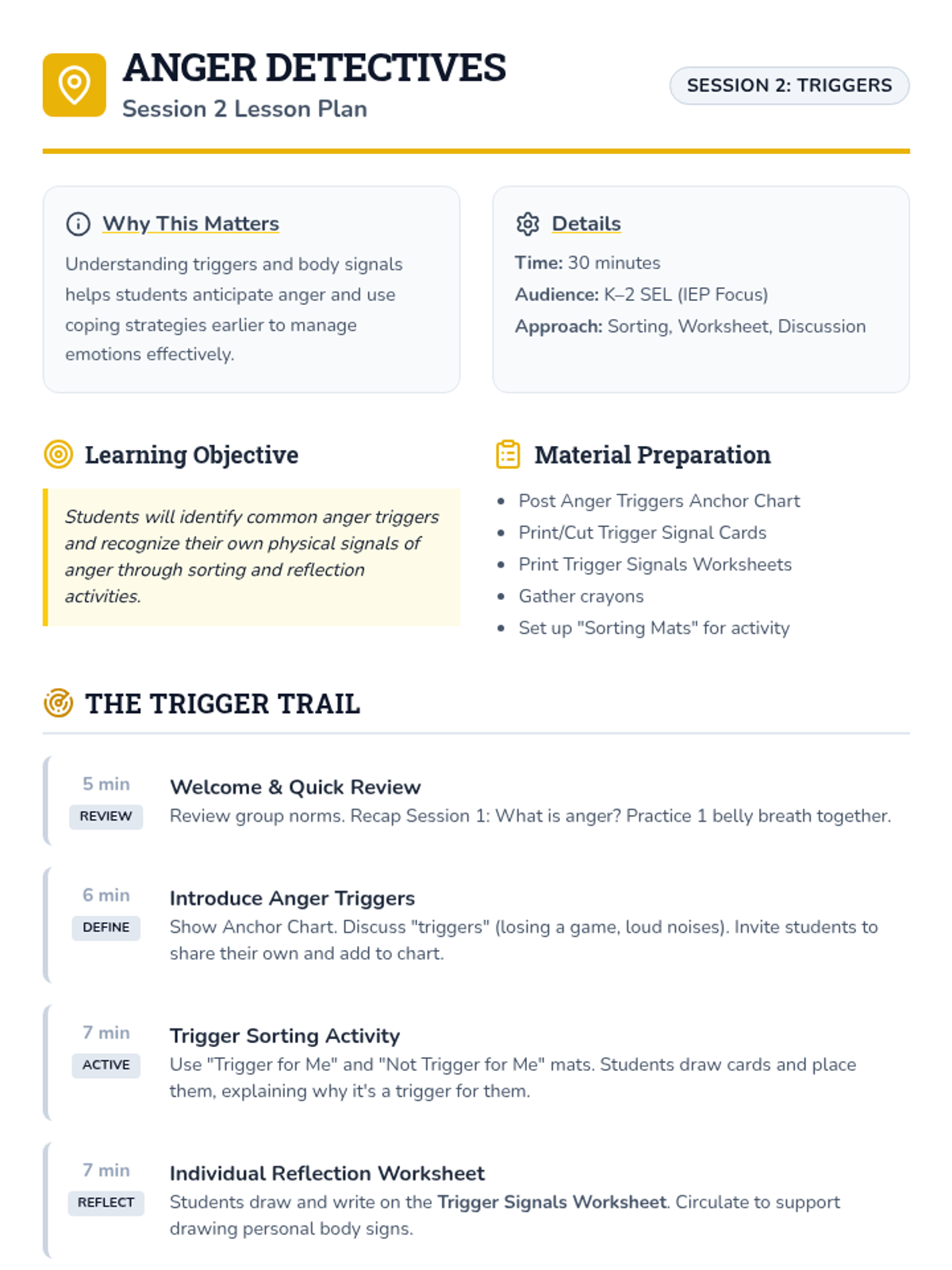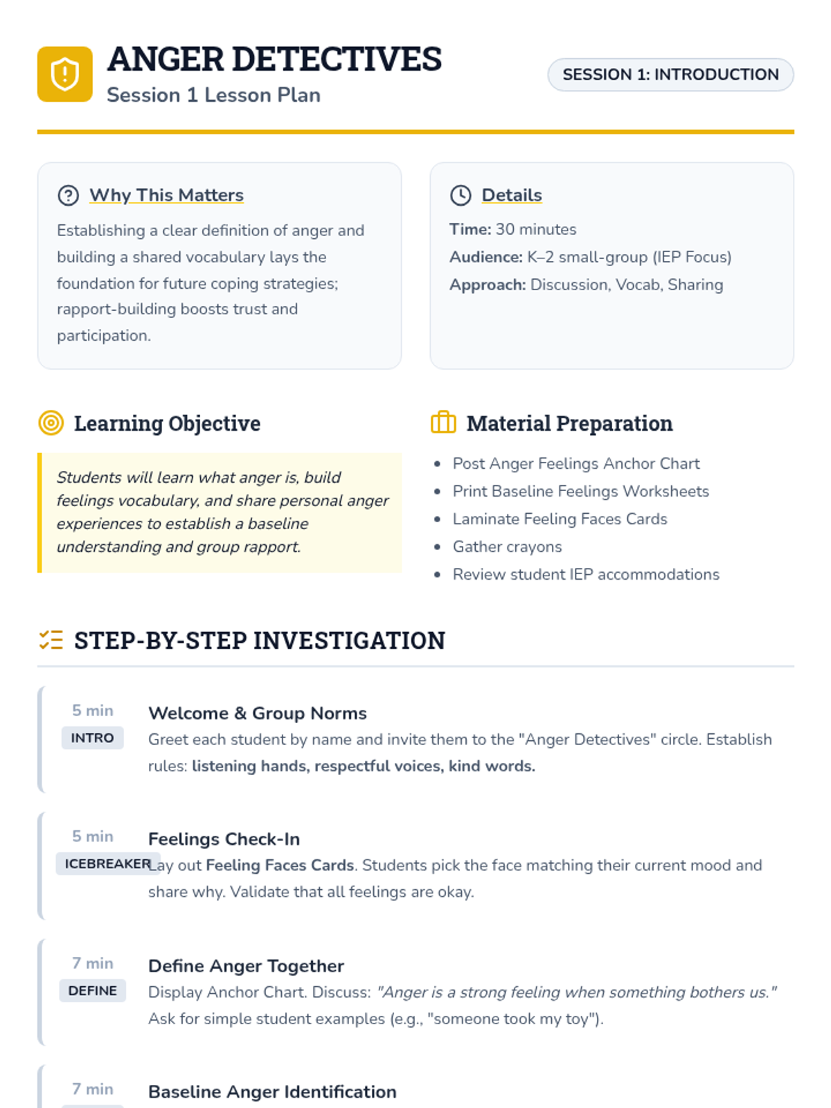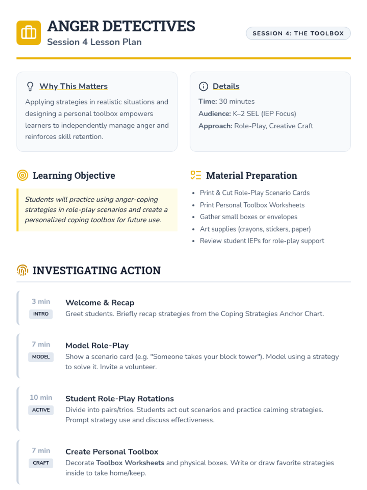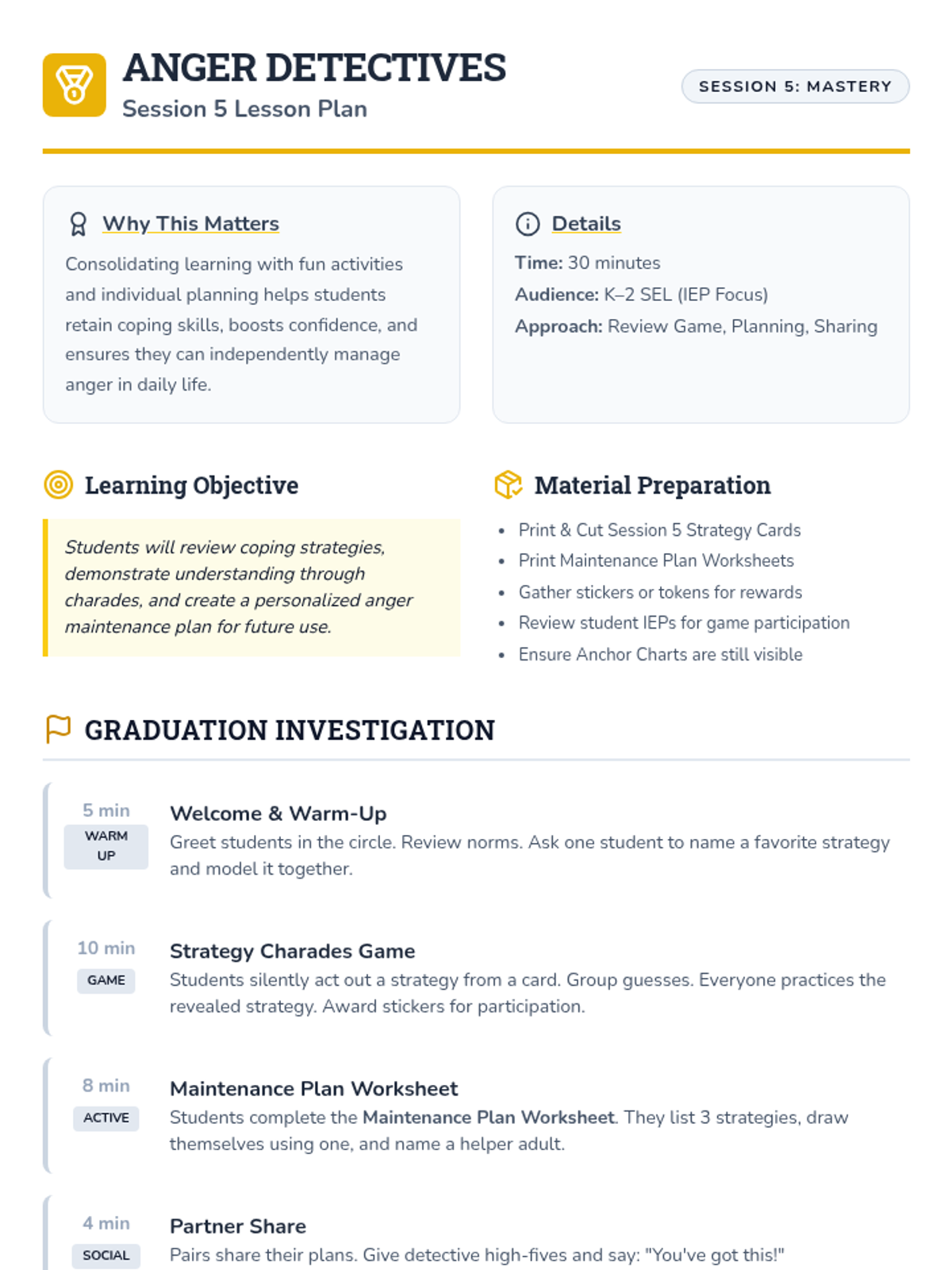 A 5-session small-group SEL sequence for K-2 students with IEPs to identify anger triggers, learn physical signs, and practice coping strategies through interactive detective-themed activities.