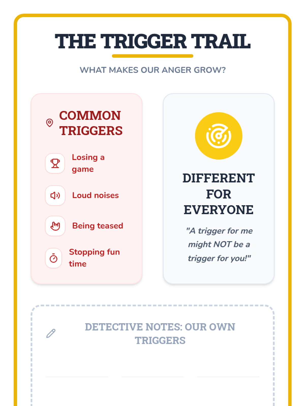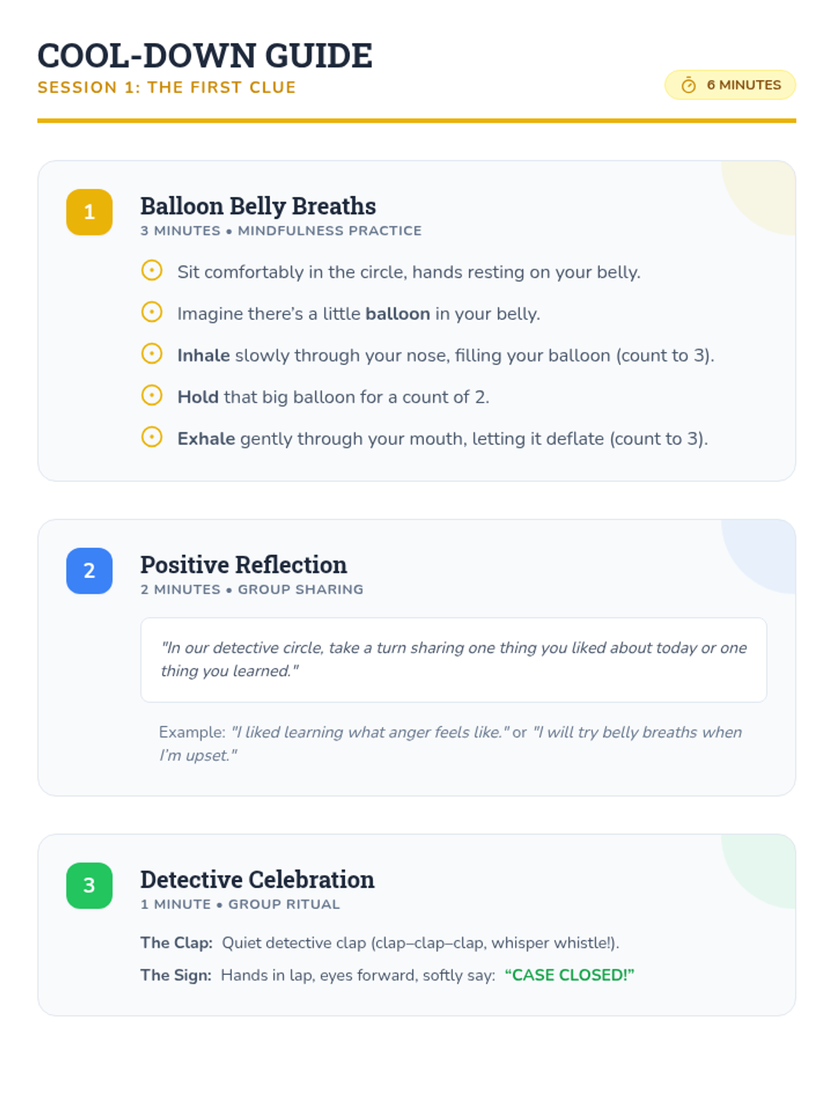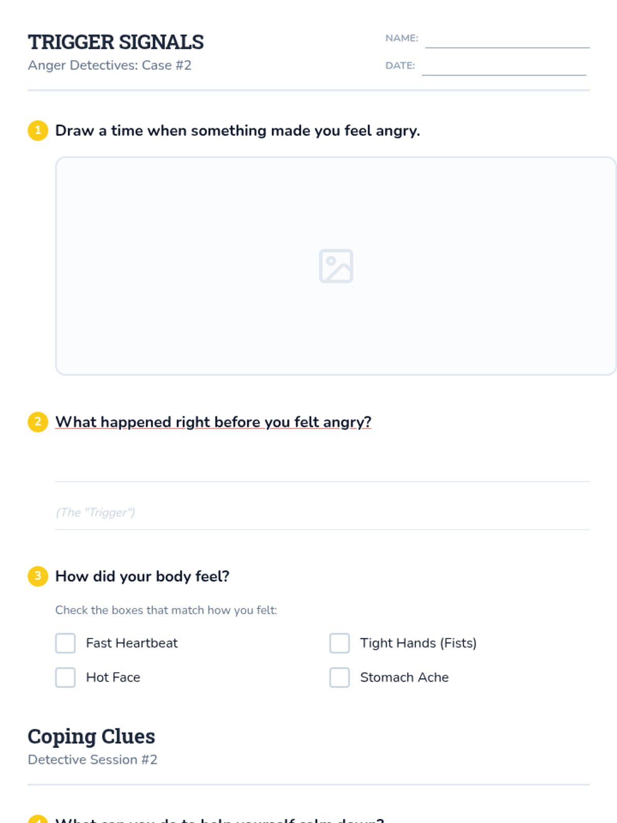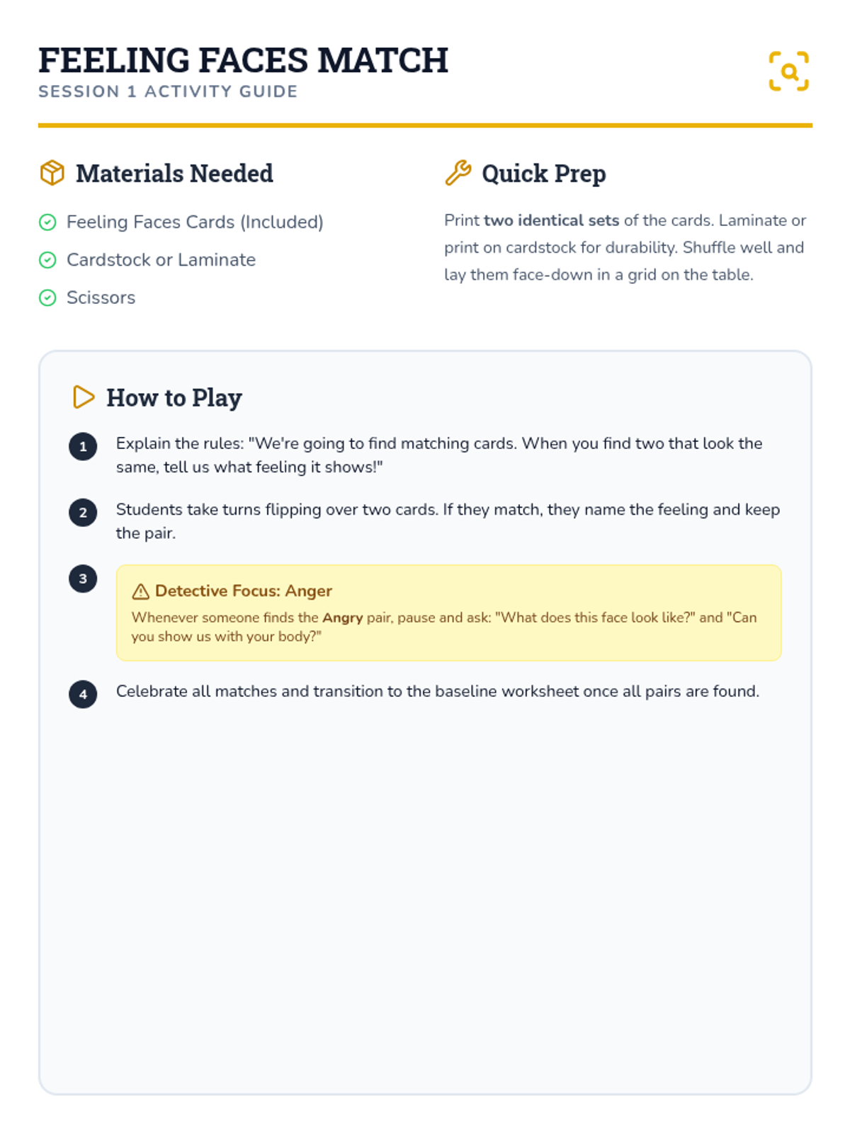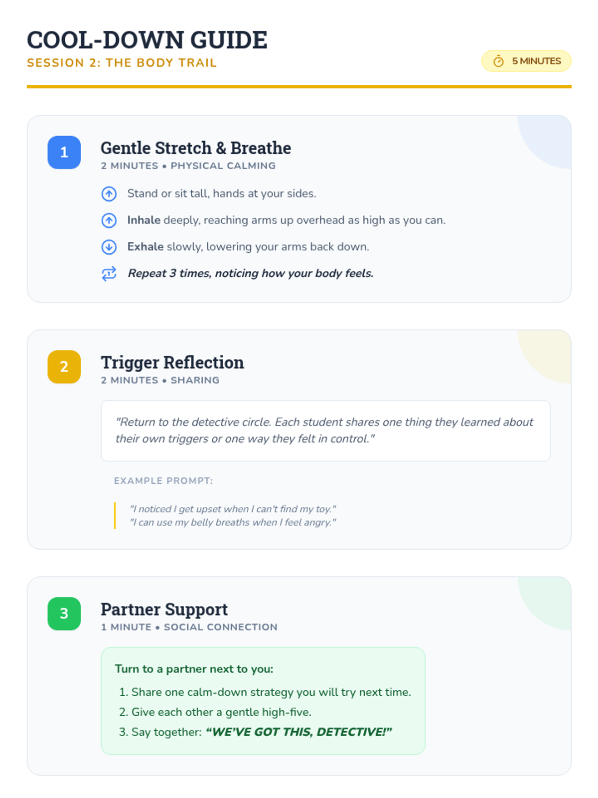 A 5-session small-group SEL sequence for K-2 students with IEPs to identify anger triggers, learn physical signs, and practice coping strategies through interactive detective-themed activities.
