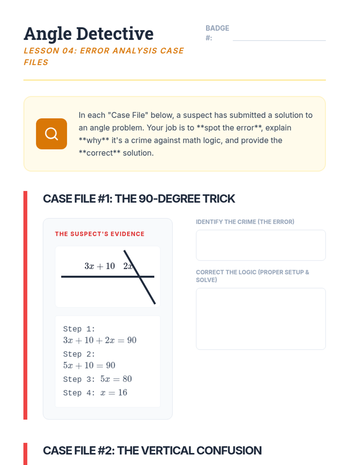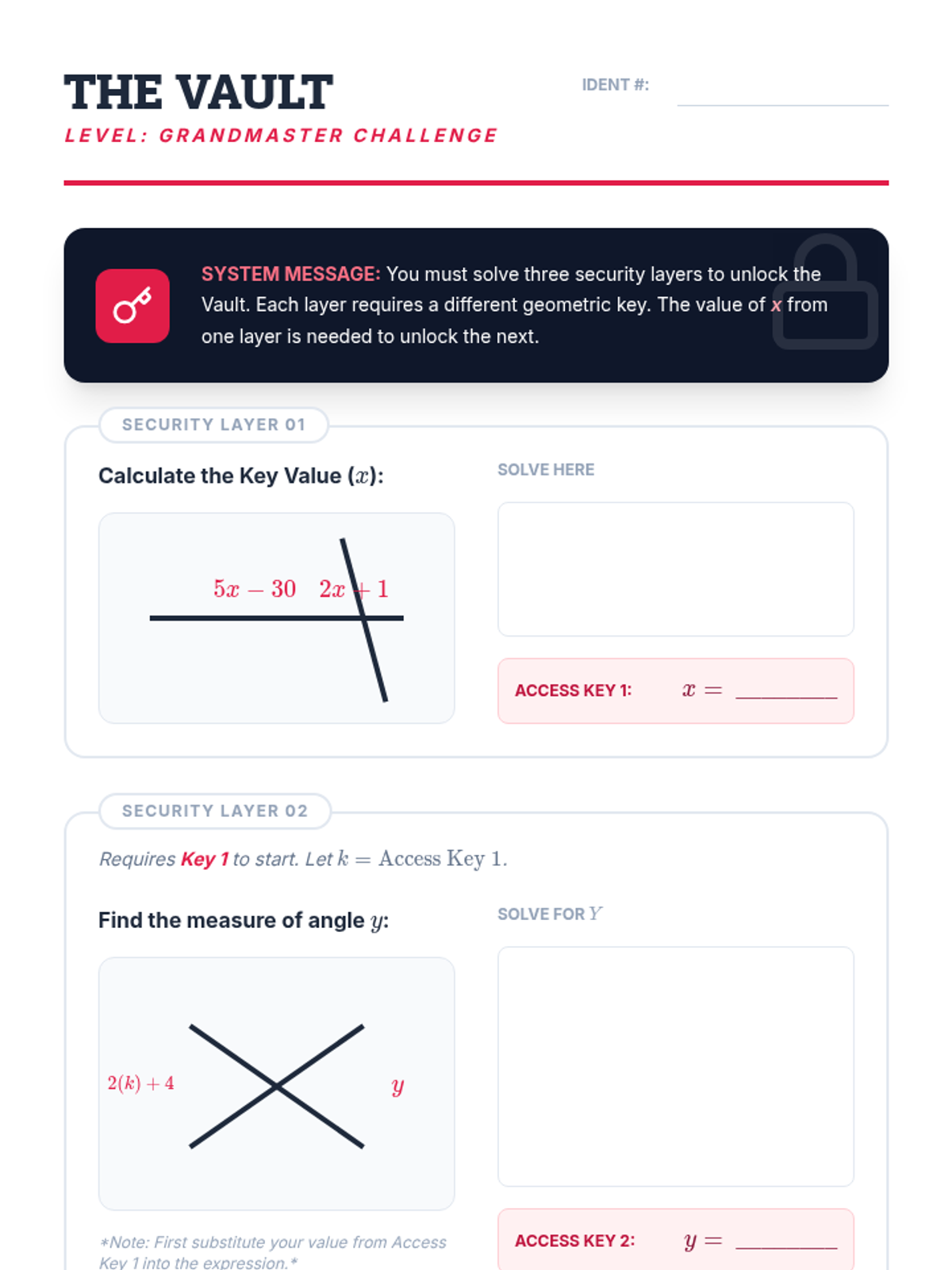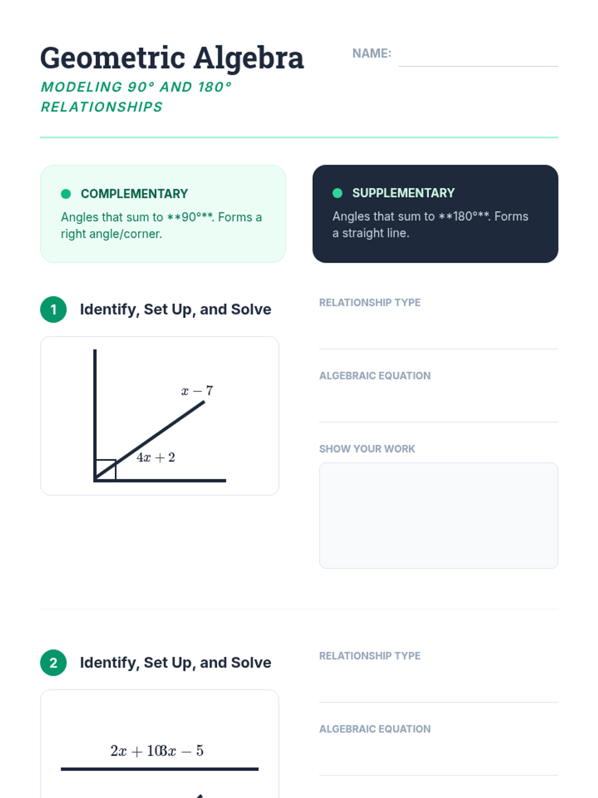 This 8th-grade sequence bridges the gap between geometry and algebra by using angle relationships to build and solve linear equations. Students progress from basic measurement to solving complex multi-step geometric puzzles involving unknown variables.
