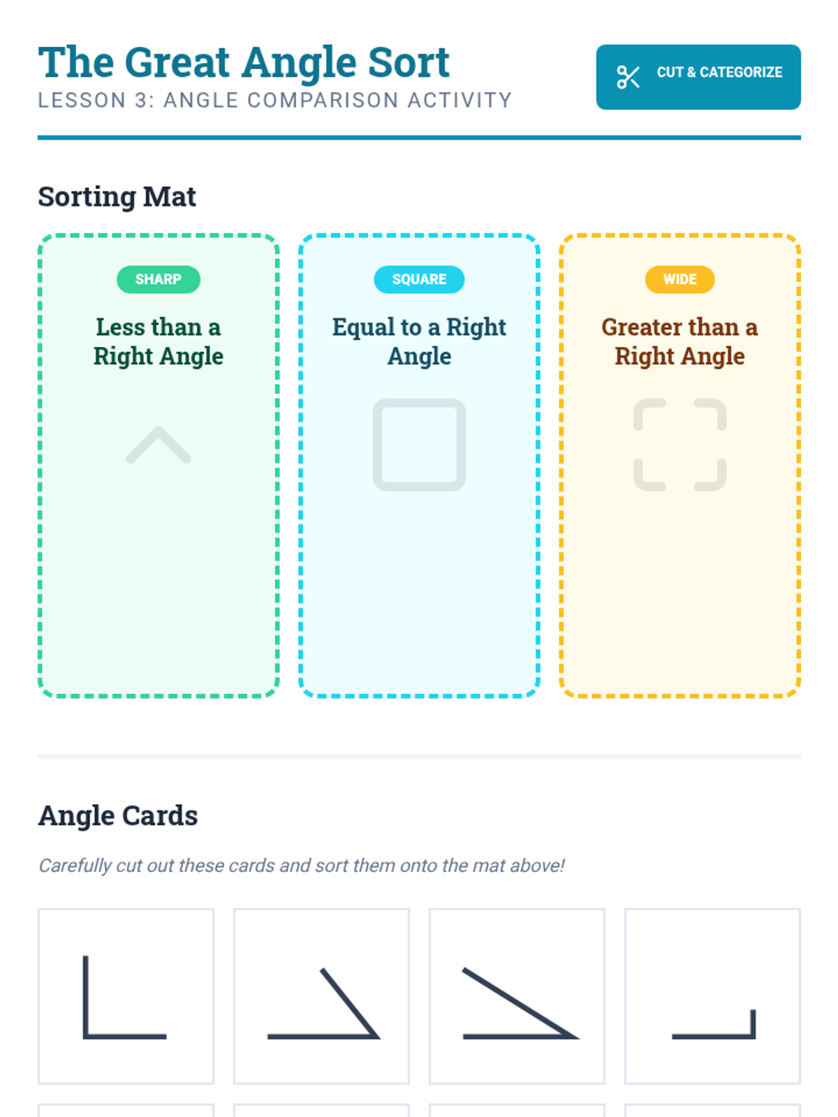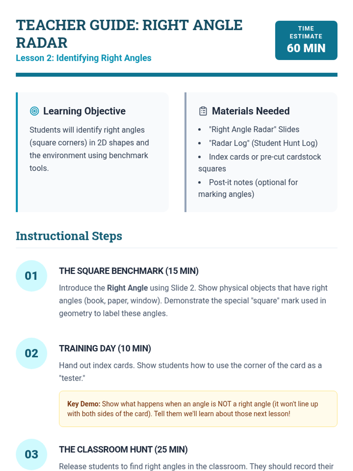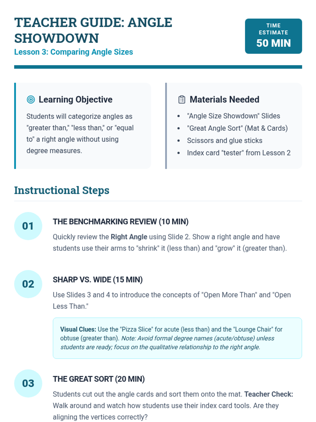A 3rd-grade geometry sequence exploring angles as geometric attributes, identifying right angles, and using angle properties to classify polygons and quadrilaterals.