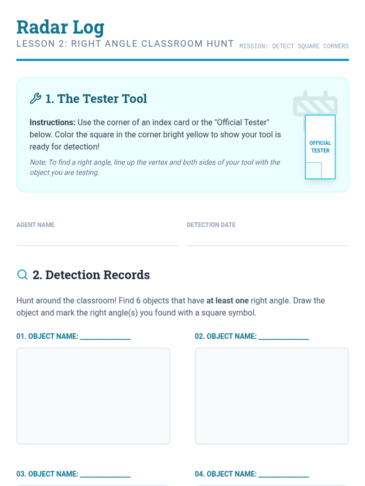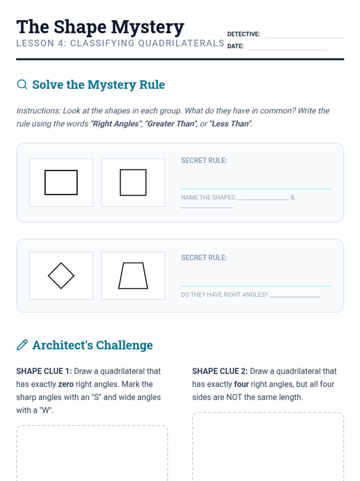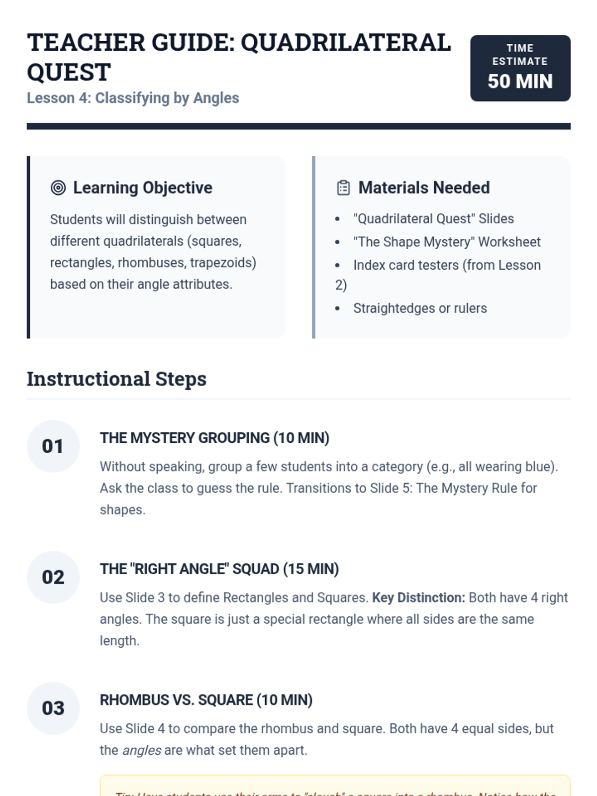 A 3rd-grade geometry sequence exploring angles as geometric attributes, identifying right angles, and using angle properties to classify polygons and quadrilaterals.