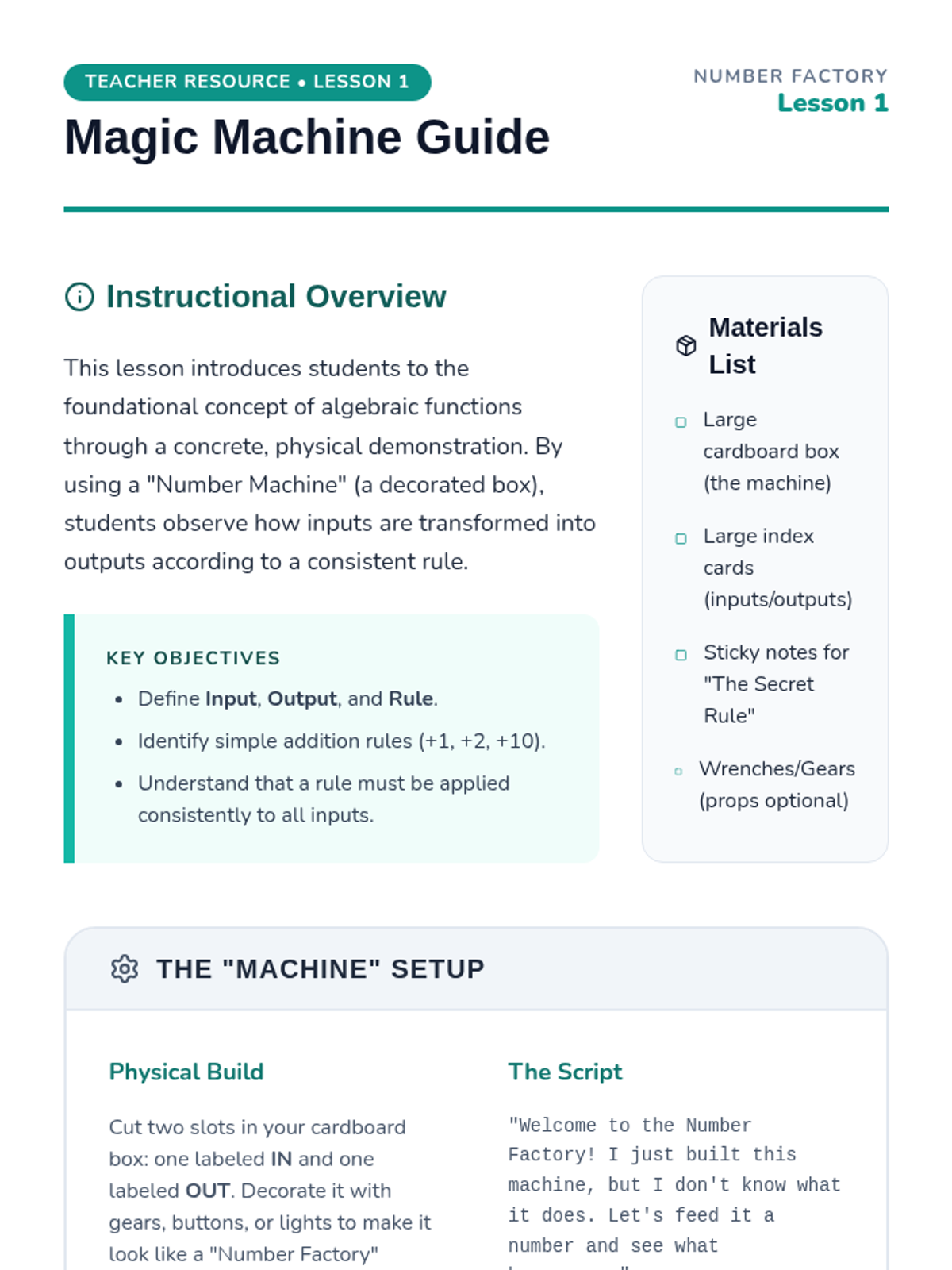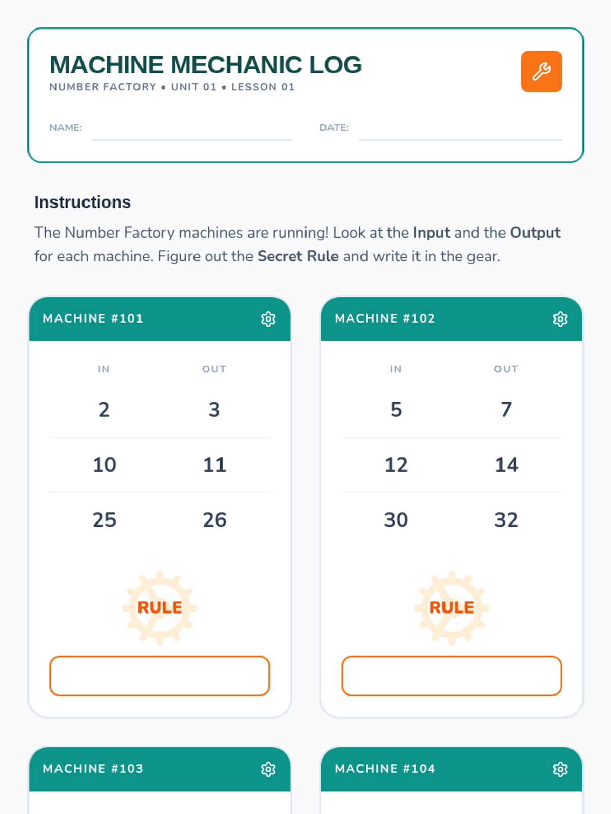 A 2nd-grade sequence introducing algebraic thinking through 'math machines' and input-output tables. Students explore addition and subtraction rules, organize data in T-charts, and predict future values using quantitative relationships.