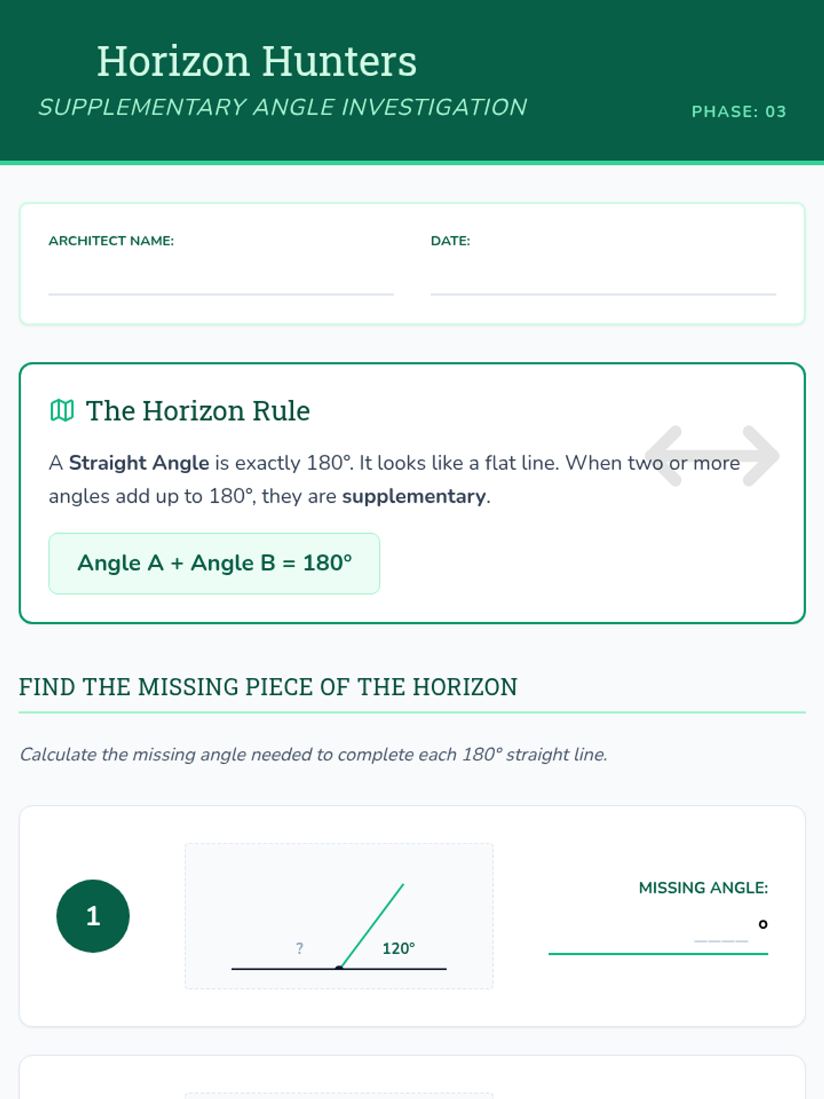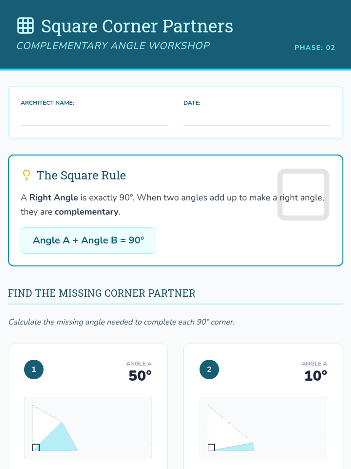 A 5-lesson unit for 3rd graders exploring the additive nature of angles. Students learn to combine smaller angles to form right angles (90 degrees) and straight lines (180 degrees) through visual puzzles and design challenges.