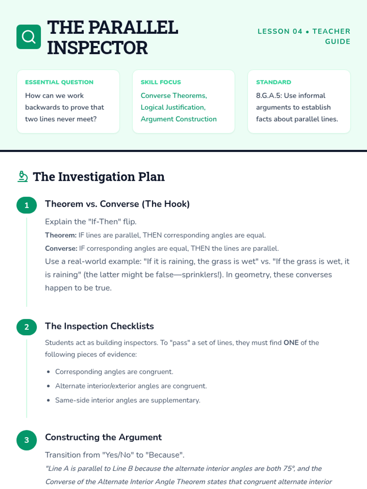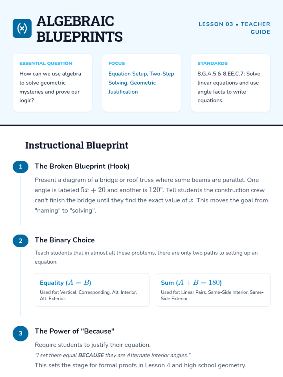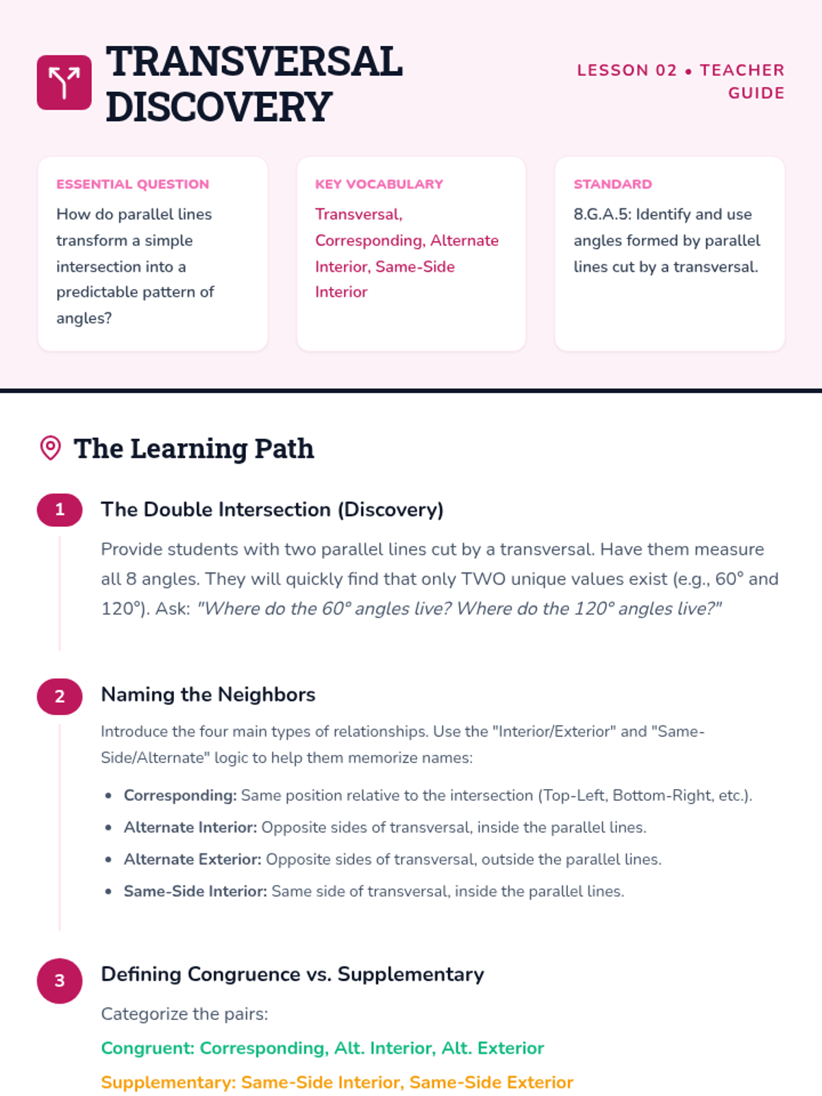 This sequence guides 8th-grade students through the logical discovery and formal proof of angle relationships formed by parallel lines and transversals. Students move from basic angle pairs to complex geometric modeling and algebraic proofs.