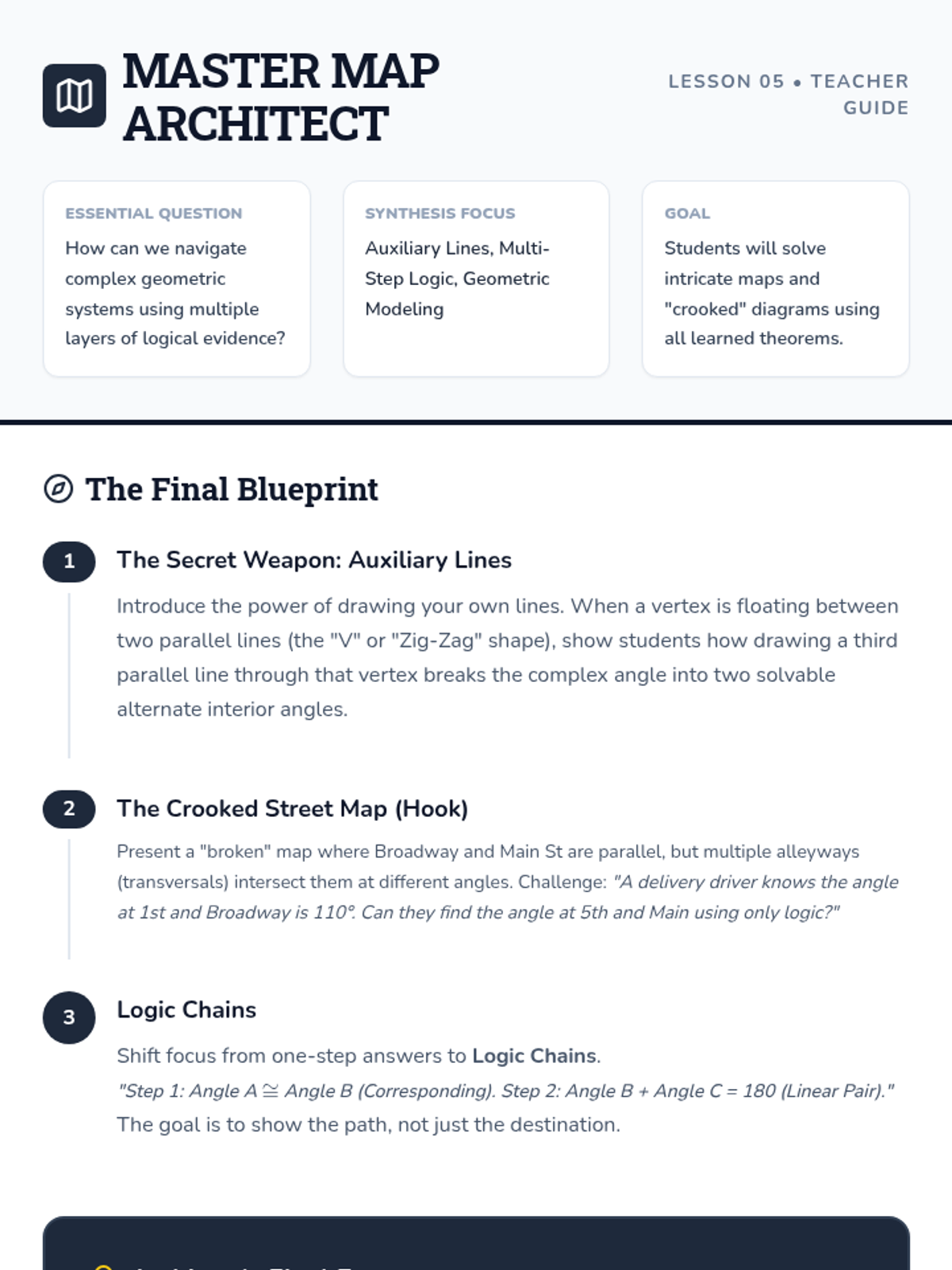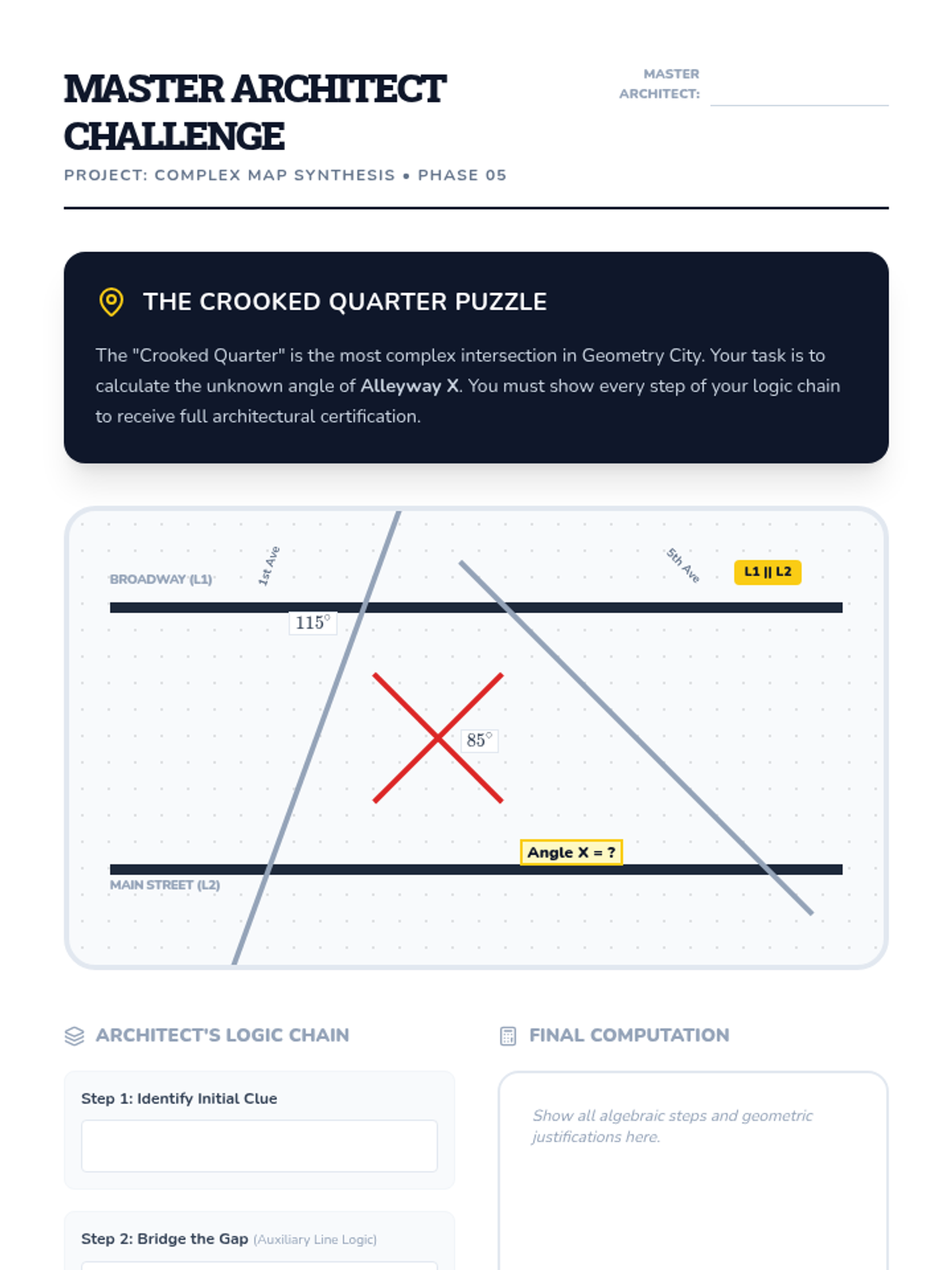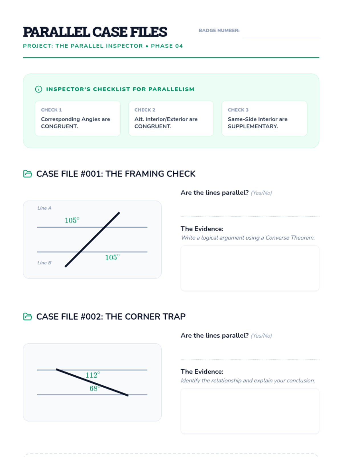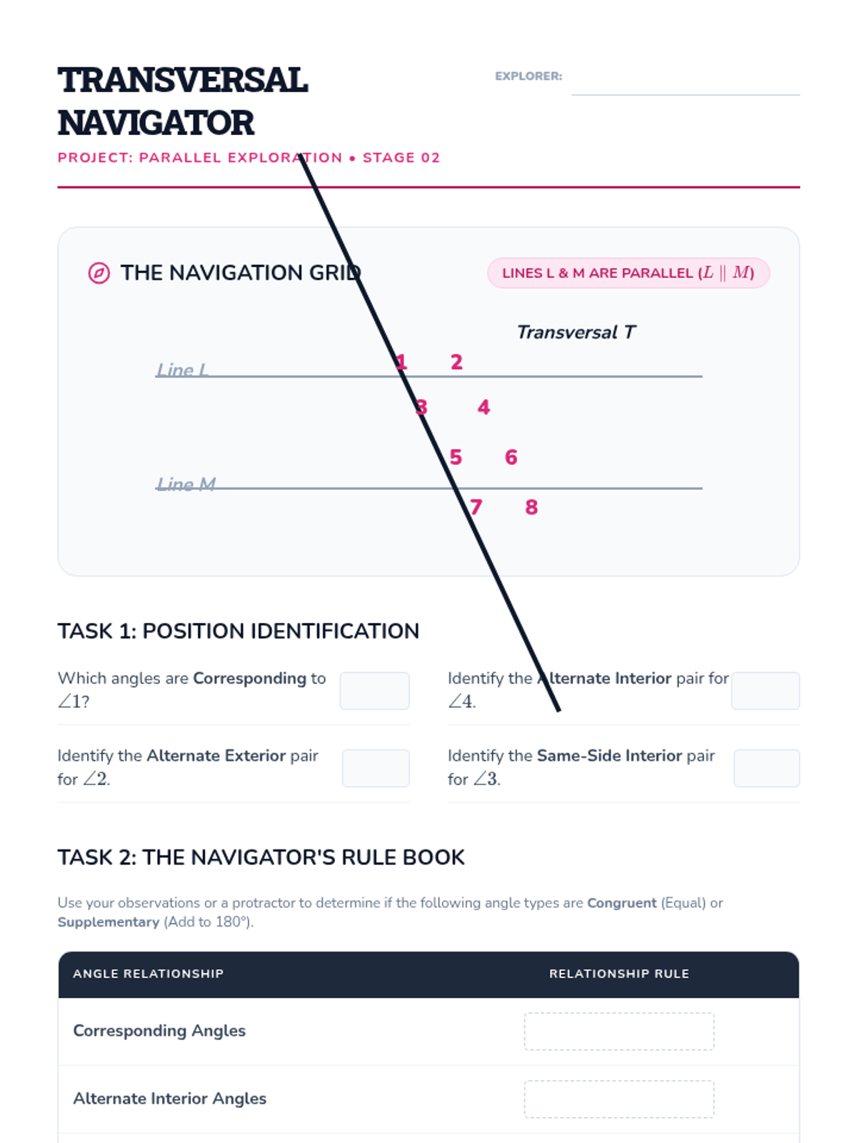 This sequence guides 8th-grade students through the logical discovery and formal proof of angle relationships formed by parallel lines and transversals. Students move from basic angle pairs to complex geometric modeling and algebraic proofs.