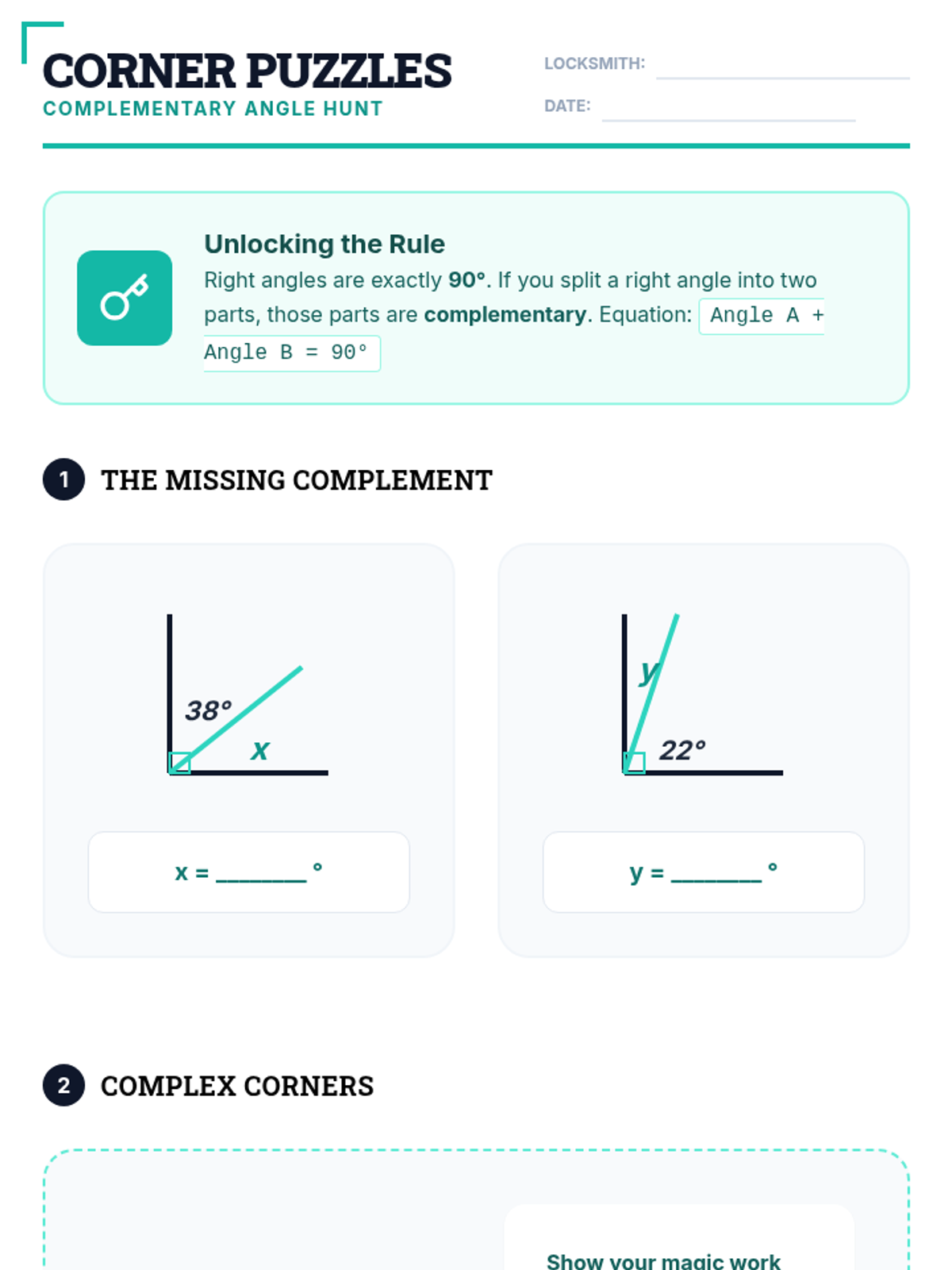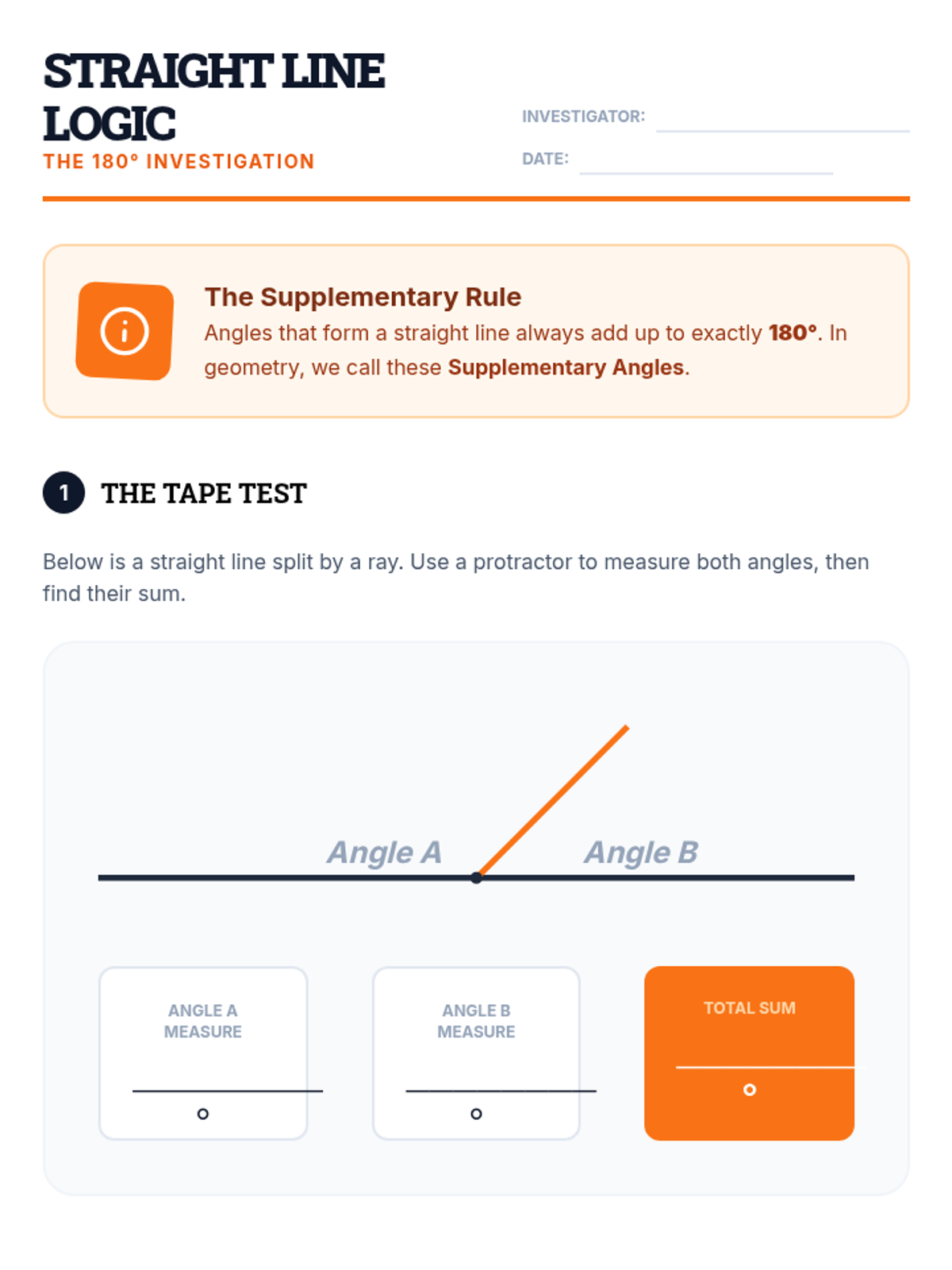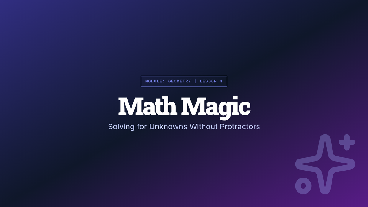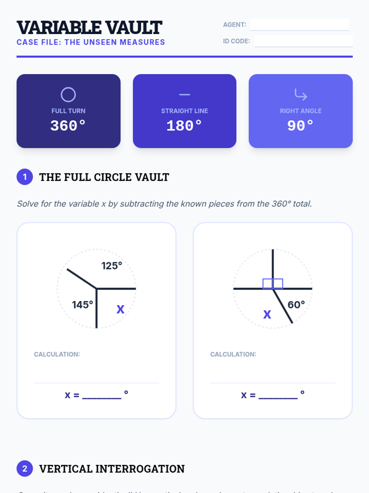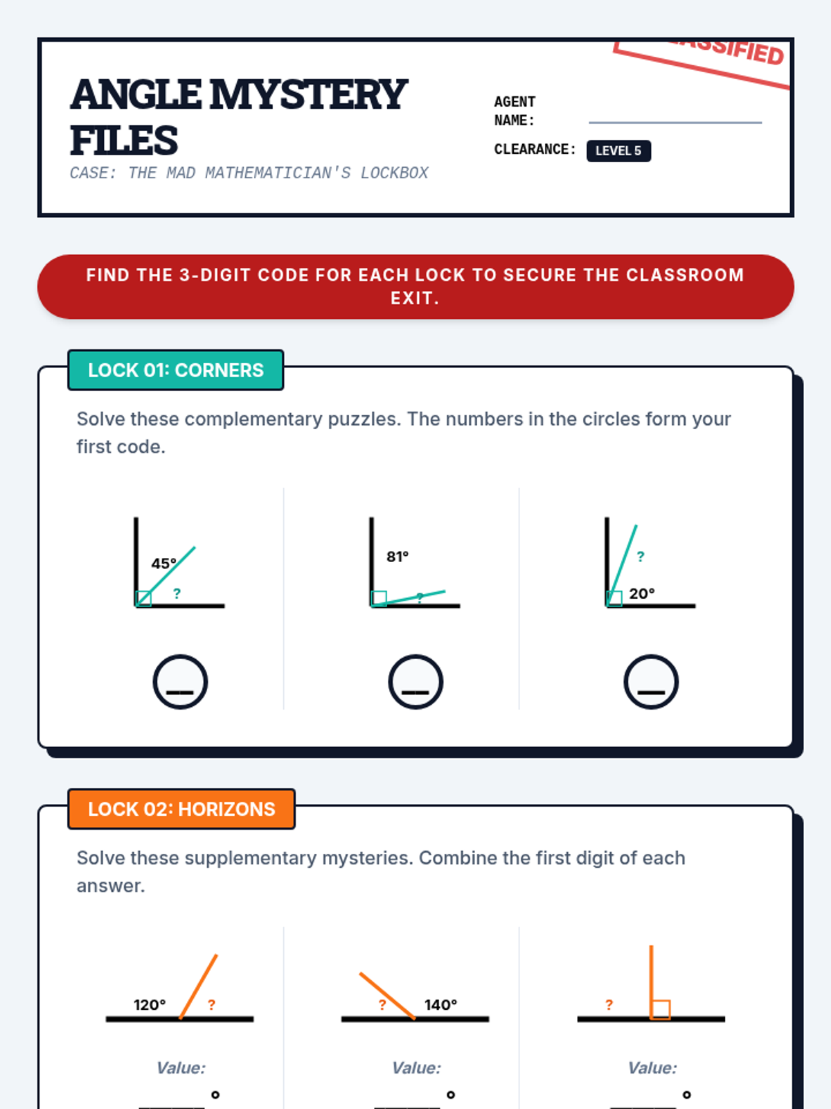 A 5th-grade geometry sequence exploring the additive nature of angles, straight angles, complementary relationships, and solving for unknown angles through logic and deduction. Students move from concrete measurement to abstract calculation in a mystery-solving context.