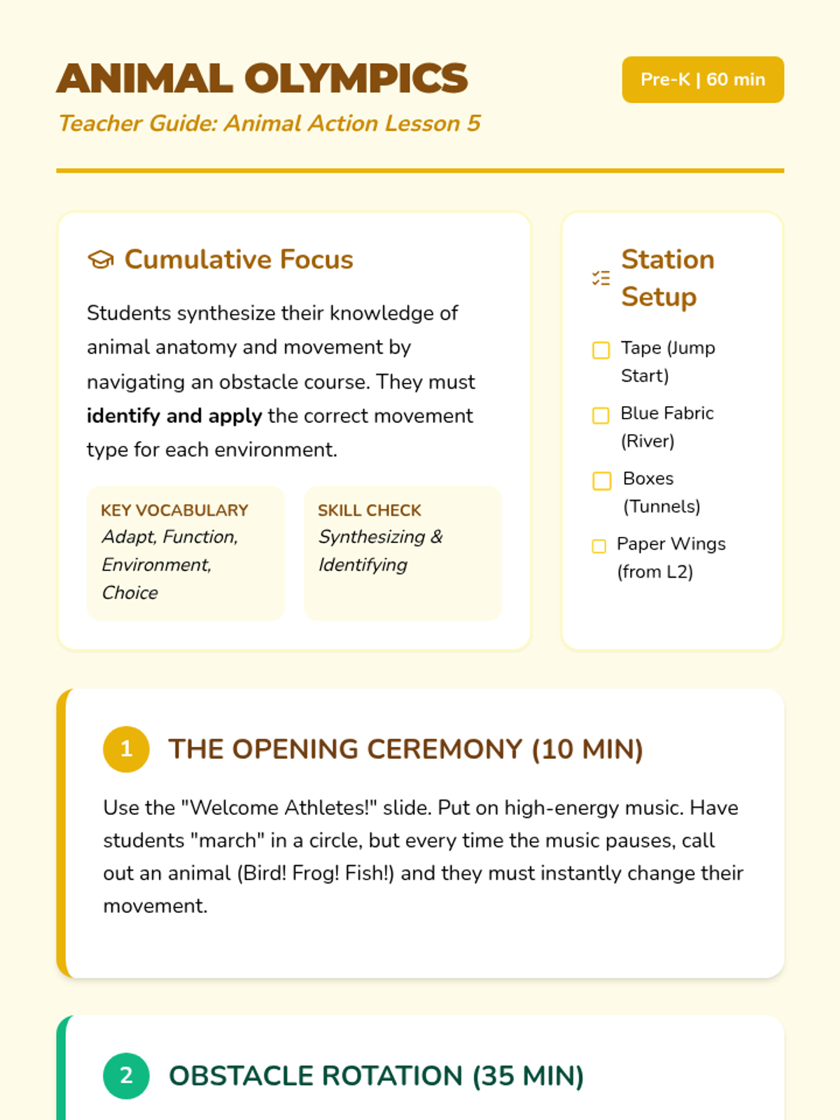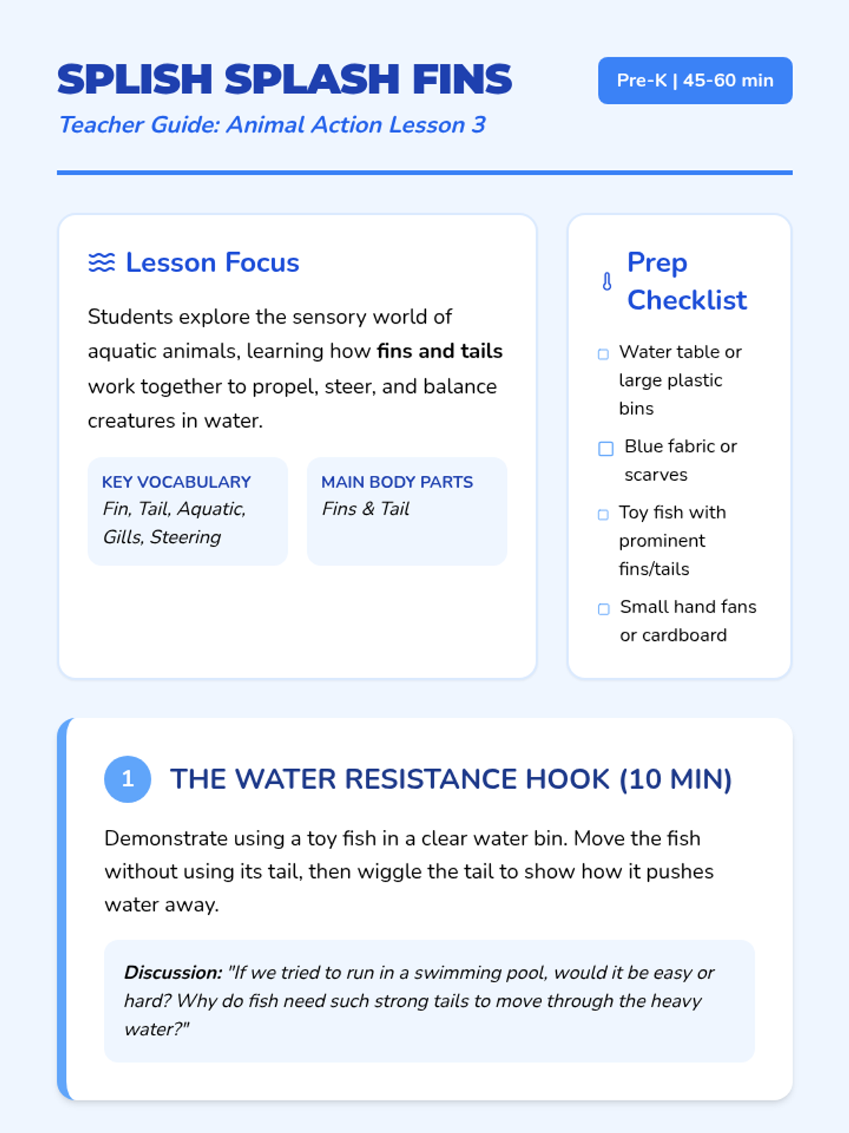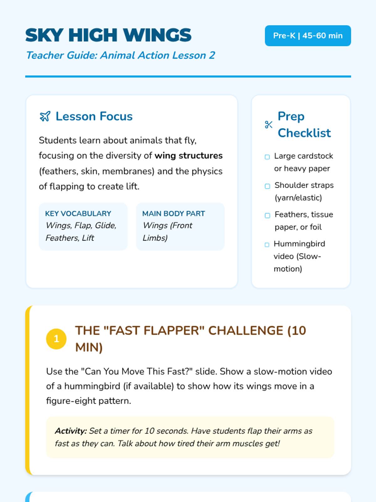A movement-based exploration of animal anatomy for Pre-K students, focusing on how body parts like legs, wings, and fins enable different types of motion. Students will engage in role-play, sensory activities, and a final 'Olympics' to demonstrate their understanding of animal movements.